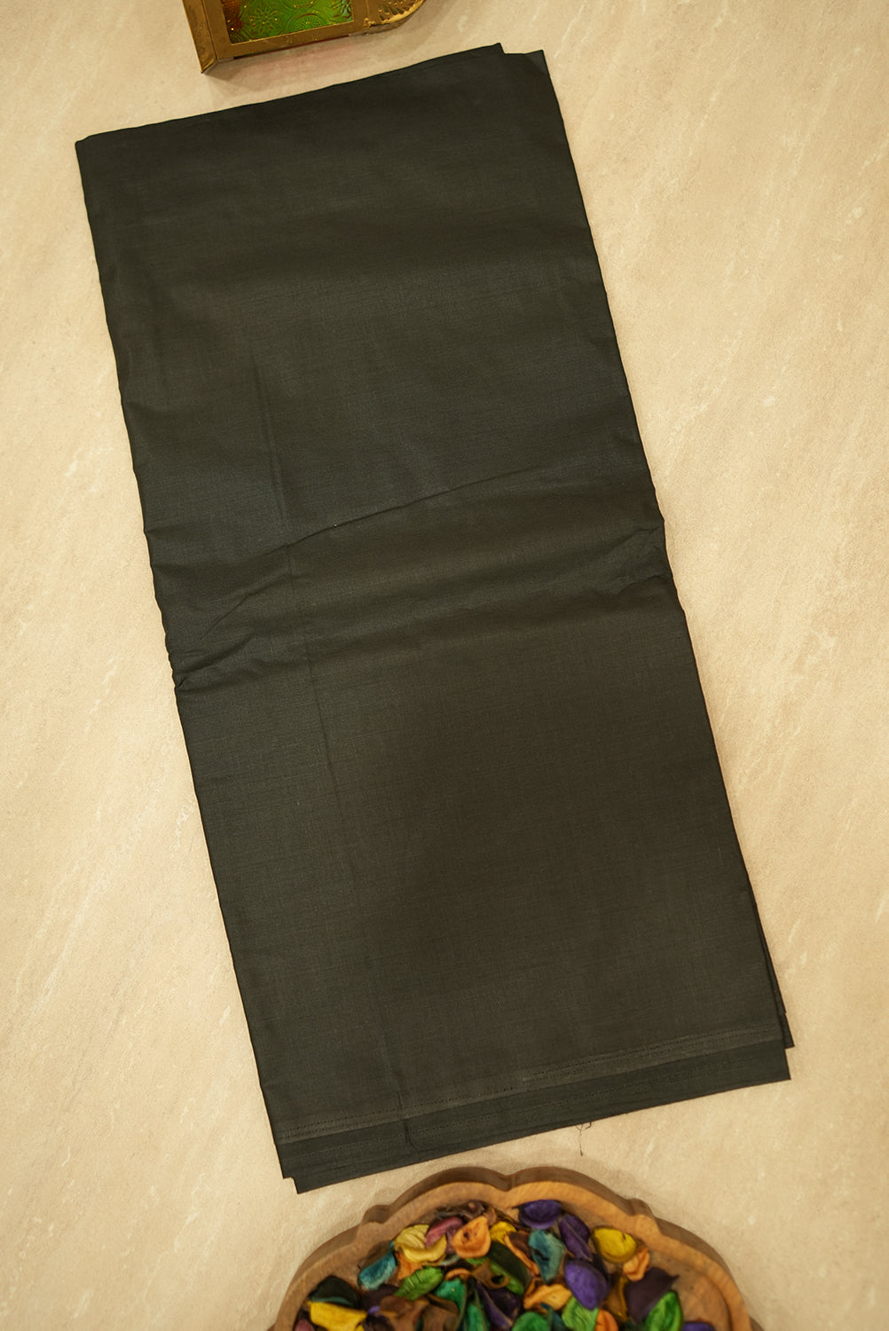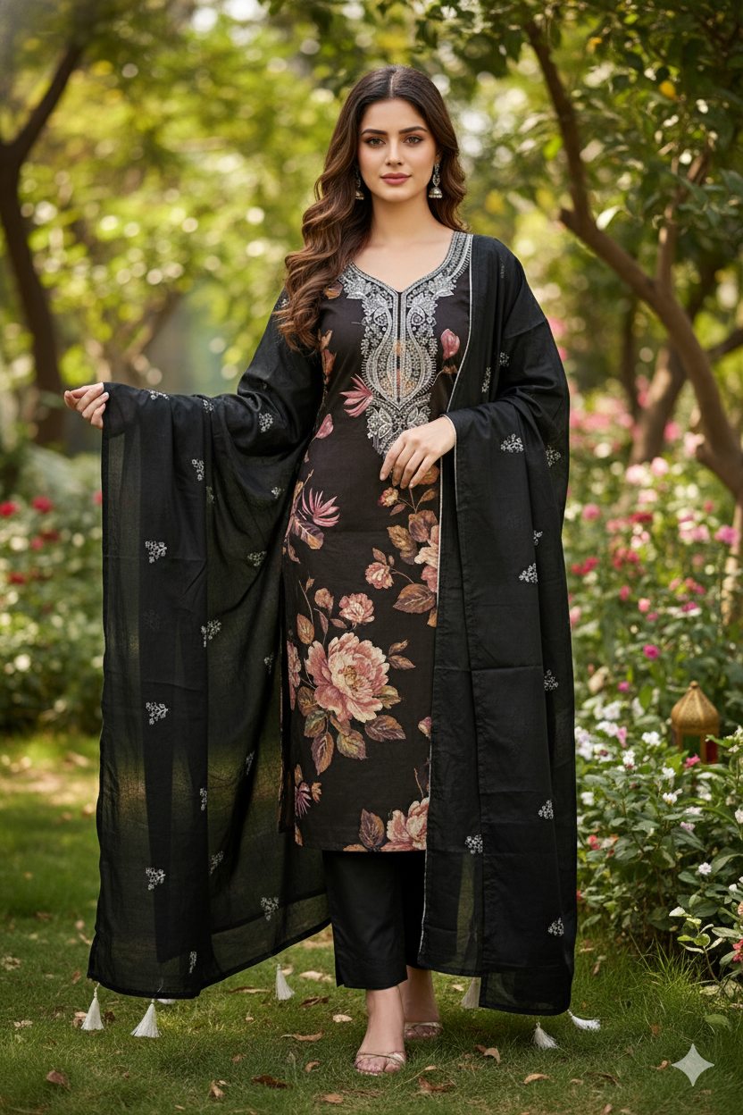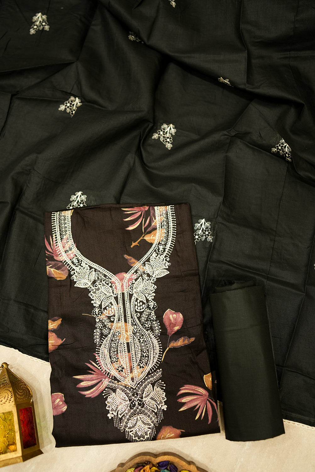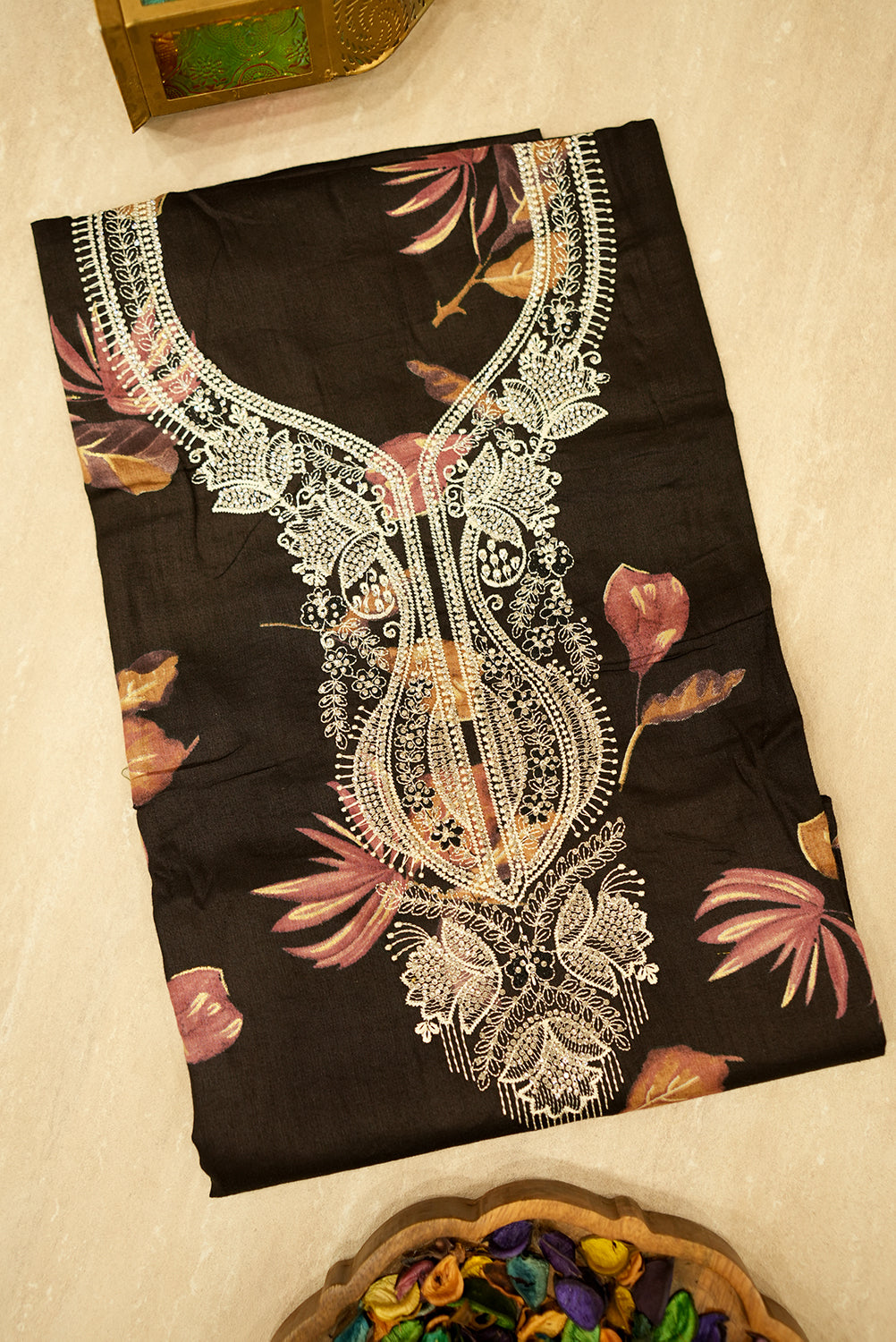This unstitched three-piece salwar suit set offers a bold yet elegant style. The dark brown kurta (top) features an ornate, intricately embroidered neckline in shades of white and pink. A delicate floral print in earthy tones accents the front and sleeves. The set includes a matching solid black salwar (pant) and a black dupatta (scarf) with scattered embroidered motifs, adding a touch of subtle shimmer. This rich and chic ensemble is perfect for an evening out or a special occasion.