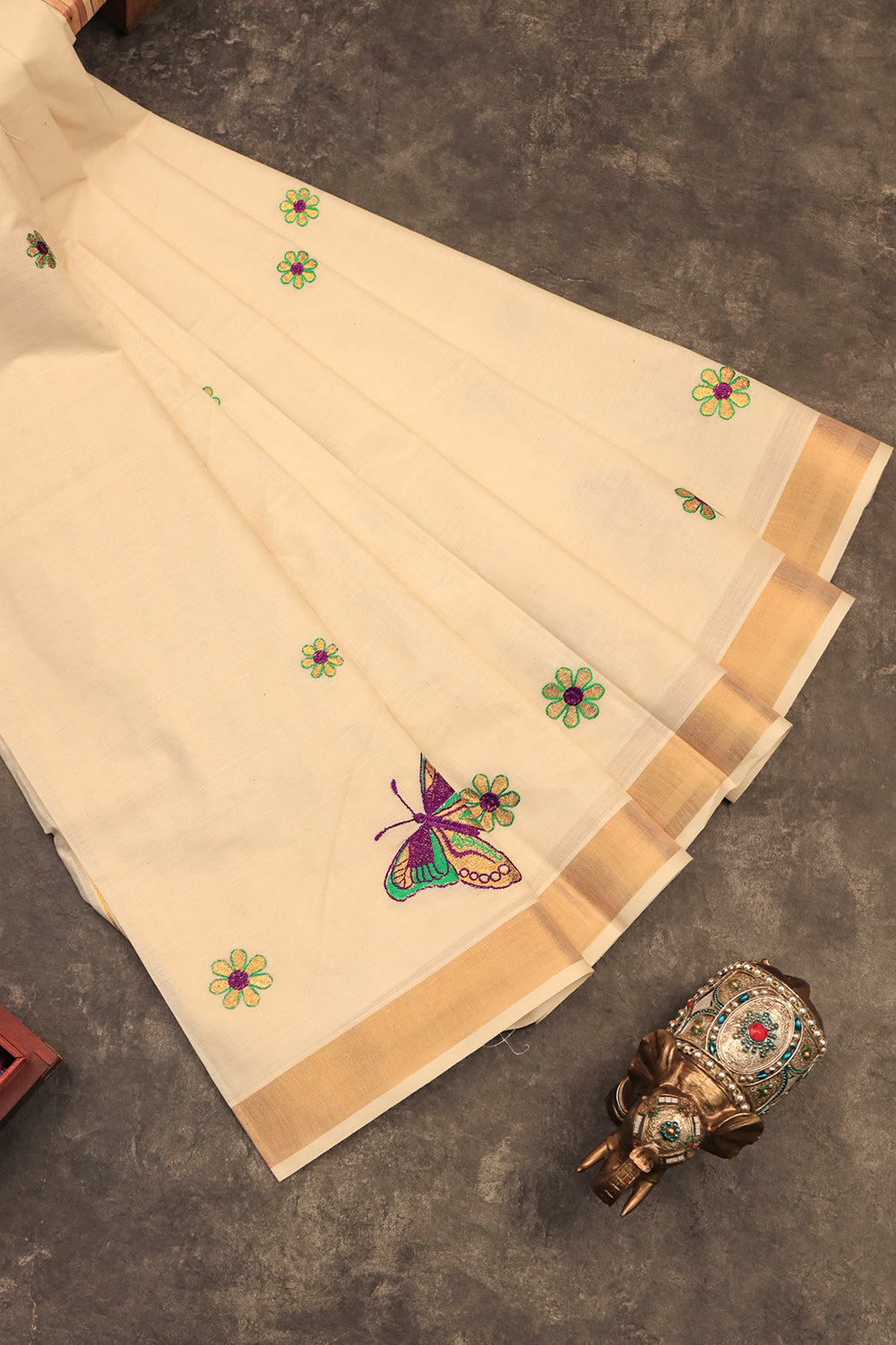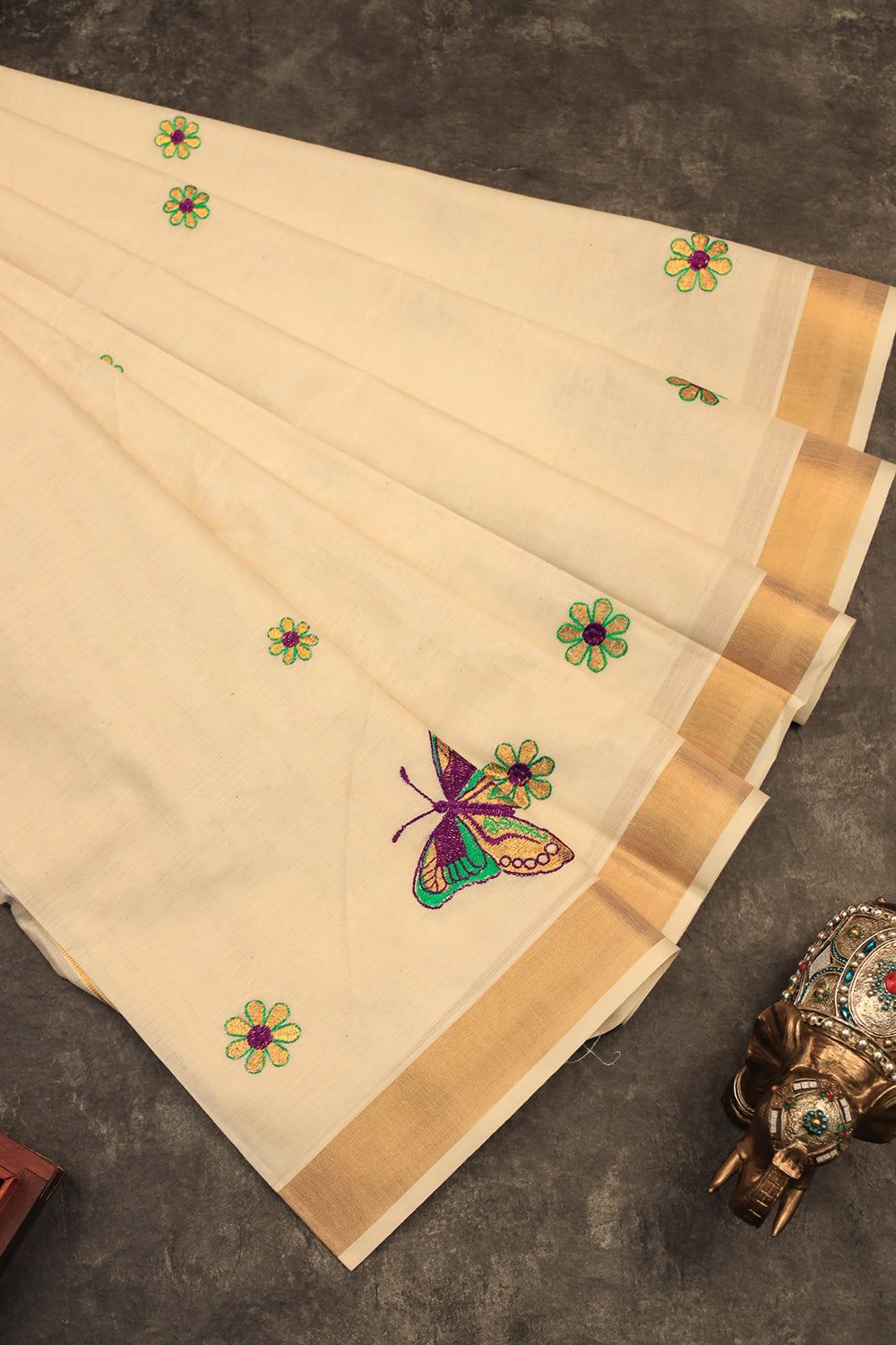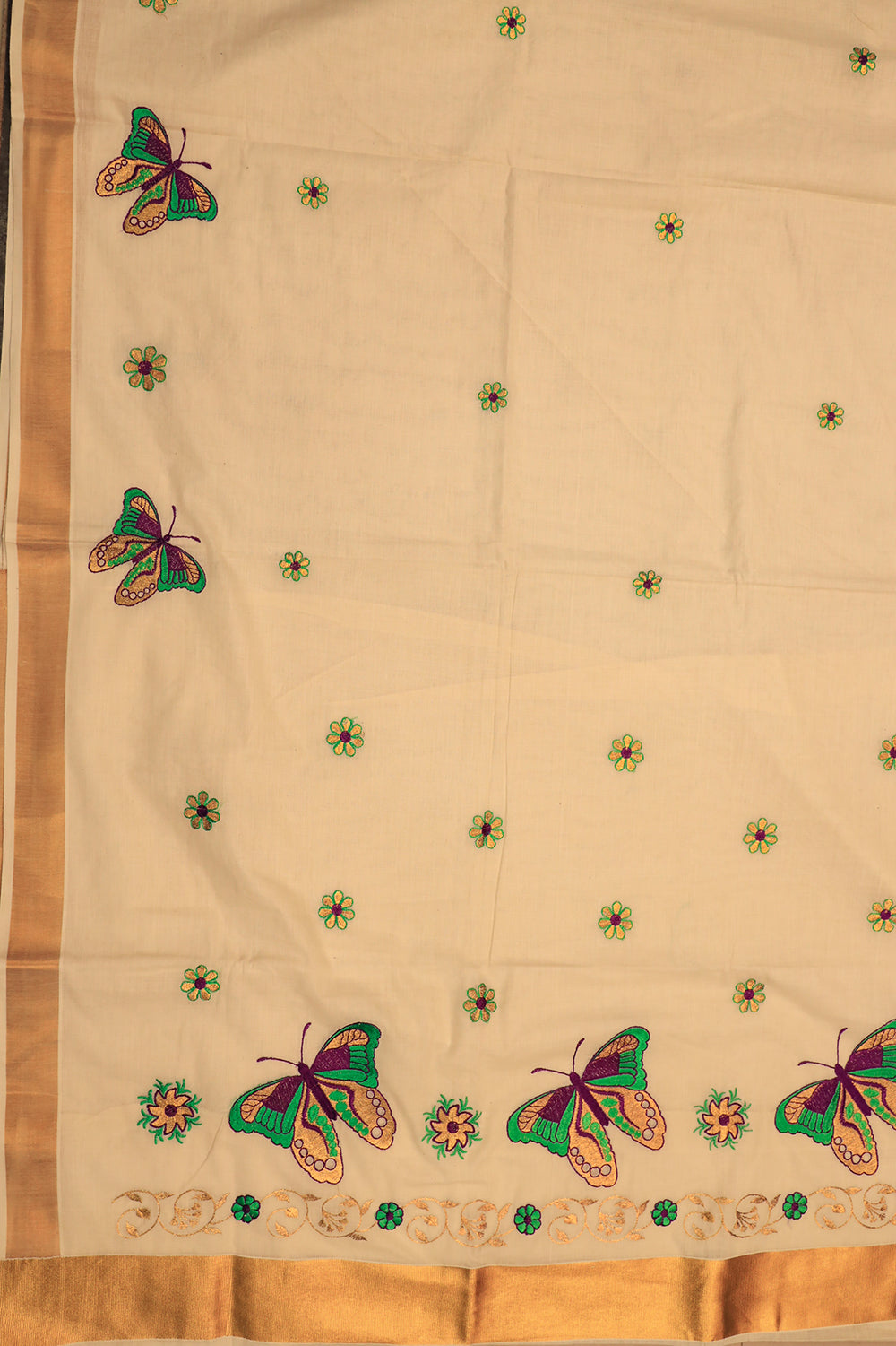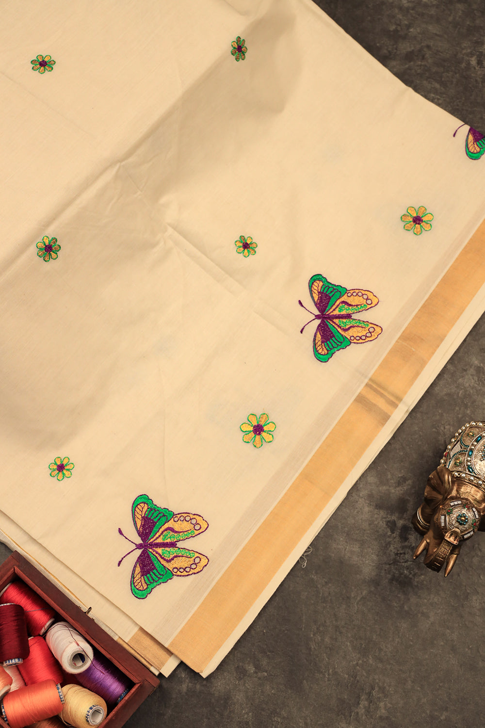 A serene cream Kerala cotton saree, accented with a golden zari border and delicate hand-painted butterfly and floral motifs in shades of green, purple, and yellow. Without Blouse .