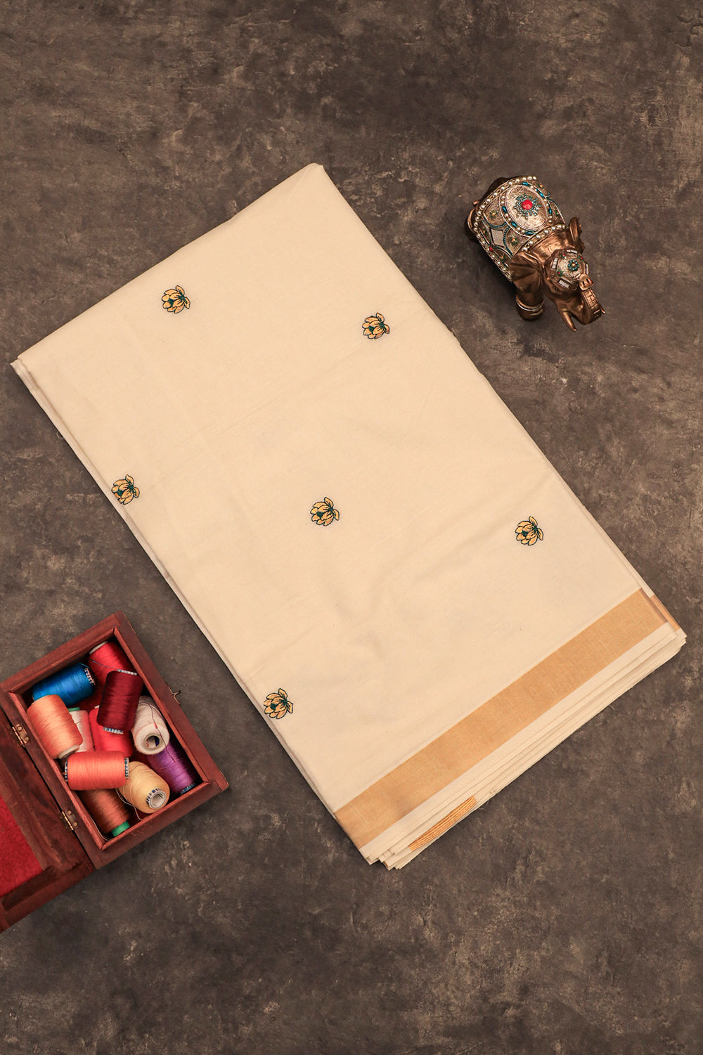 Cream Kerala Cotton Saree with Butterfly Motifs