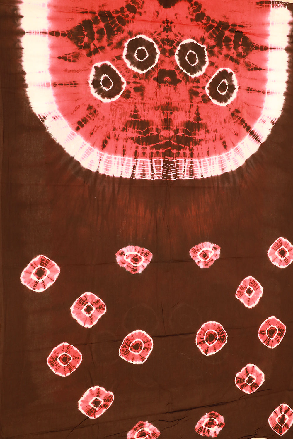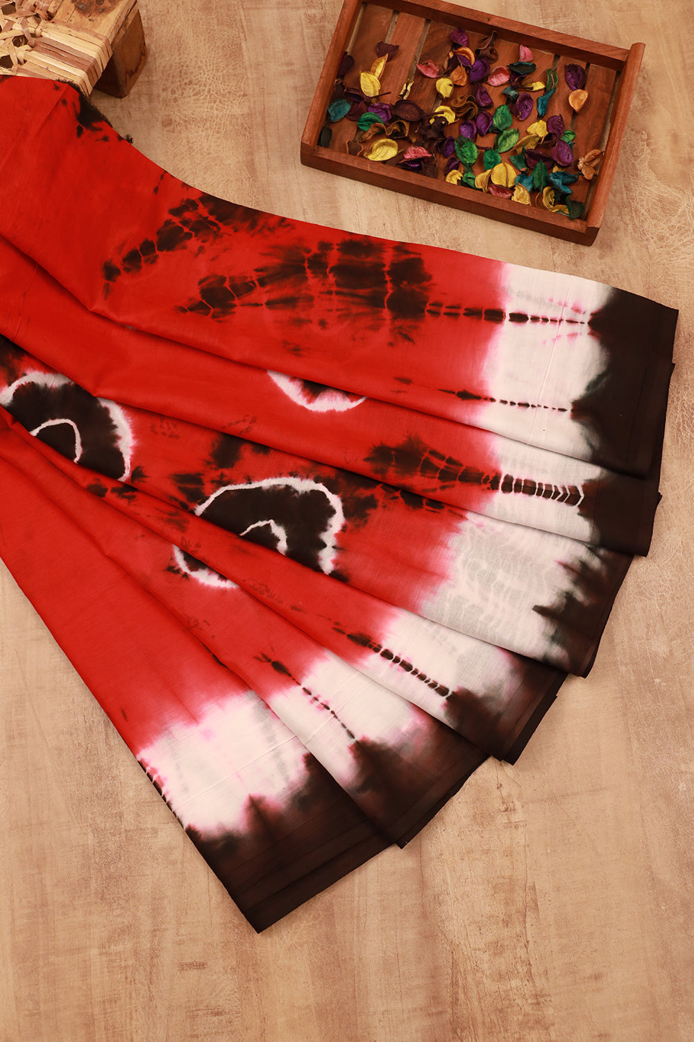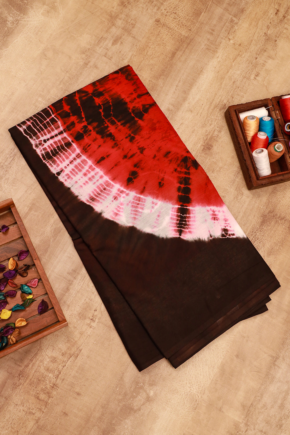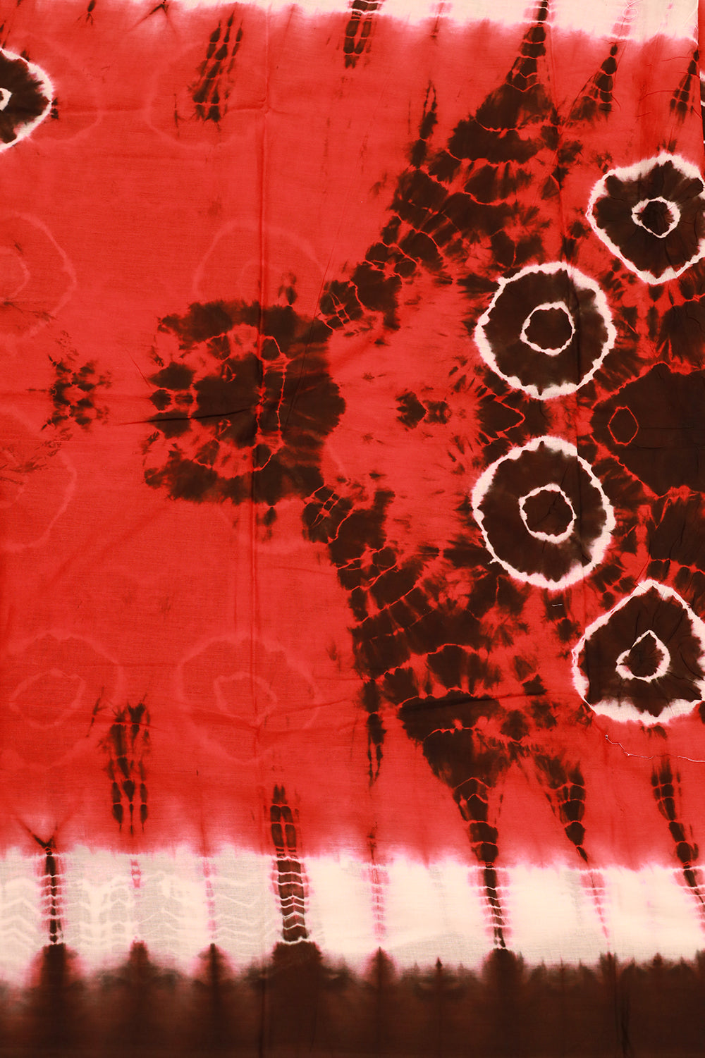 Embrace vibrant artistry with this stunning cotton saree showcasing a dynamic tie-dye pattern. The rich crimson base is beautifully contrasted with bold black and crisp white accents, creating a striking visual appeal. Perfect for adding a touch of bohemian flair to your wardrobe, this lightweight saree is ideal for both casual and festive occasions. Unstitched blouse attached