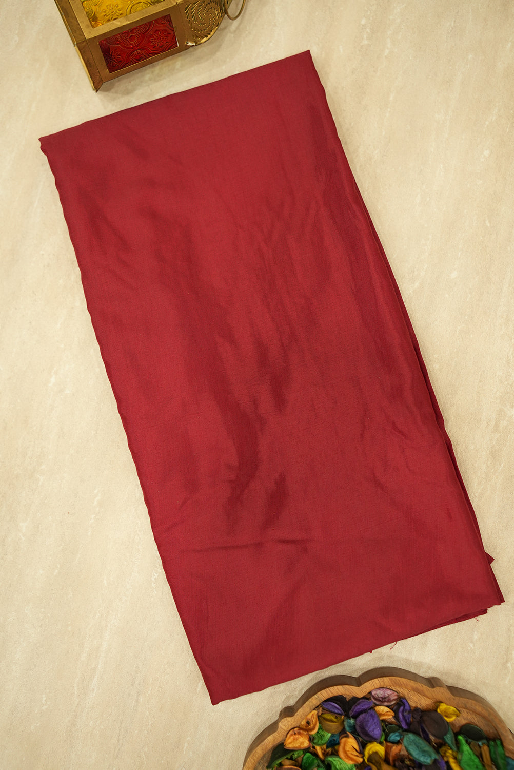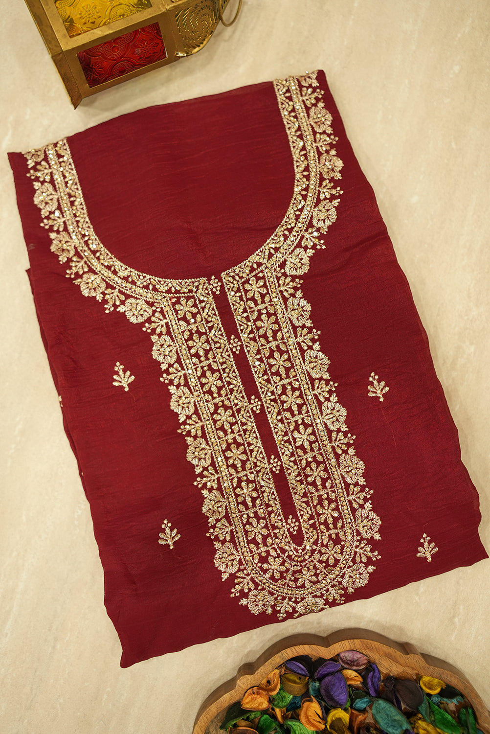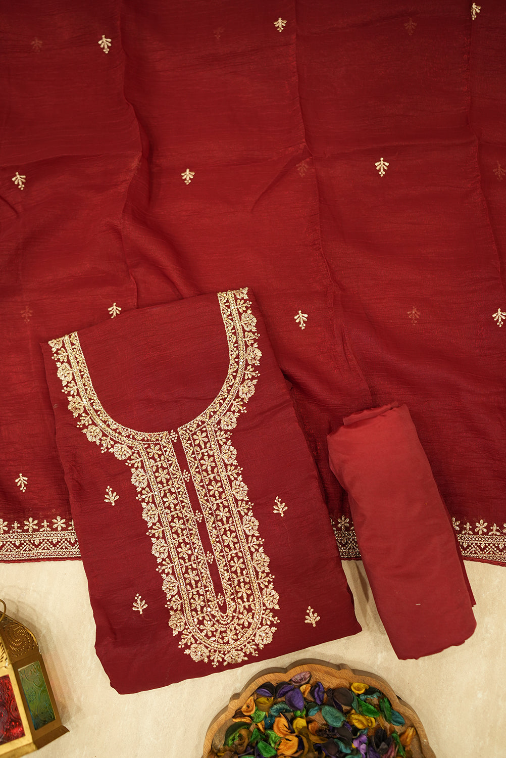 This unstitched three-piece salwar suit set exudes regal charm and sophistication. The rich, deep maroon kurta (top) features an exquisitely embroidered neckline in shimmering gold zari and delicate threadwork, along with subtle scattered motifs. The set includes a matching solid maroon salwar (pant) and a flowing dupatta (scarf) that complements the top with its own intricate embroidery along the border and scattered gold motifs. This luxurious ensemble is perfect for weddings, festive occasions, or any formal event where you want to make a grand statement.