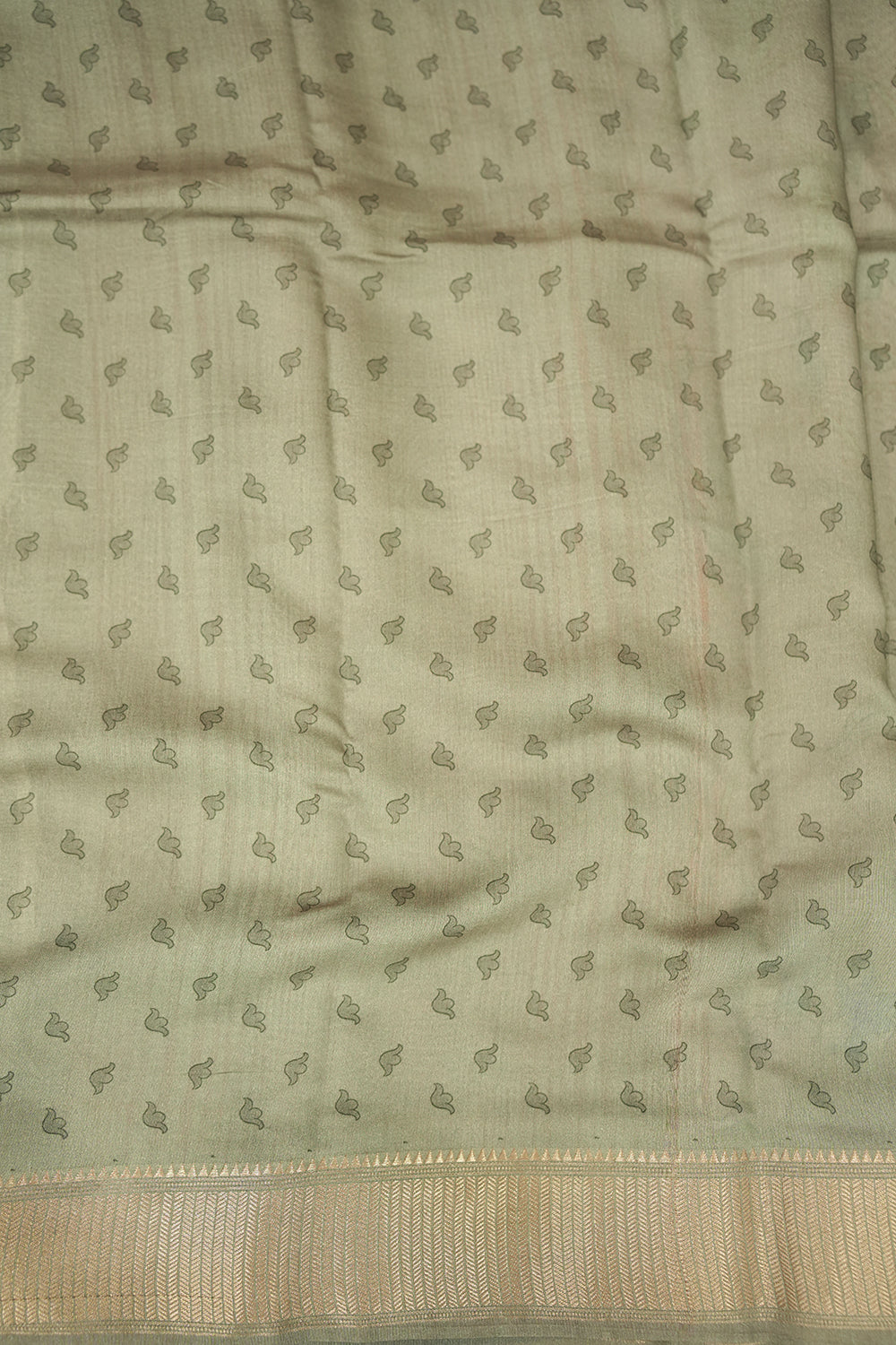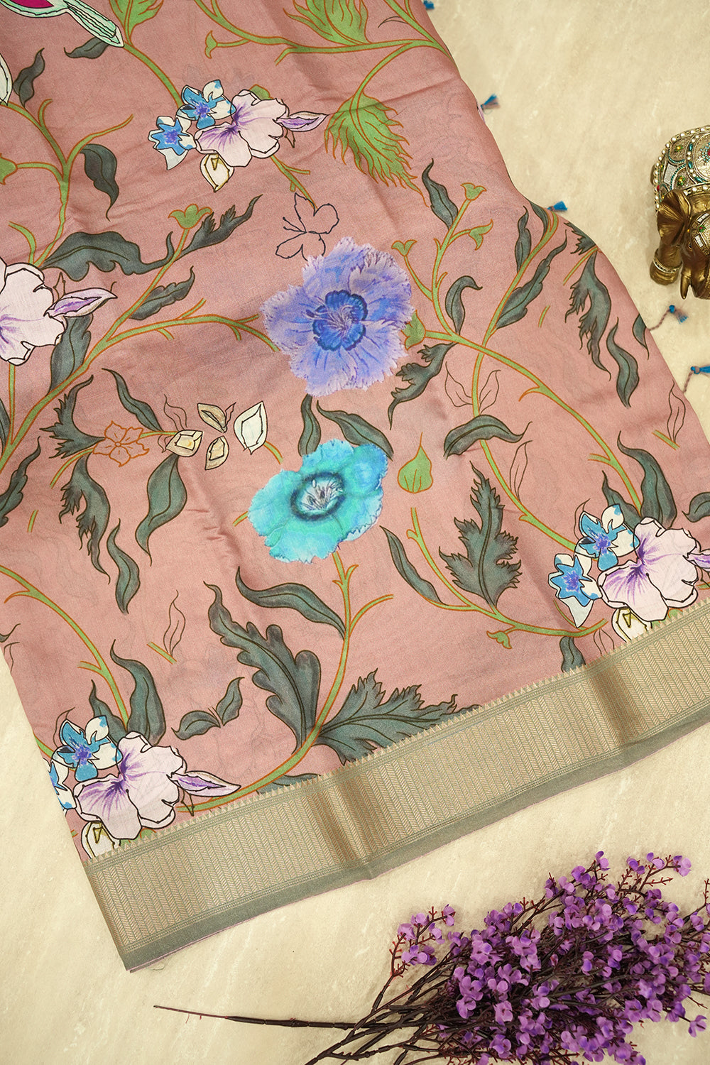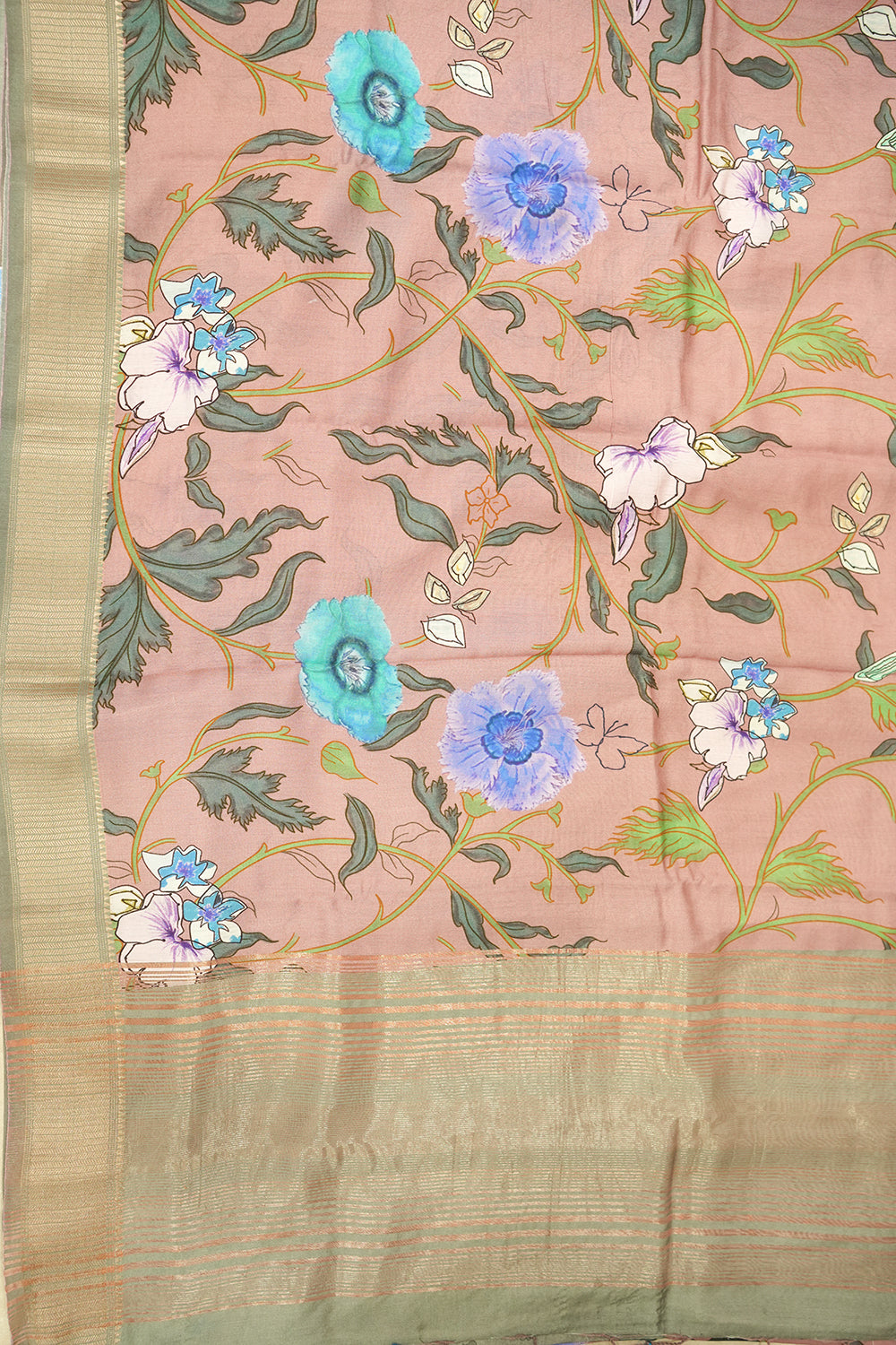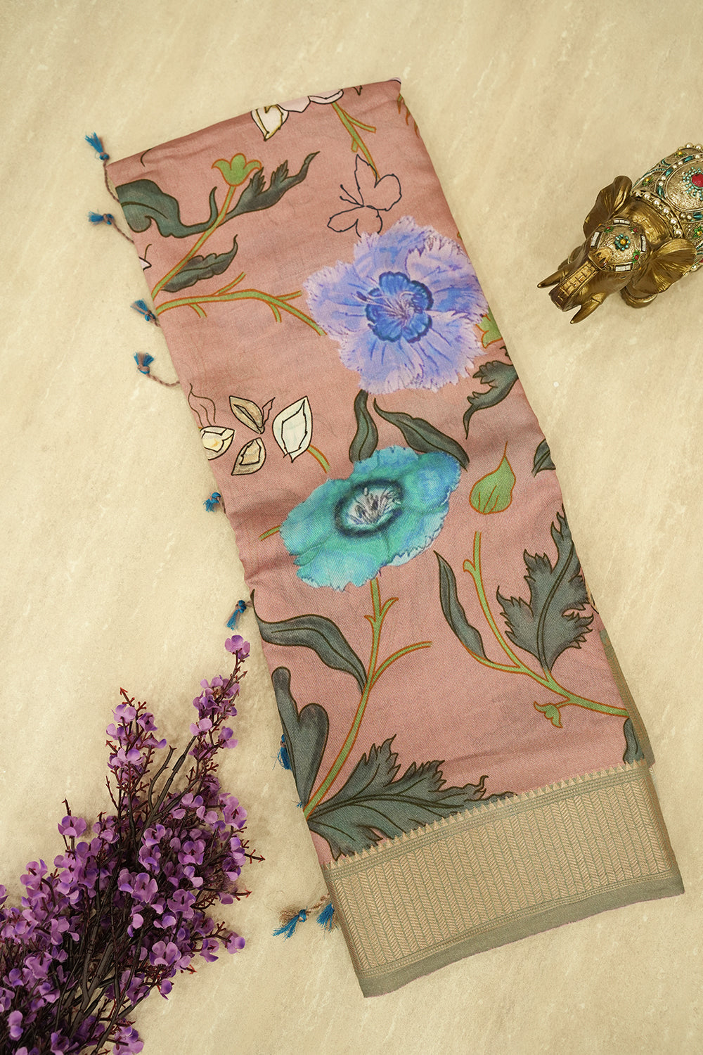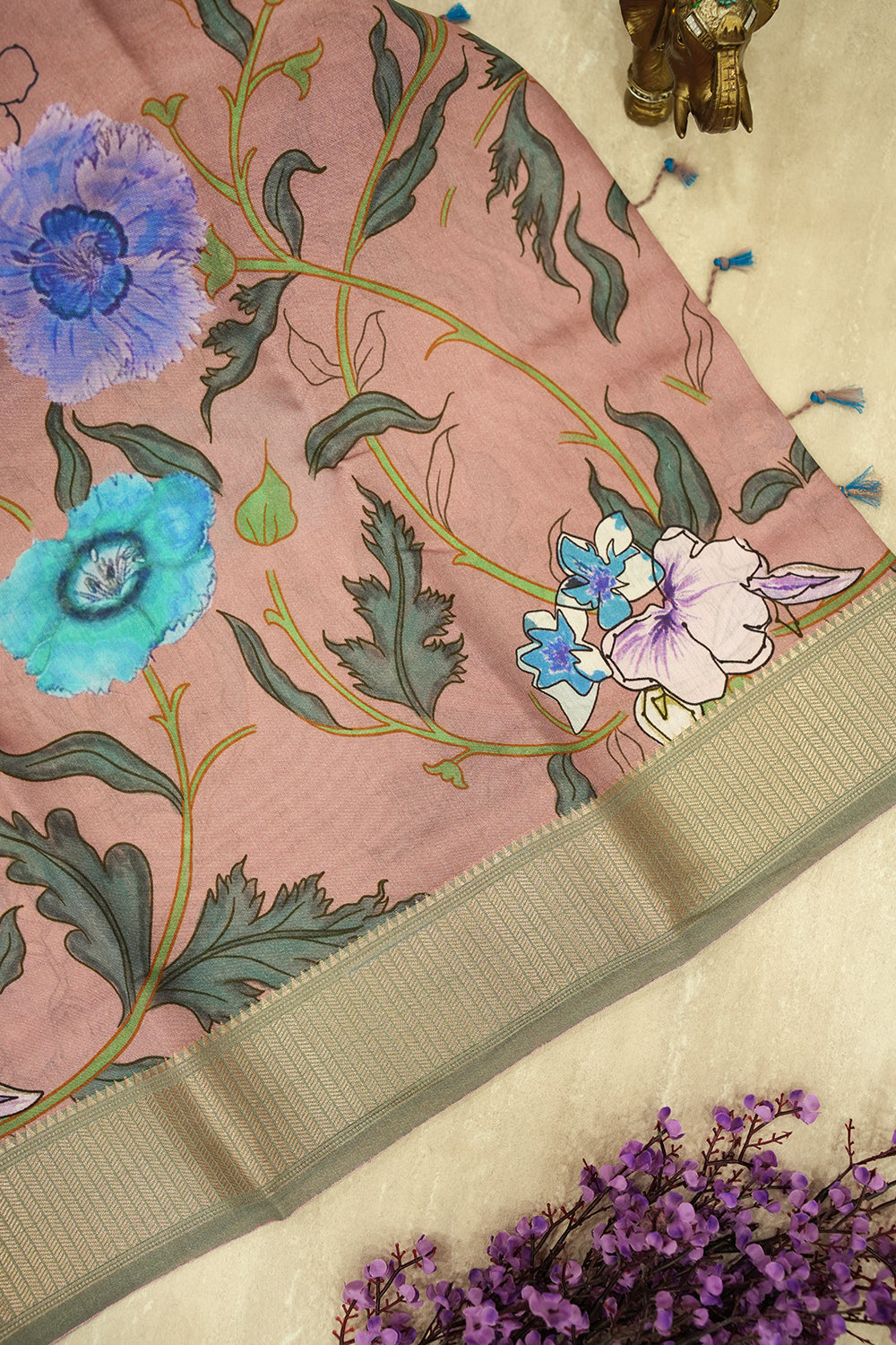 This beautiful tussar saree features a unique dusty pink base adorned with vibrant blue and teal floral prints. The delicate green foliage and a contrasting grey border add to its sophisticated charm. Unstitched blouse attached.
