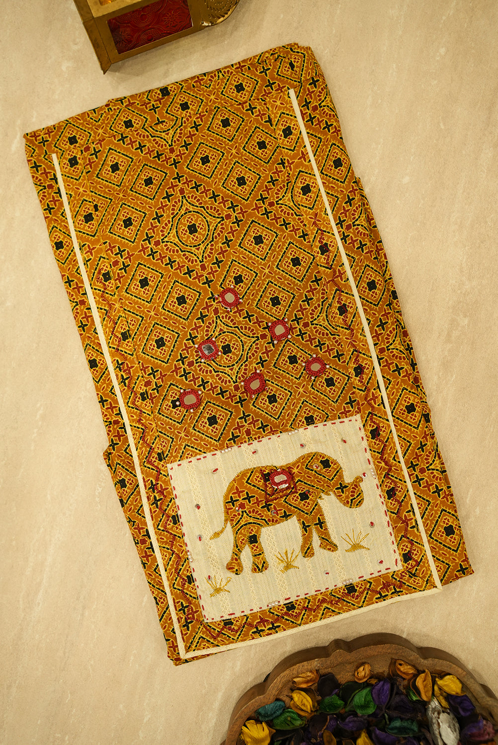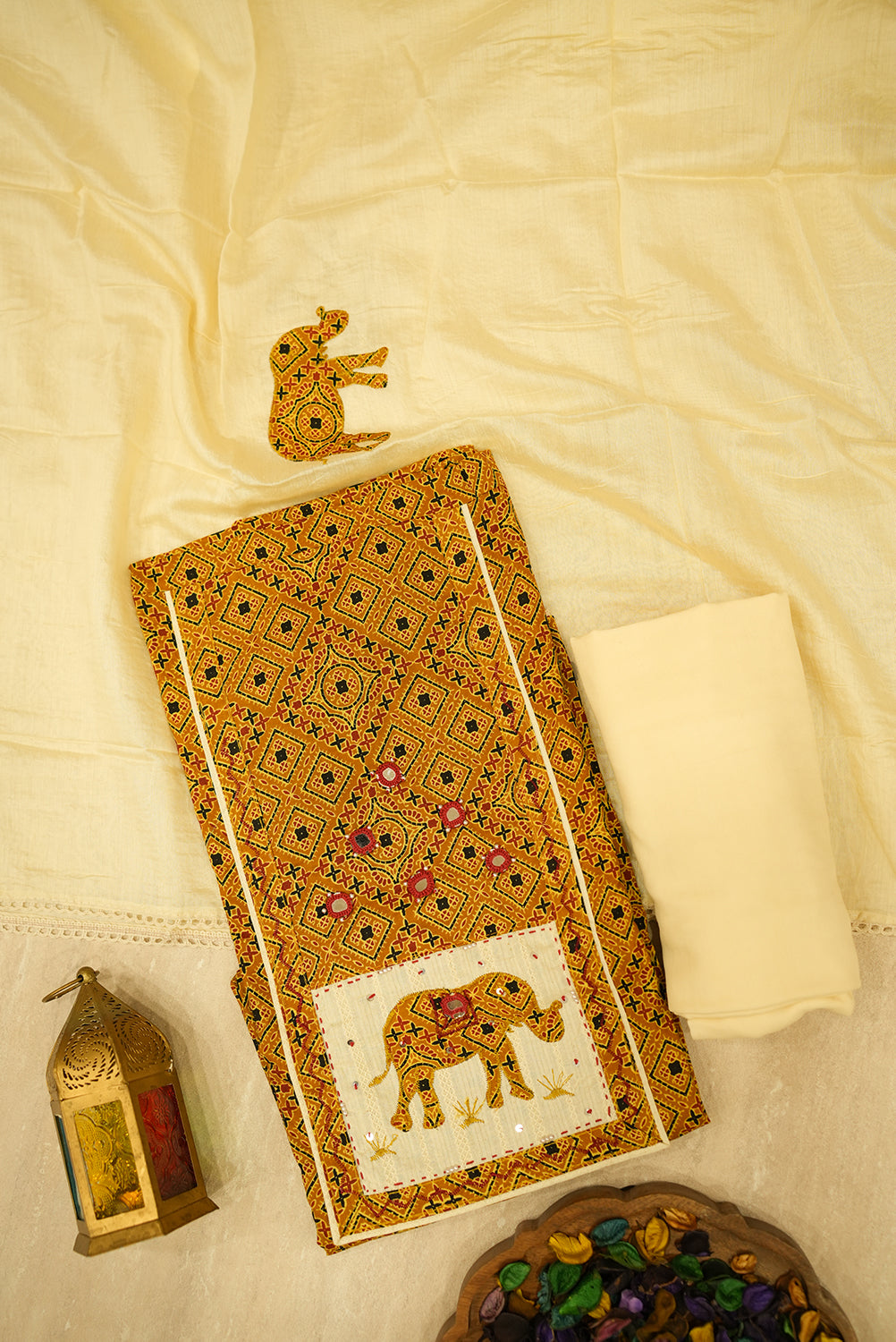 This unstitched three-piece salwar suit set showcases a rich, earthy color palette and traditional design. The kurta (top) features an all-over geometric print in shades of brown and orange, with a striking square panel at the bottom displaying a beautiful elephant motif. The design is highlighted by shimmering mirror work and intricate embroidery. The set includes a solid cream salwar (pant) and a matching dupatta (scarf) with a delicate lace border and a separate elephant appliqué, adding a charming, cohesive touch. This unique ensemble is perfect for cultural events, festive celebrations, or making a stylish statement.
