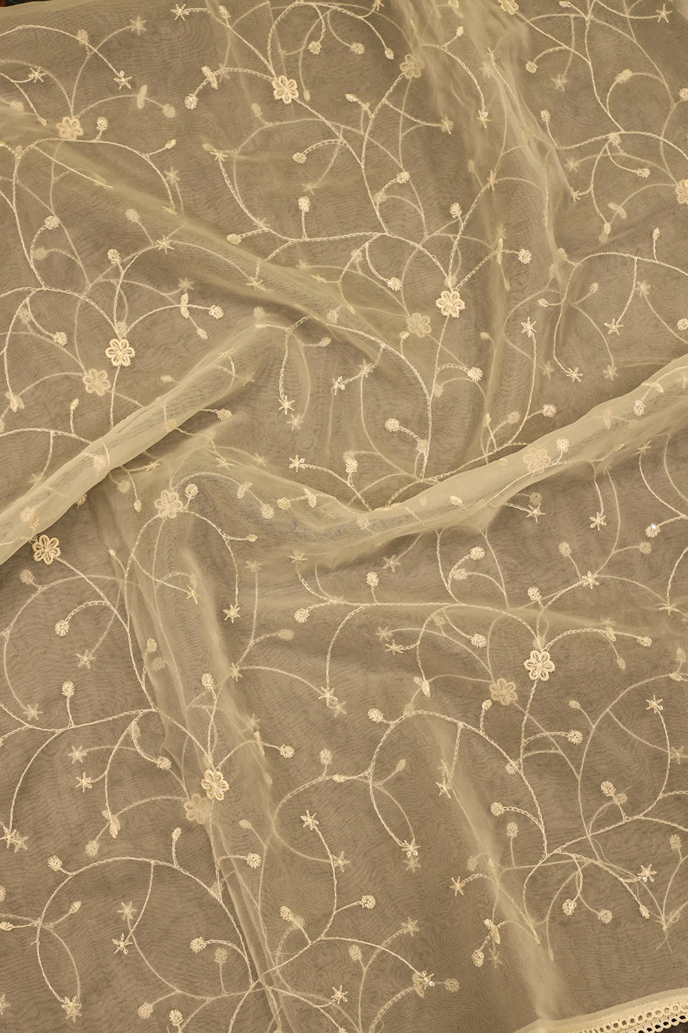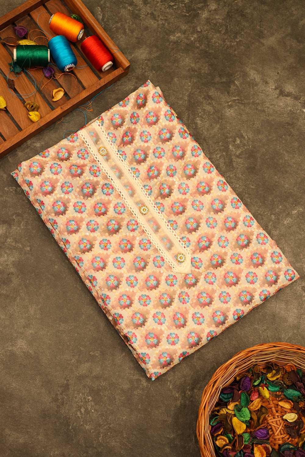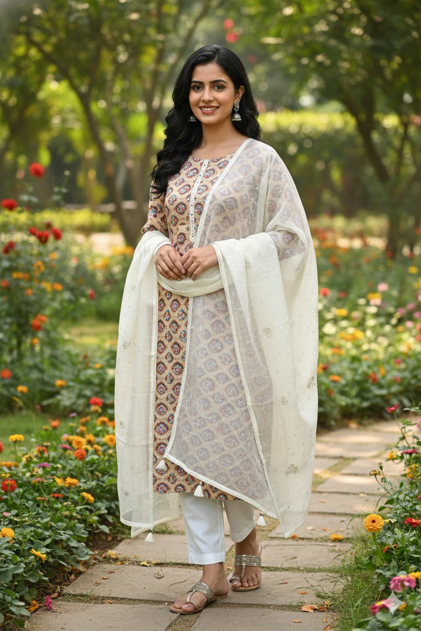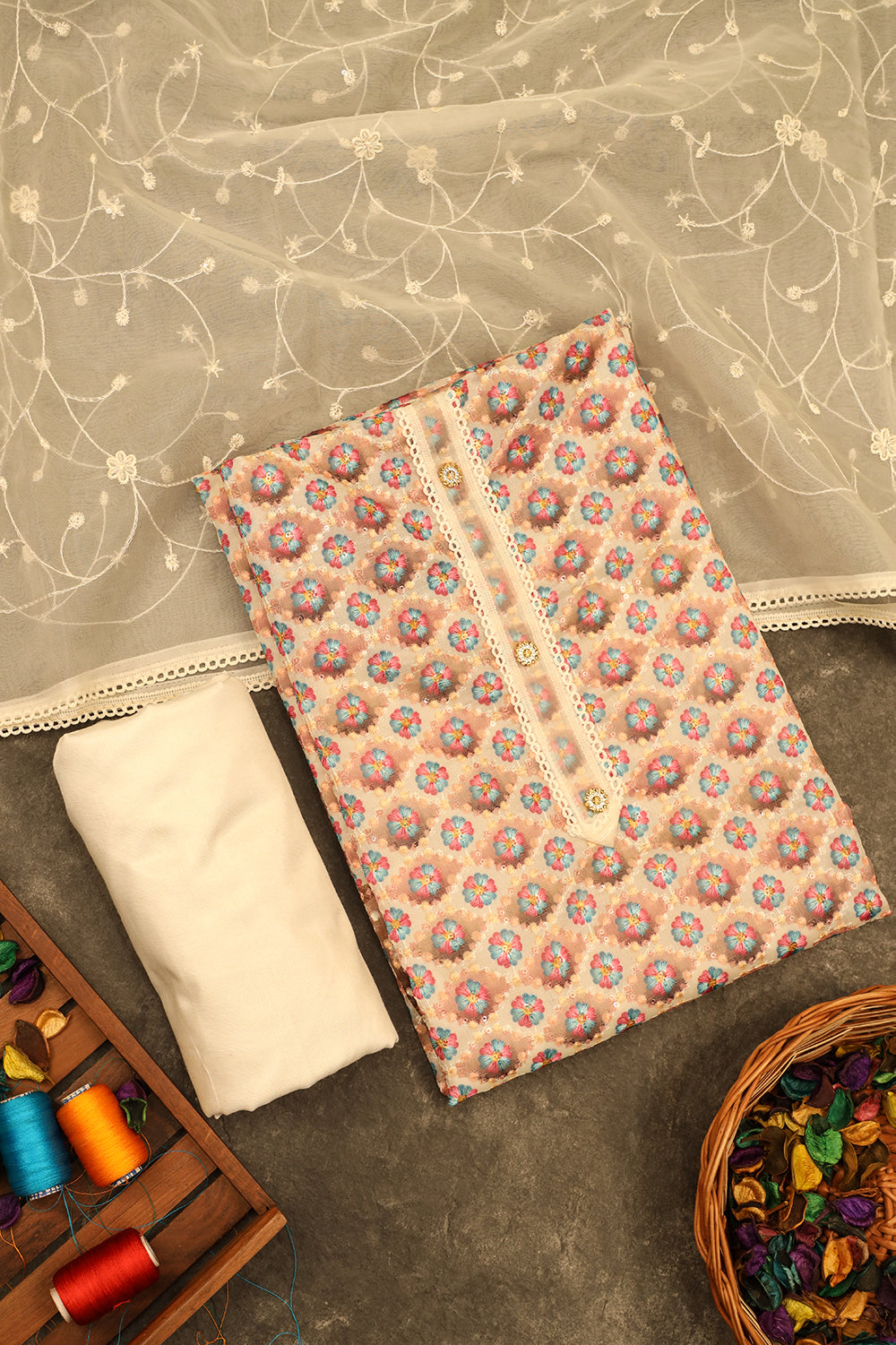 This elegant salwar material features a rich cream-colored brocade fabric adorned with a delicate floral pattern in shades of pink and blue. The sheer net dupatta adds a touch of grace, while the white cotton bottom completes the ensemble.