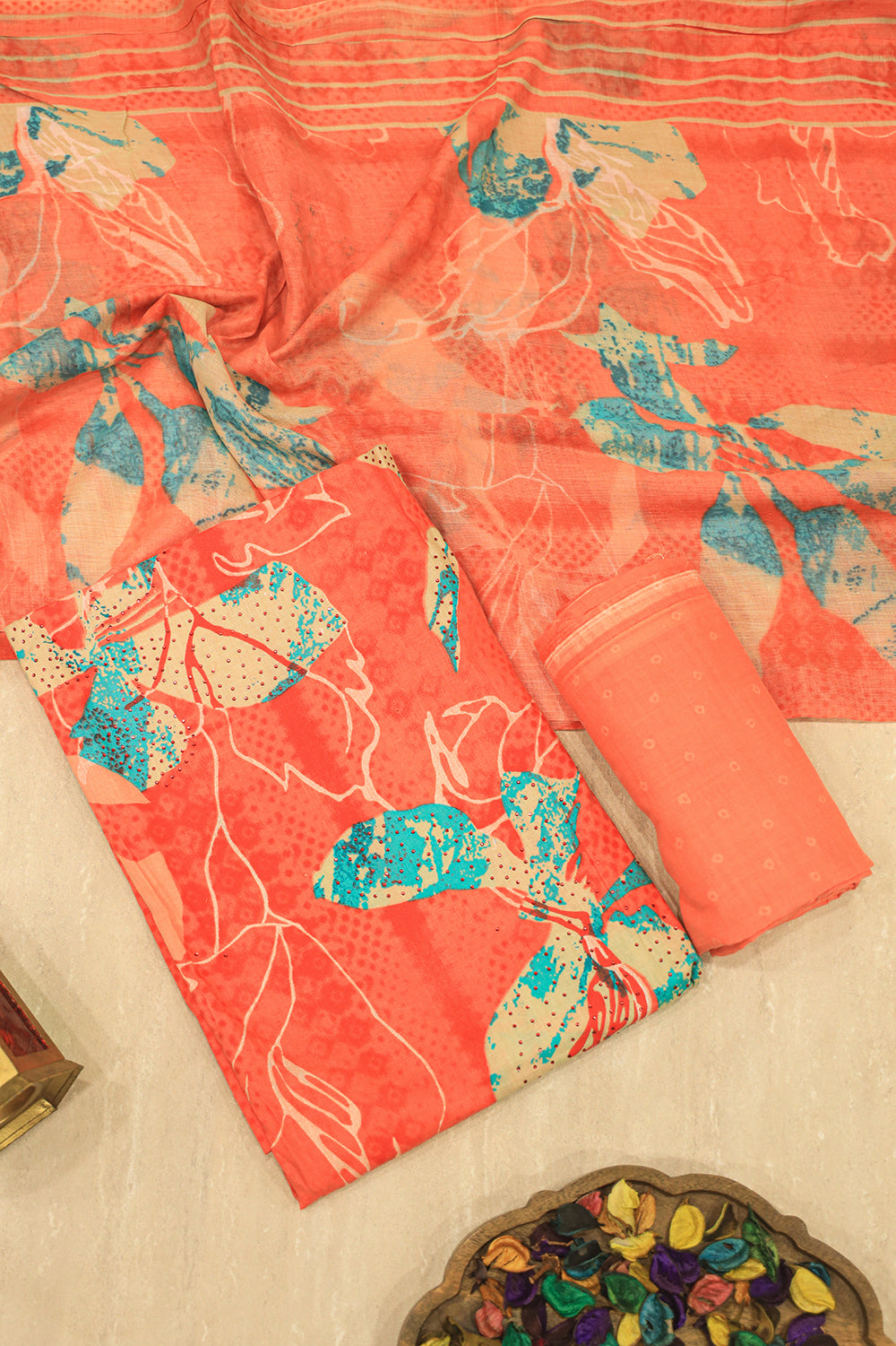 Step into style with this eye-catching unstitched salwar suit material, perfect for creating a personalized and chic ethnic ensemble. The design is a beautiful blend of contemporary artistry and classic comfort.