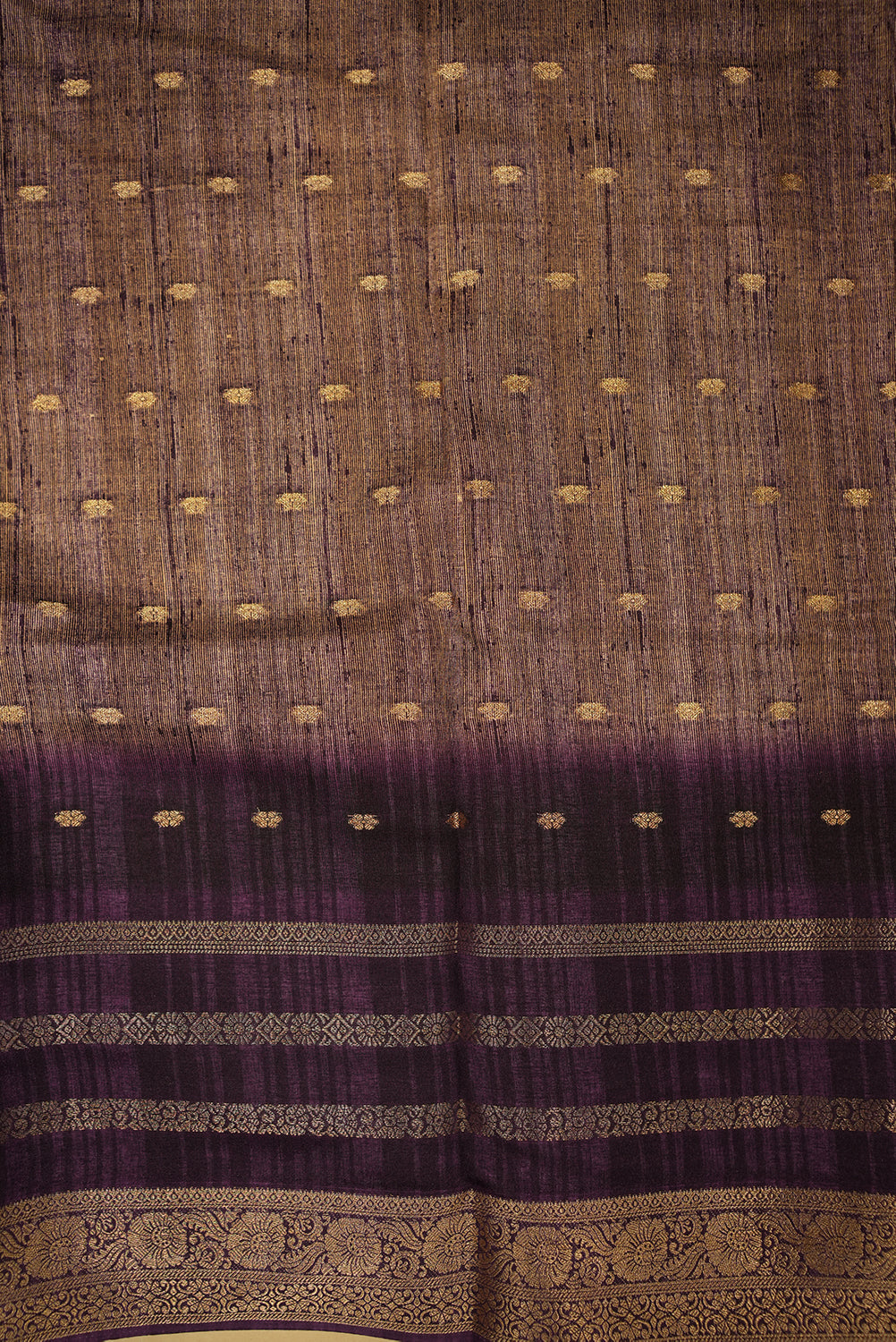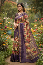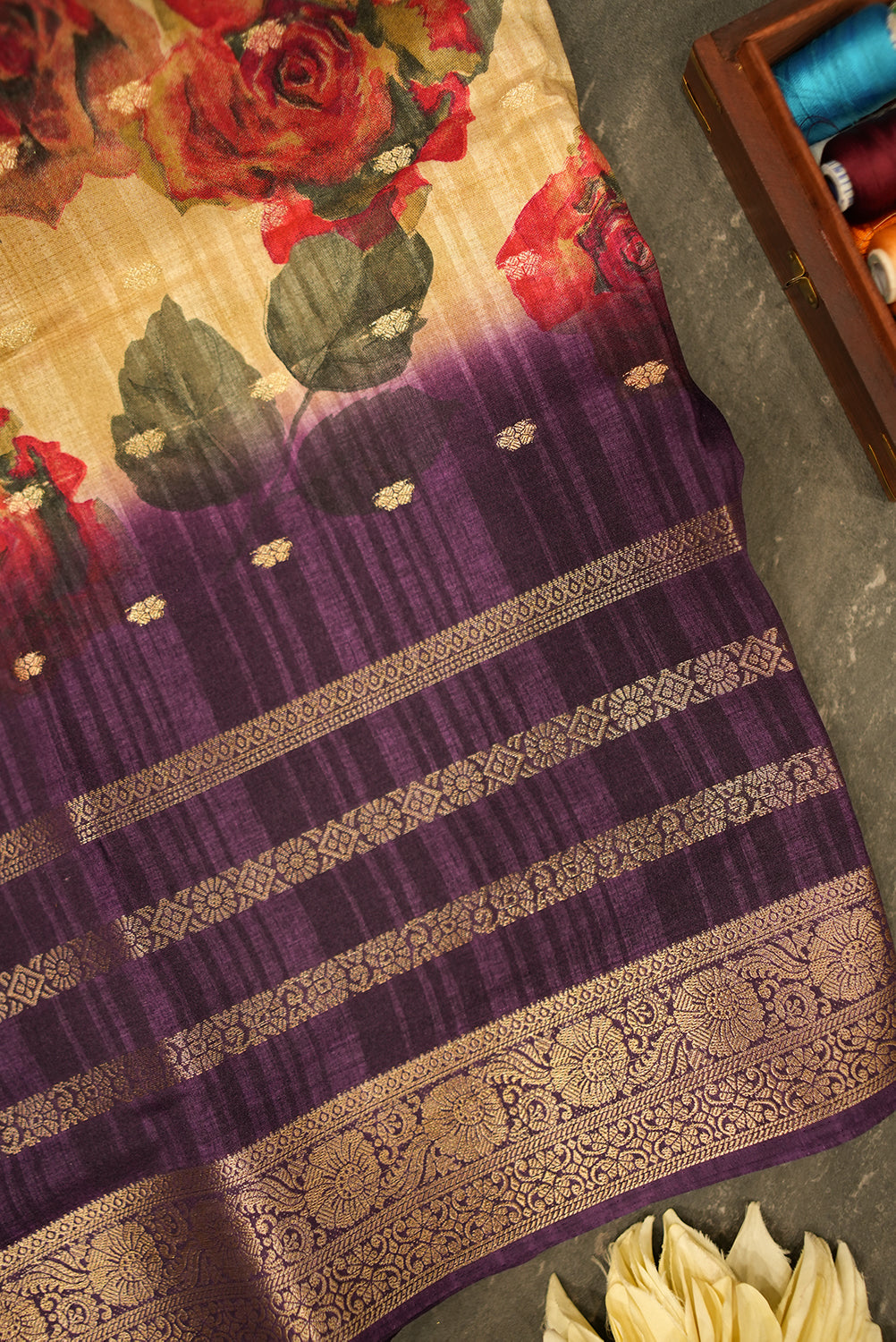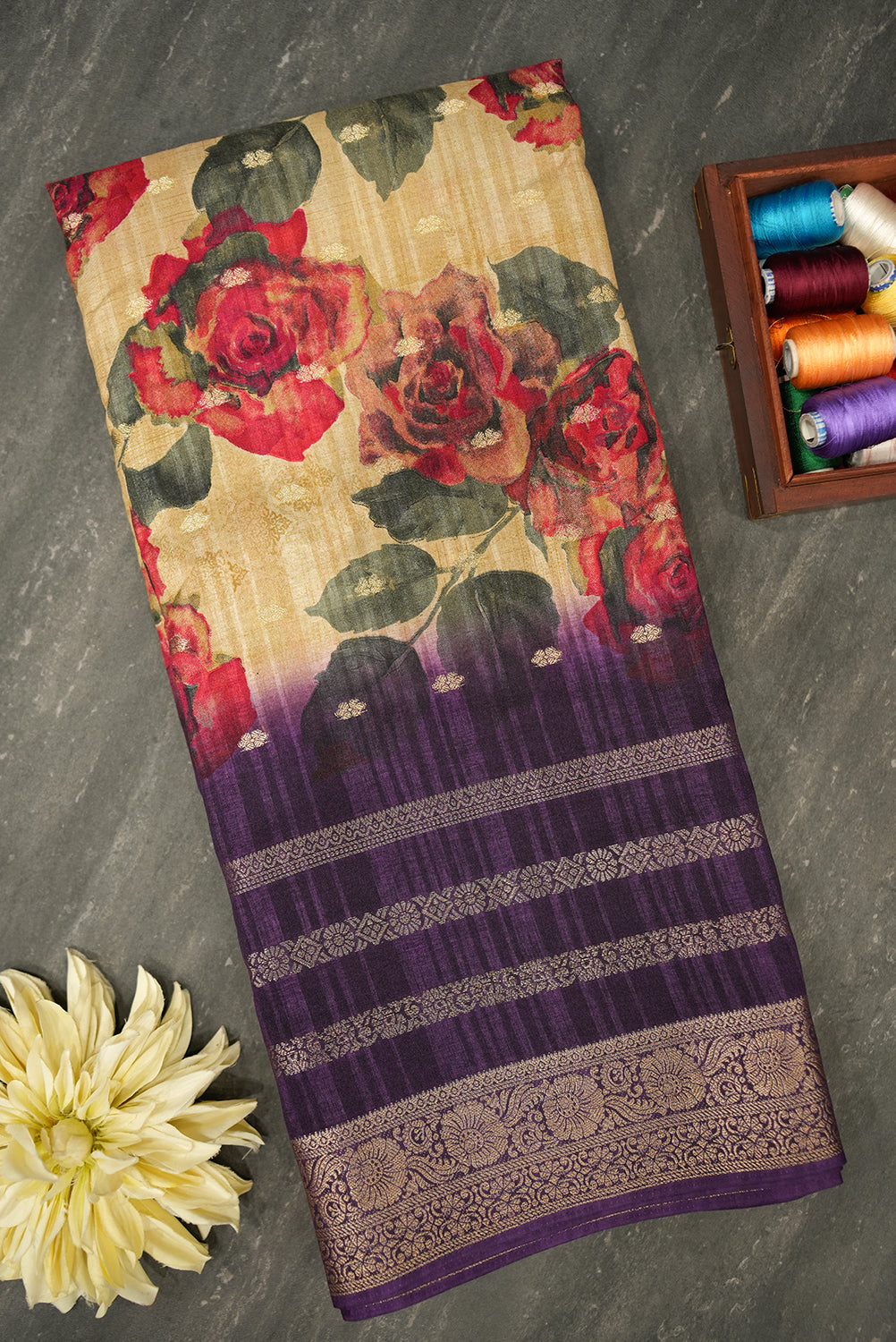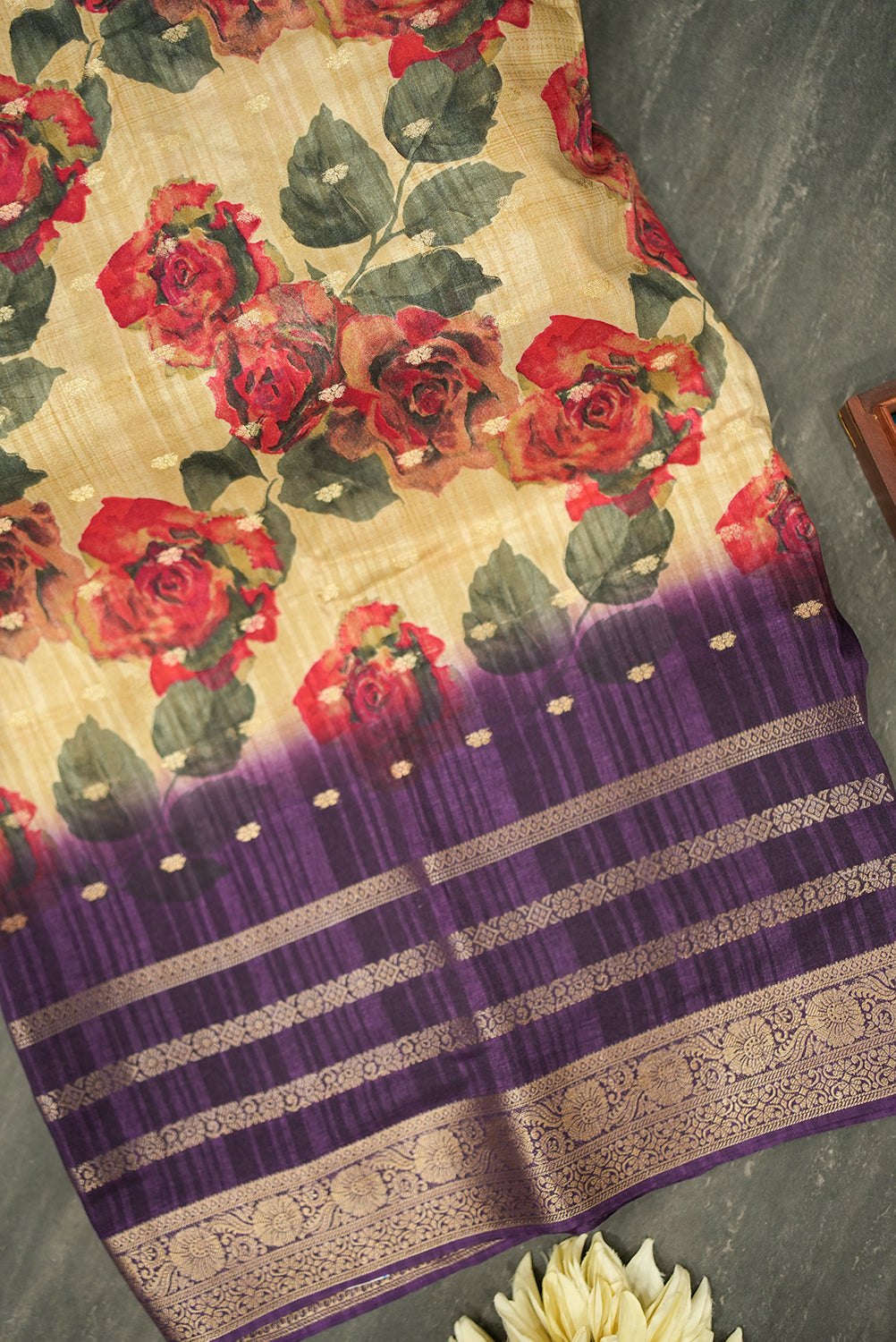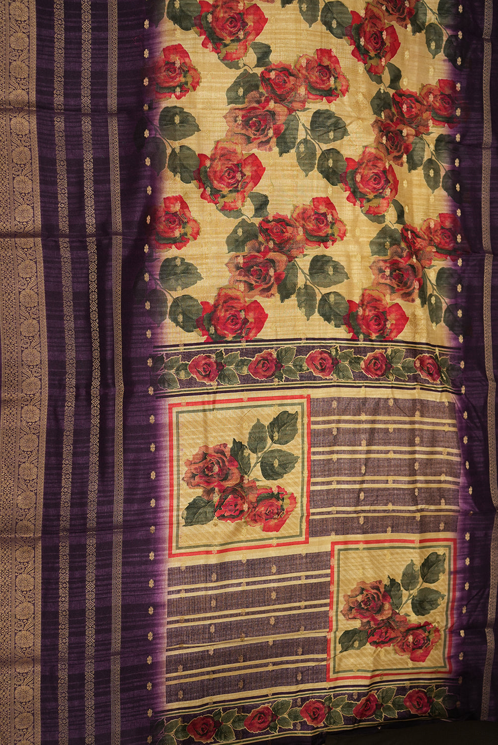 This stunning tussar saree features a beautiful golden body with a bold and vibrant floral print. The print showcases large, realistic roses in shades of deep red and pink, creating a striking contrast. The saree's pallu and border are a rich purple, adorned with a traditional golden zari weave, adding a touch of classic elegance. This beautiful saree is a perfect blend of modern and traditional styles, making it an excellent choice for festive occasions and special events.