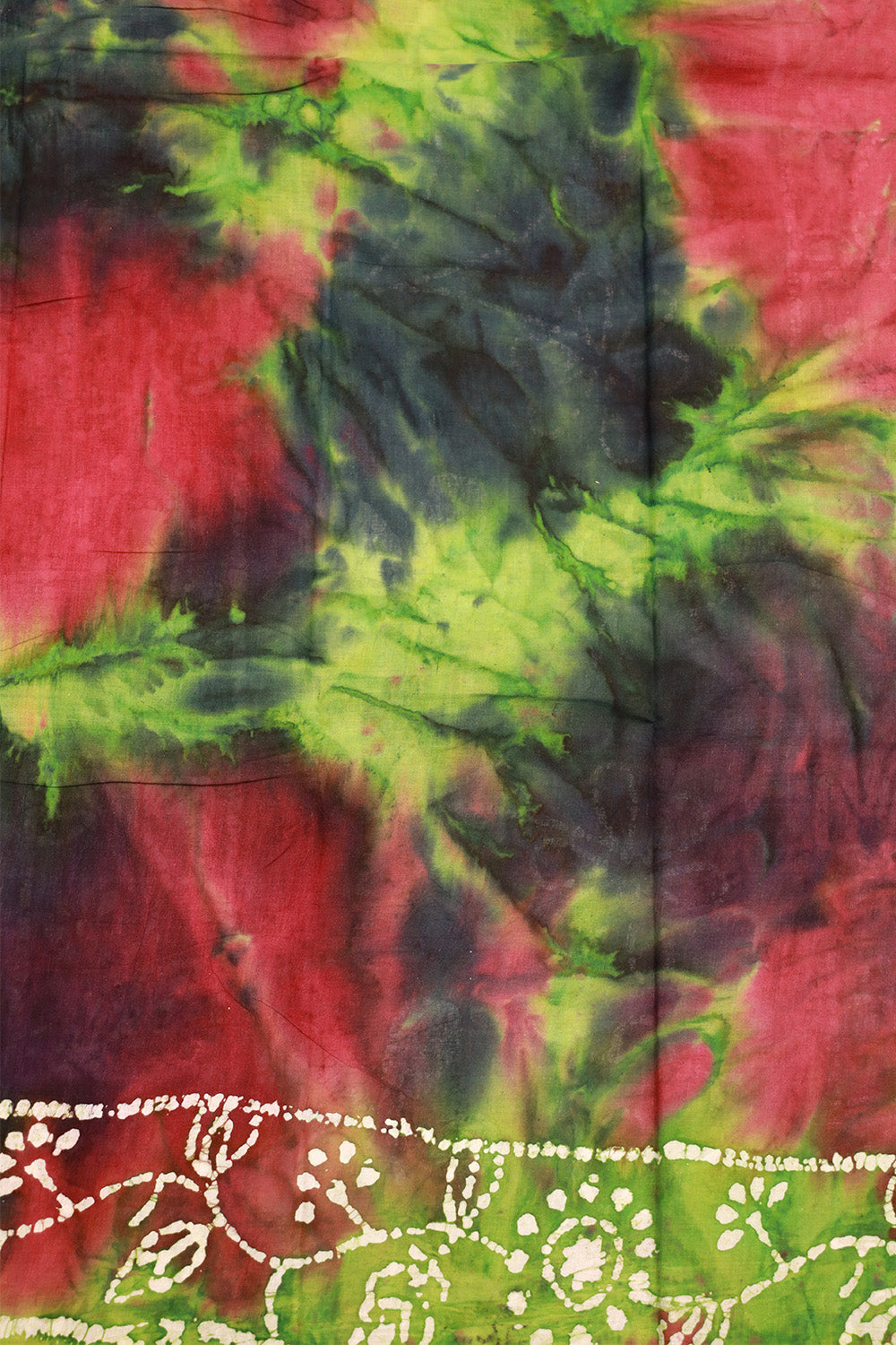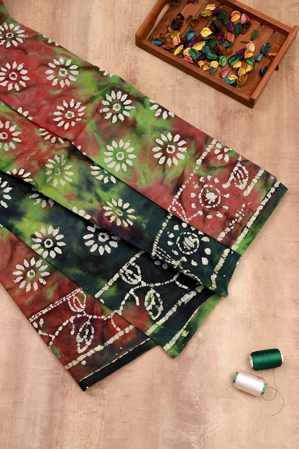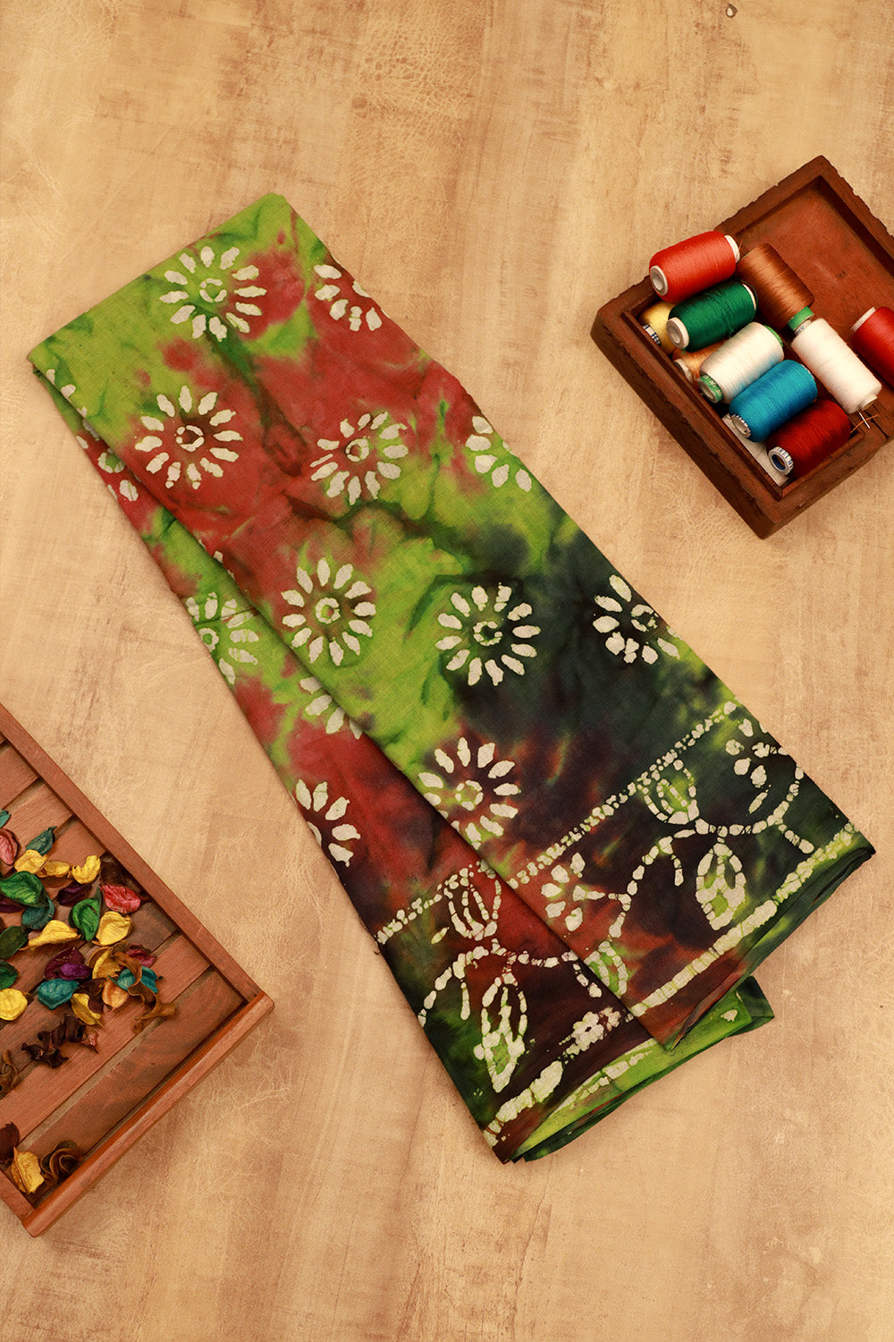 Embrace effortless style with this beautiful tie-dye cotton saree. The vibrant blend of deep green and rich maroon creates a captivating visual, while the off-white floral motifs add a touch of delicate elegance. The unique tie-dye technique lends a rustic, artisanal feel, making it perfect for casual gatherings or daytime events. Unstitched blouse attached