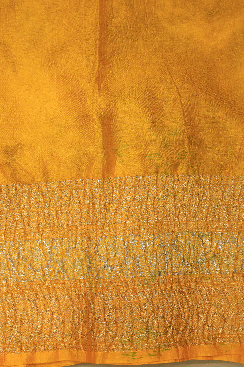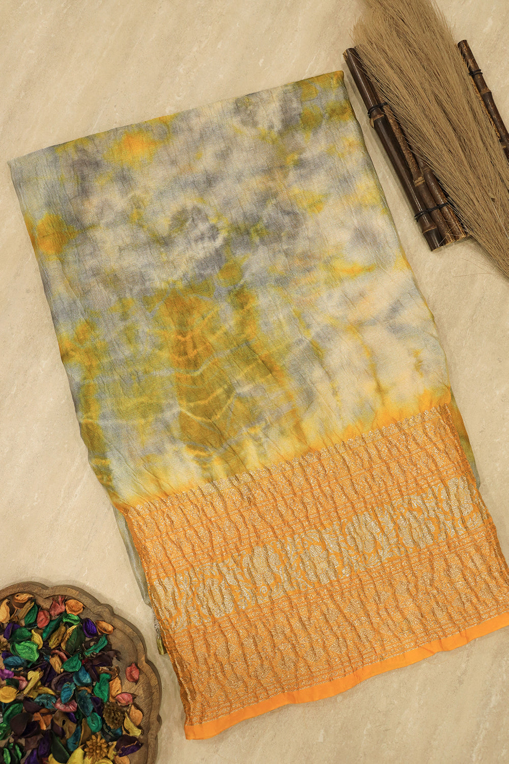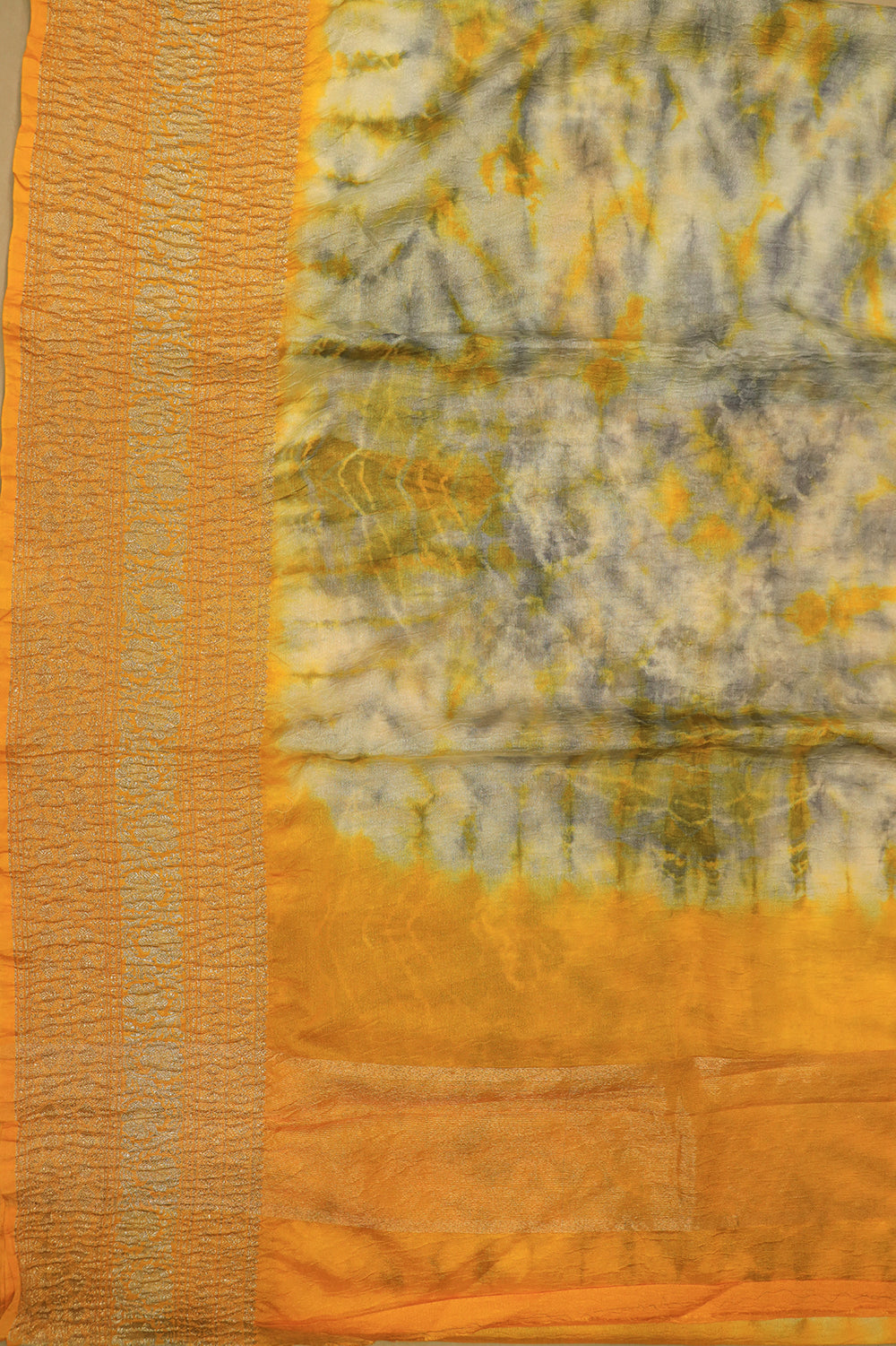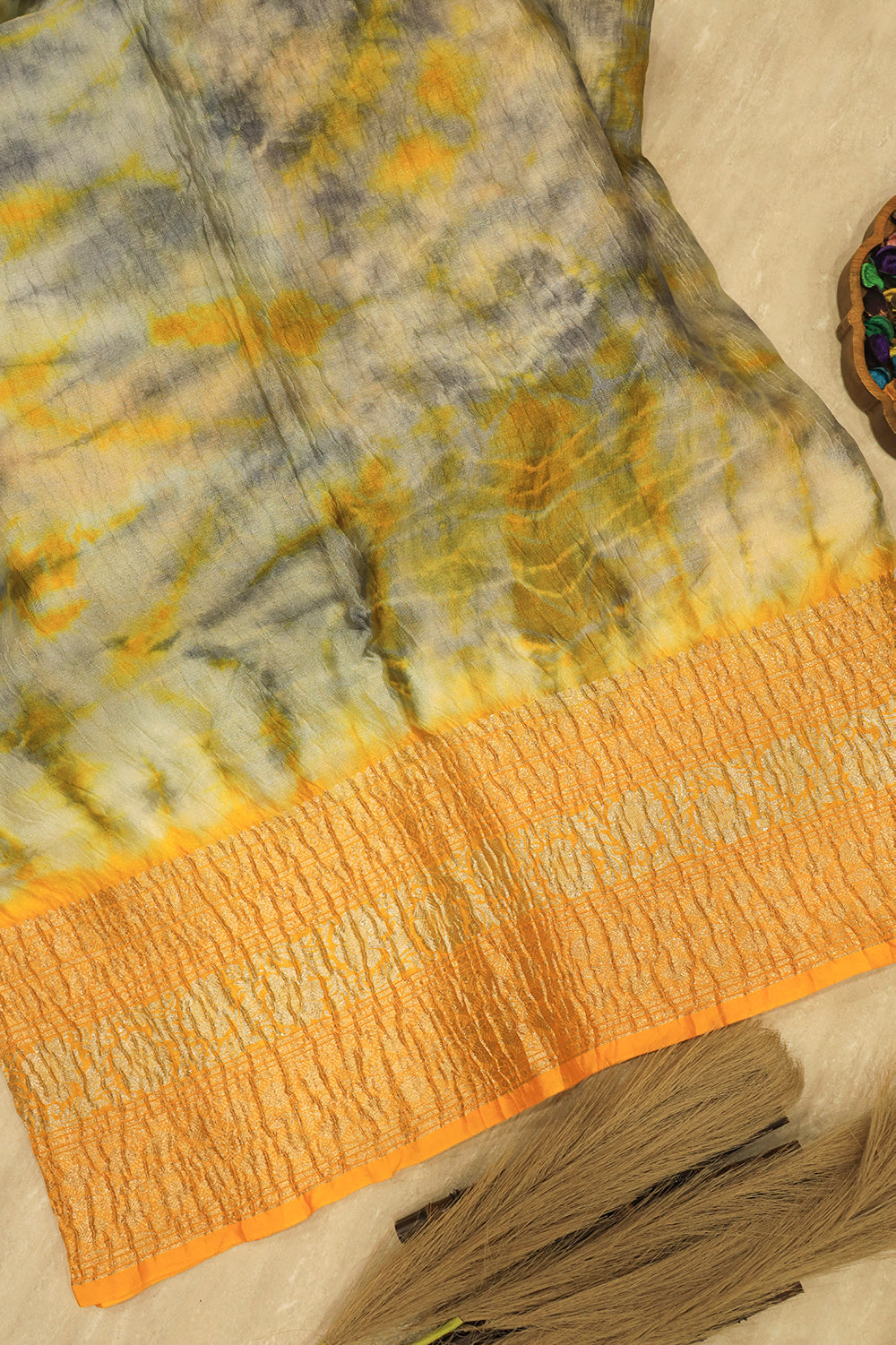 A stunning statement piece crafted from delicate, crushed tissue fabric. The body displays an abstract wash of grey and vibrant mustard-yellow. Its unique texture and contrasting border create a chic and modern look. Unstitched blouse attached