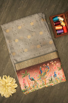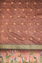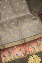 This elegant tussar saree features a graceful grey body adorned with subtle golden floral motifs. The highlight is the stunning pallu, which showcases a vibrant, multicolored digital print of peacocks, flowers, and palm trees in a rich array of pink, blue, green, and orange shades. The saree is finished with a traditional golden zari border, creating a beautiful contrast between modern artistry and classic design. This is an ideal choice for special events where you want to make a sophisticated and artistic statement.