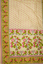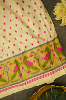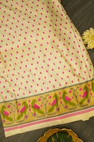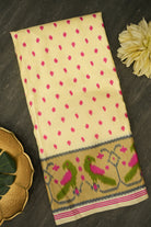 This beautiful semi ikat designer saree features a soft ivory base adorned with delicate pink ikat dots across the body. The contrast is provided by a stunning border in beige, featuring a bold and intricate ikat print of birds in pink and green. This unique blend of simple elegance and traditional craftsmanship makes it a perfect choice for special occasions, adding a touch of sophisticated style.