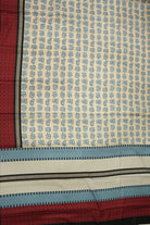 This charming semi-satin tussar saree has a whimsical feel, featuring a smooth ivory base adorned with playful elephant motifs in a soft light blue hue. The saree's pallu and border stand out with a bold, contrasting design in maroon and black, highlighted with a fun polka dot pattern. This lightweight and artistic saree is a perfect blend of modern style and traditional grace, ideal for casual outings, festive occasions, or making a unique fashion statement.