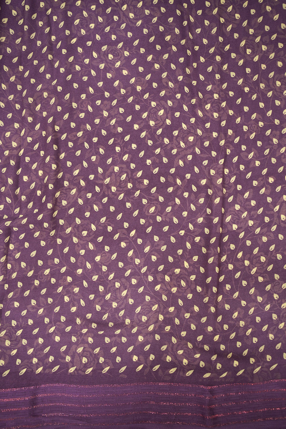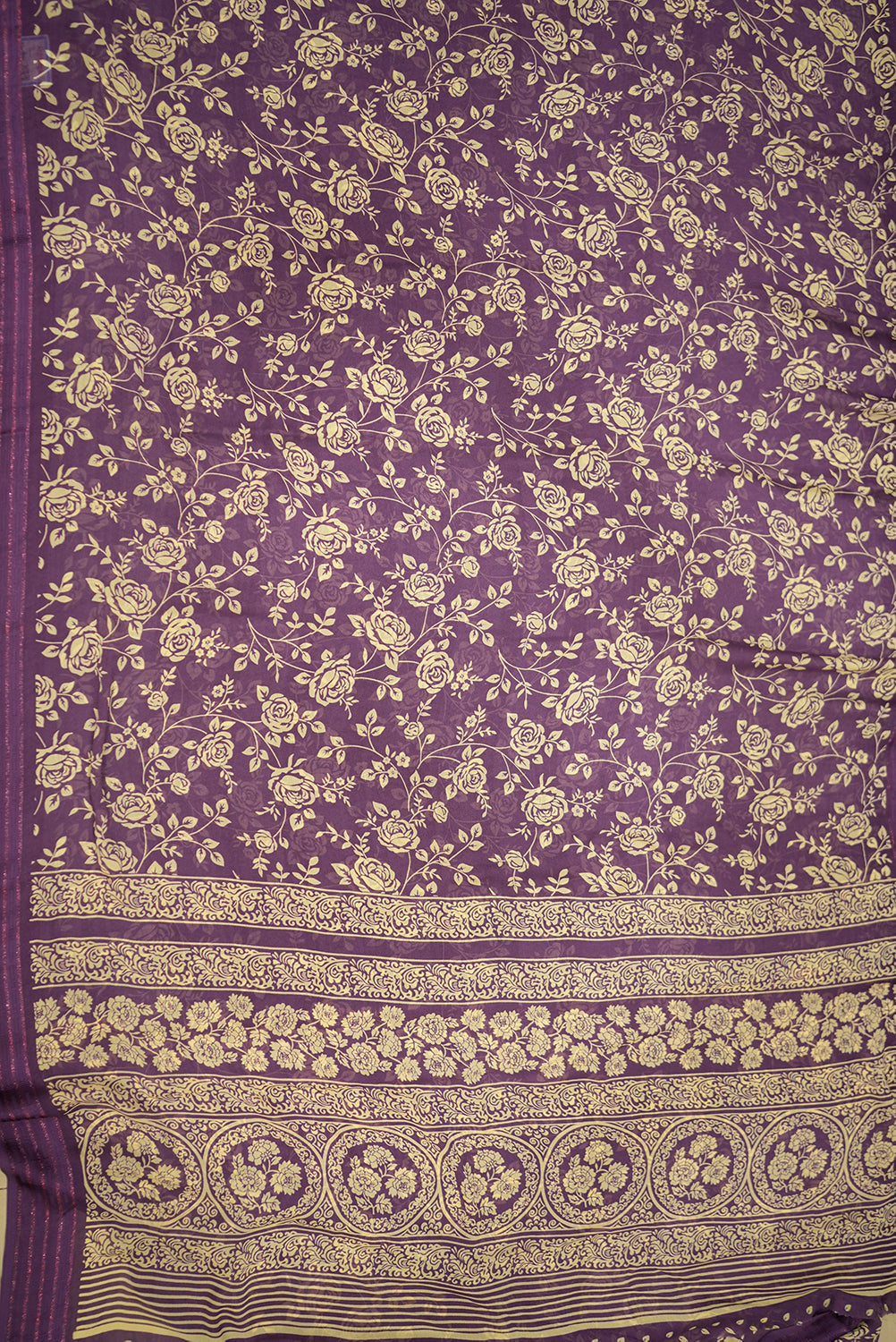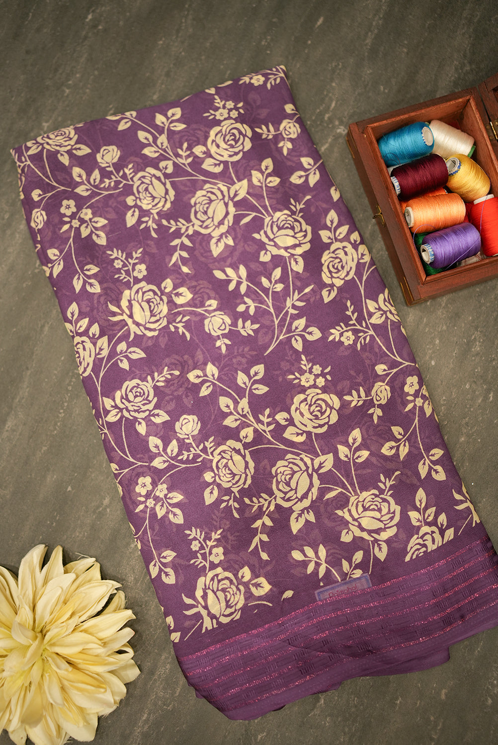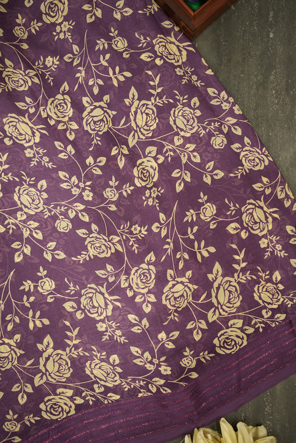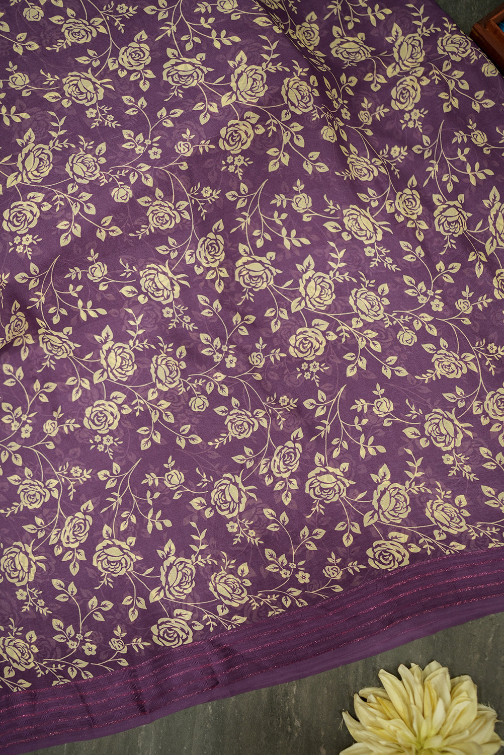 This exquisite chiffon saree features a charming floral pattern set against a beautiful lavender purple background. Delicate cream-colored roses and vines are artfully printed across the lightweight fabric, creating a graceful and romantic aesthetic. The saree is completed with a solid darker purple border that adds a subtle contrast and elegant finish. Perfect for daytime events, garden parties, or casual gatherings, this saree offers both comfort and undeniable charm.