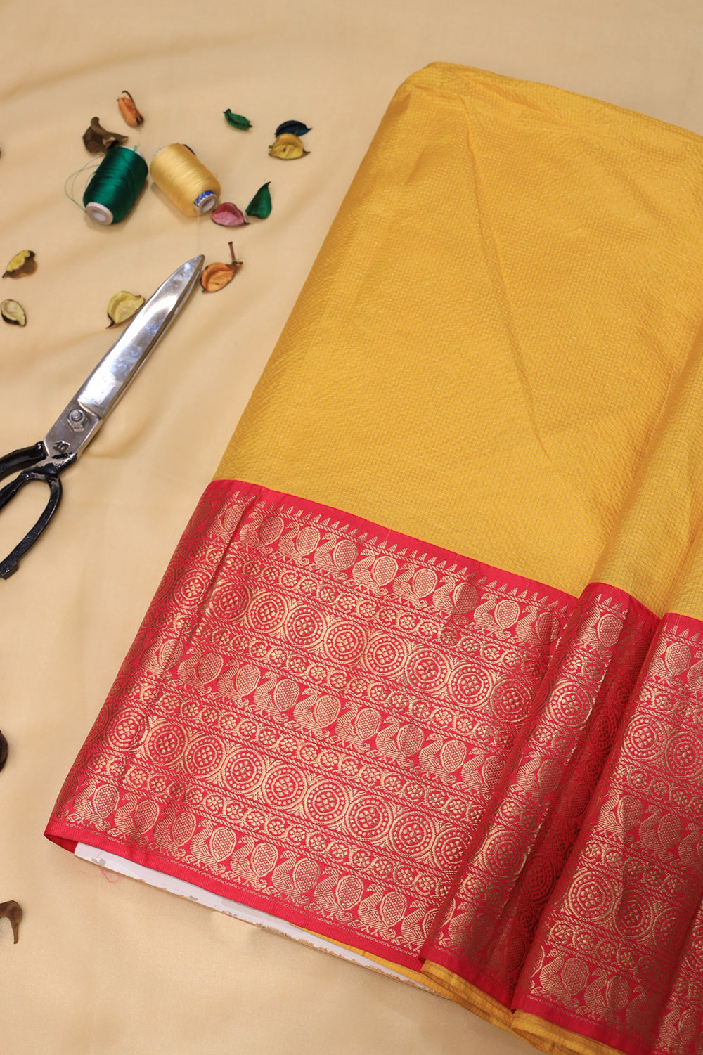 This image features a lemon yellow Vaira Oosi silk fabric with a striking rani pink traditional border, showcasing intricate woven designs. The fabric is neatly folded, highlighting its rich texture and vibrant colors, accompanied by sewing essentials.