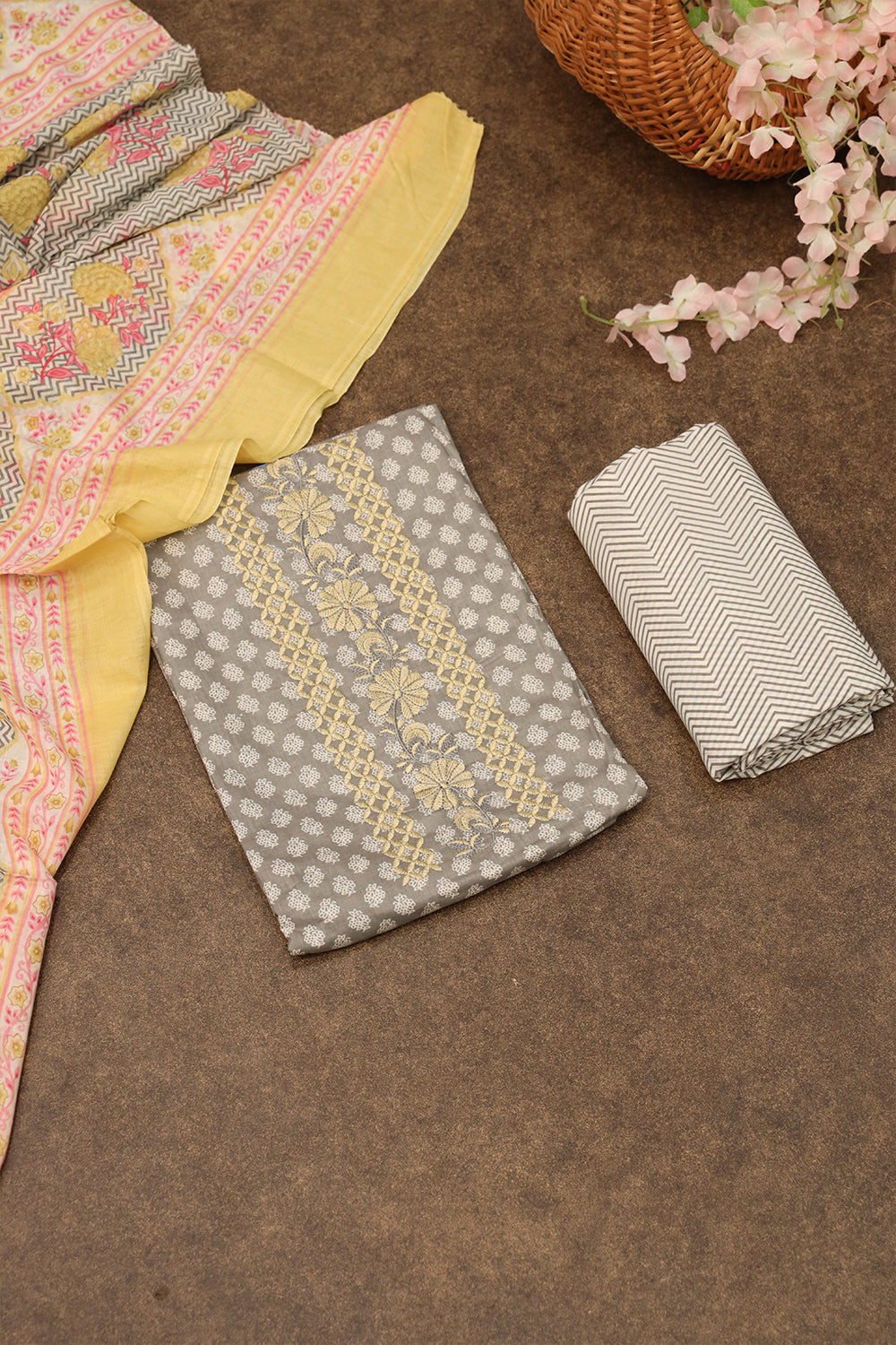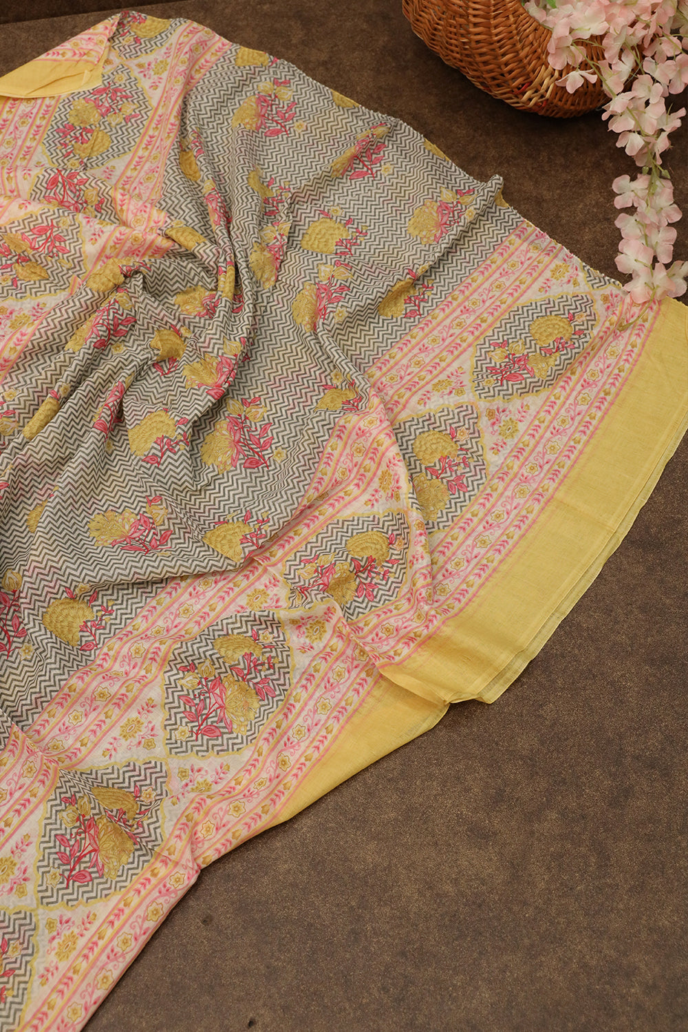 *️⃣Dupatta has grey stripes pink and yellow border with floral print.