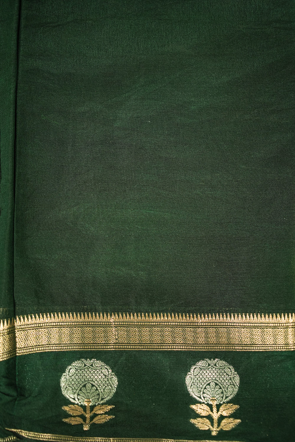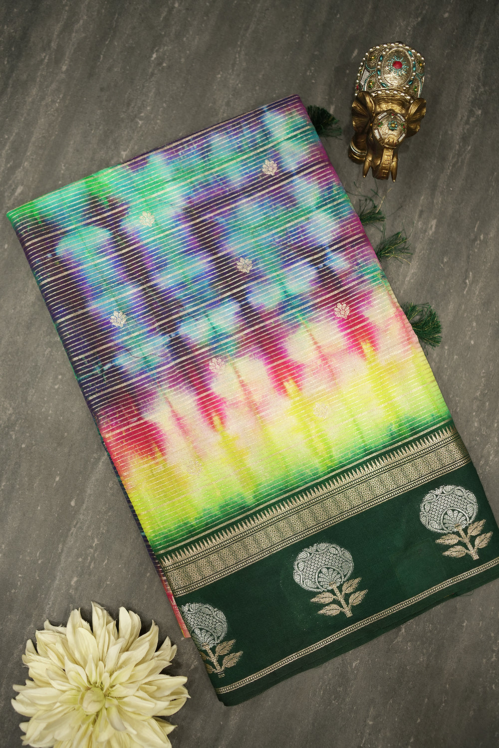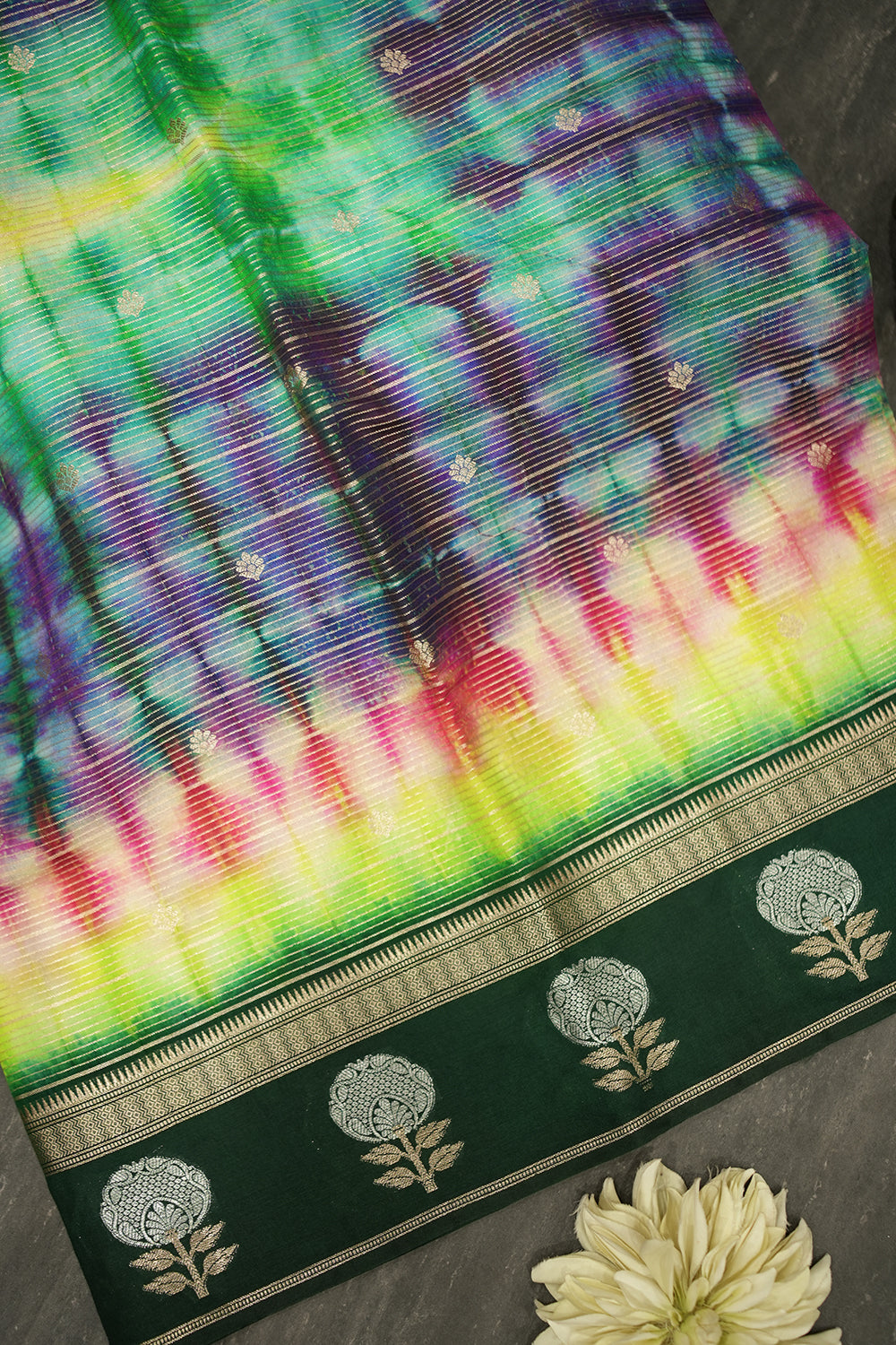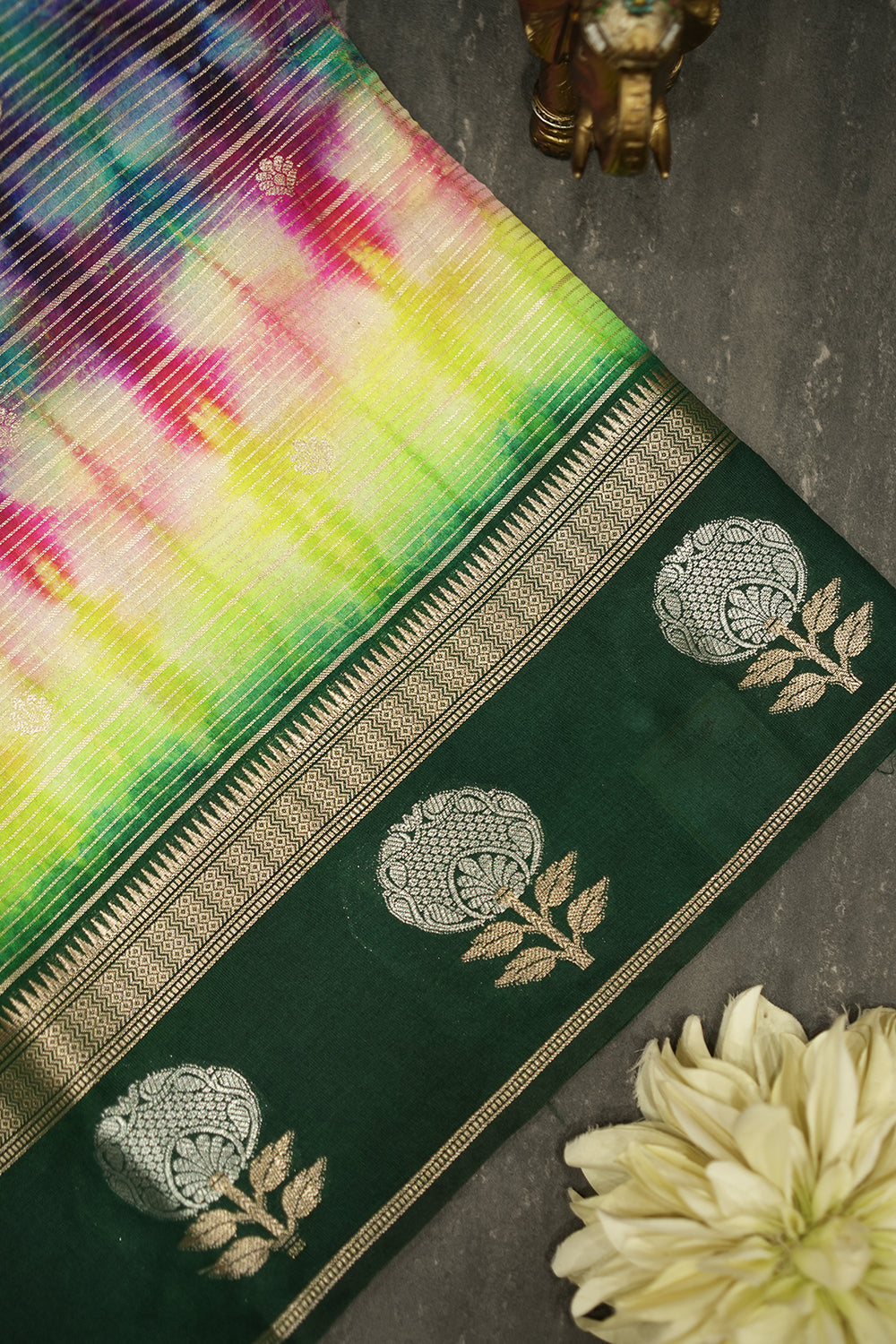 Experience the artistry of this Banaras saree, showcasing a captivating shibori pattern in a harmonious mix of fuchsia, lime, teal, and deep violet. Its lustrous fabric is enhanced by subtle silver zari bootis, perfectly offset by a contrasting dark green border with traditional woven details. Unstitched blouse attached.