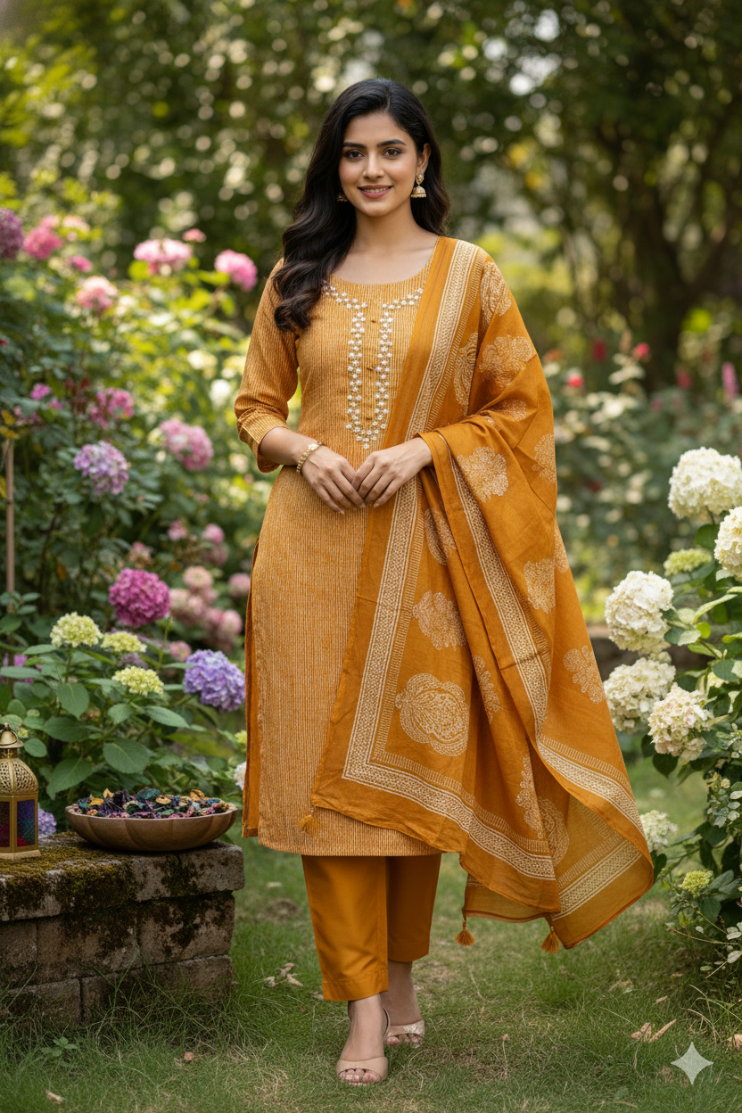 This unstitched salwar suit material features a beautiful mustard yellow color. The kurta fabric has a subtle vertical print and is adorned with delicate white embroidery around the neckline. The set includes a solid-colored bottom fabric and a matching printed dupatta with a floral pattern and a geometric border.