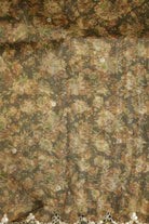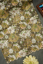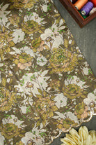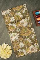 This elegant saree features a beautiful print of blooming flowers in shades of olive green, brown, and light pink against a muted background. The intricate design gives it a vintage-inspired charm. The saree is finished with a thin border of silver sequins, adding a subtle touch of sparkle. Lightweight and stylish, this saree is perfect for both casual and semi-formal occasions, offering a unique blend of nature-inspired beauty and contemporary flair.