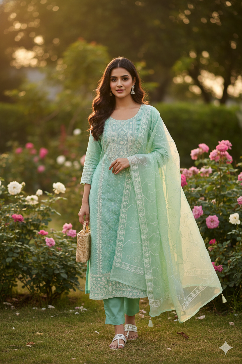 This unstitched cotton suit set comes in a soothing pastel green shade. The kameez is adorned with detailed white embroidery and glimmering mirror work, complemented by a soft, sheer dupatta. It's a perfect blend of traditional craft and modern elegance.