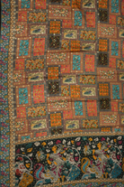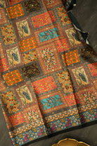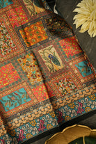 This vibrant semi-satin tussar saree is a celebration of color and pattern, featuring a unique patchwork design. The body is adorned with a rich tapestry of squares, each with a different traditional motif in a striking mix of colors, including teal blue, coral, mustard yellow, and forest green. The saree is finished with a stunning border of intricate patterns and delicate mirror-work, adding a touch of traditional elegance. This designer piece is perfect for festive occasions, blending modern style with classic Indian artistry.