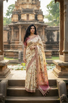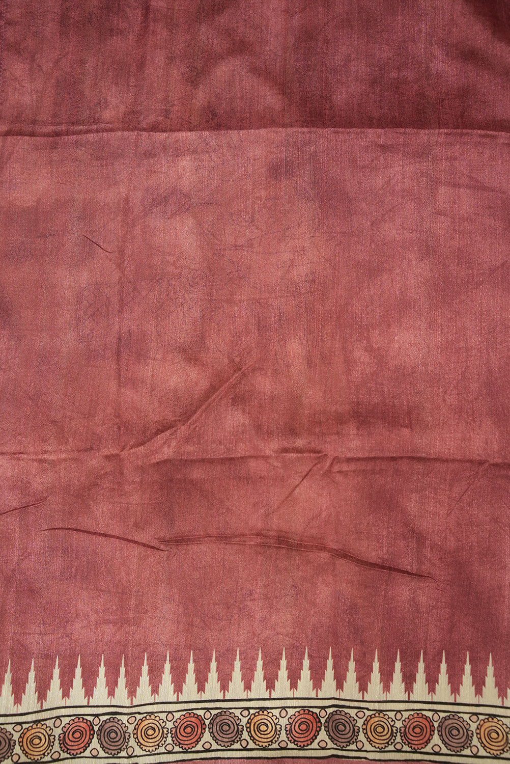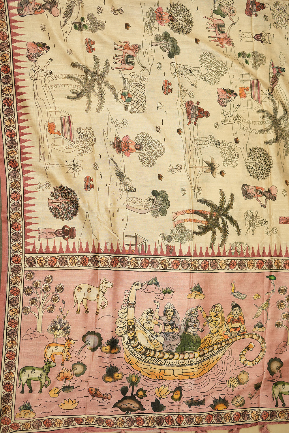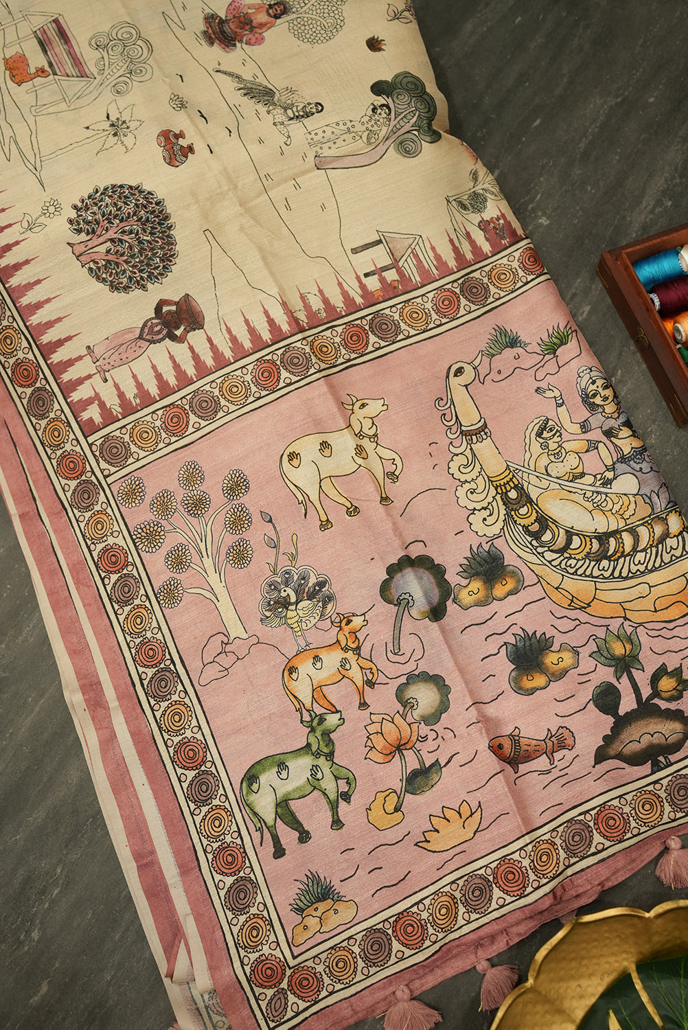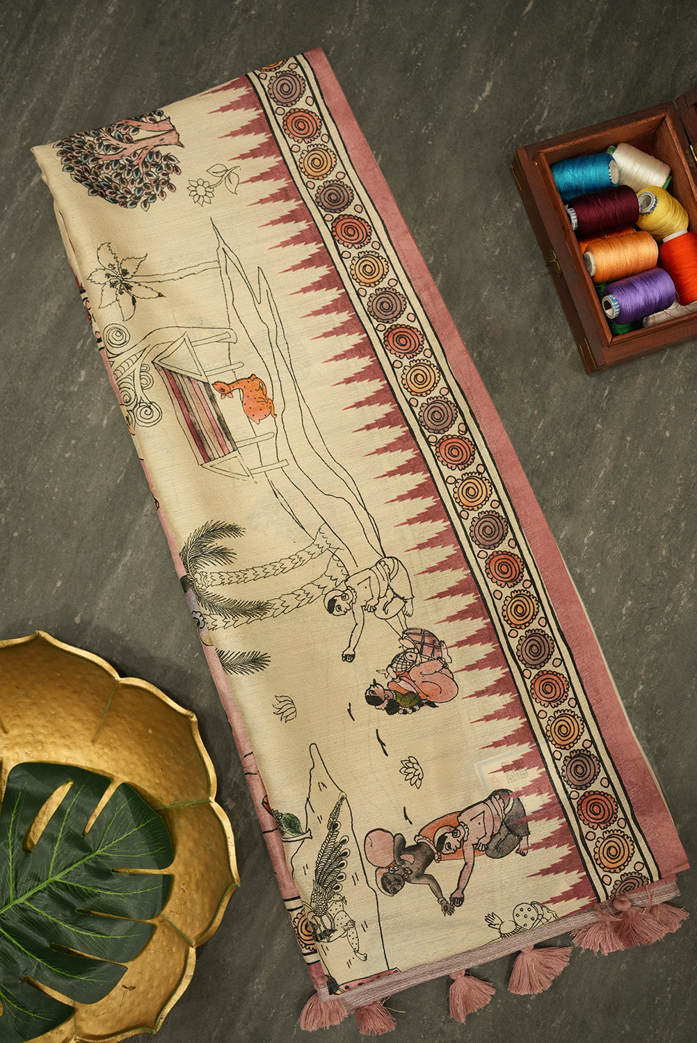 Elegant Tussar silk saree in a soft beige hue, adorned with black Pattachitra motifs of village life and natural scenery. The striking pink pallu is a canvas for a magnificent mythological painting, brought to life with a rich mix of colors, making this a truly unique and artistic creation. Unstitched blouse attached.