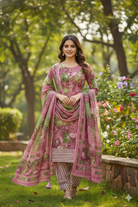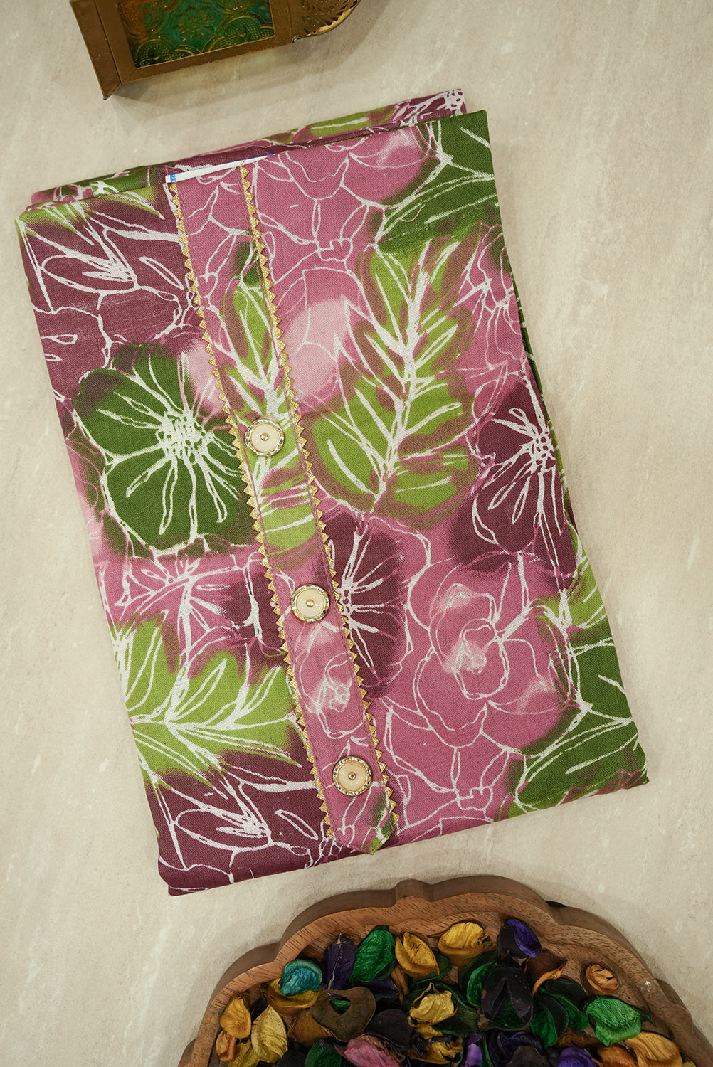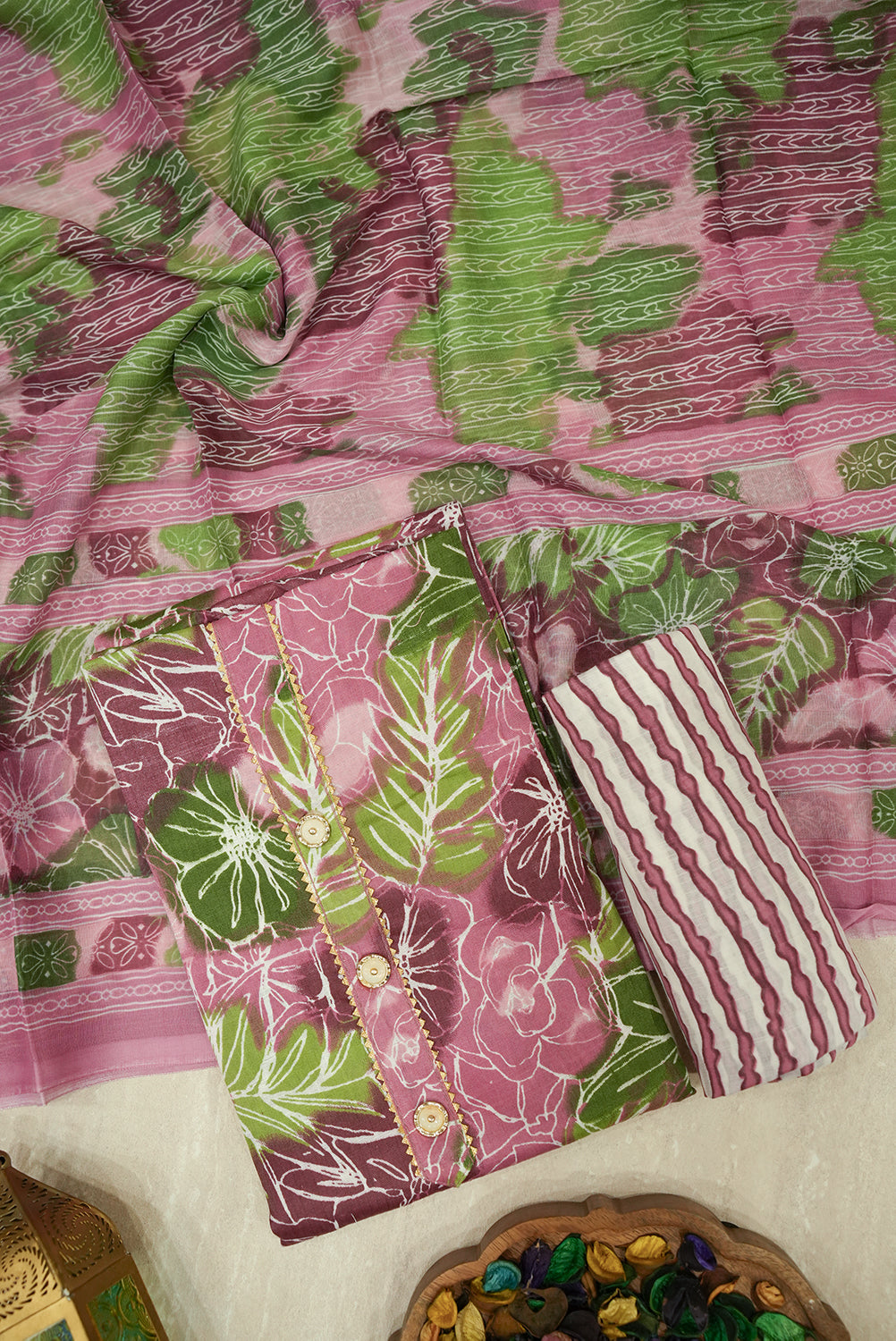 Elevate your wardrobe with this lovely pink and green printed salwar suit. The cotton fabric is adorned with a mix of leafy and floral patterns in green and maroonish-pink hues. The set includes a patterned kurta with subtle gold buttons, a matching printed dupatta, and a striped bottom fabric.