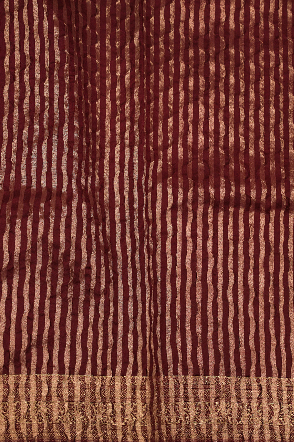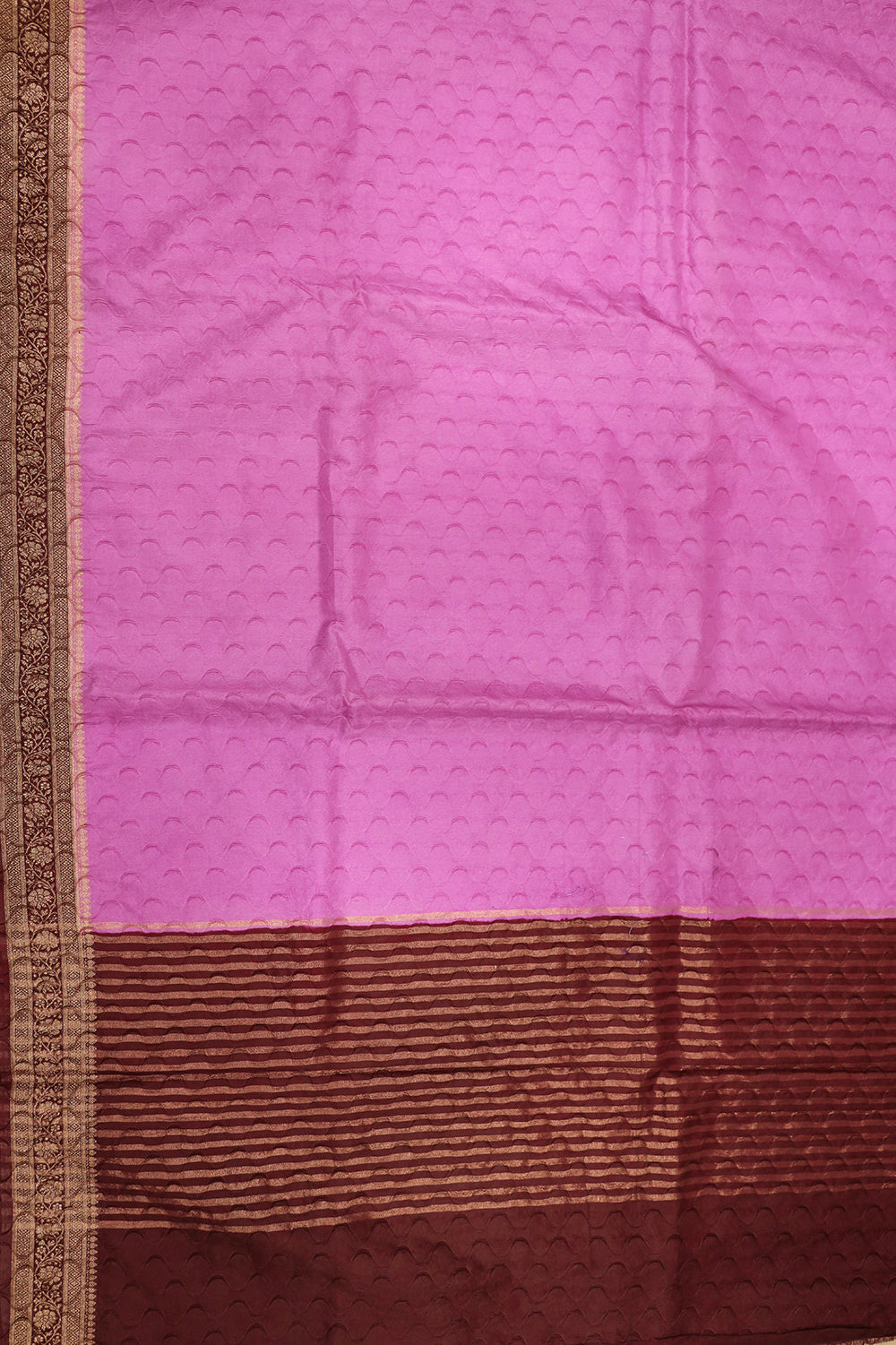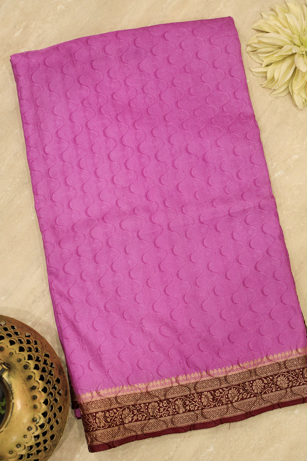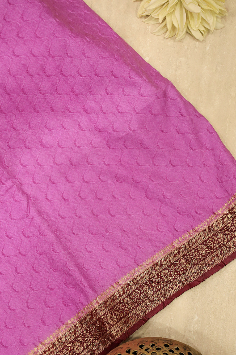 Embrace timeless elegance with this beautiful magenta Banarasi saree. The body features a unique self-embossed wavy pattern for a textured look. A traditional, deep-toned border with intricate golden zari work completes this classic piece. Unstitched blouse attached.