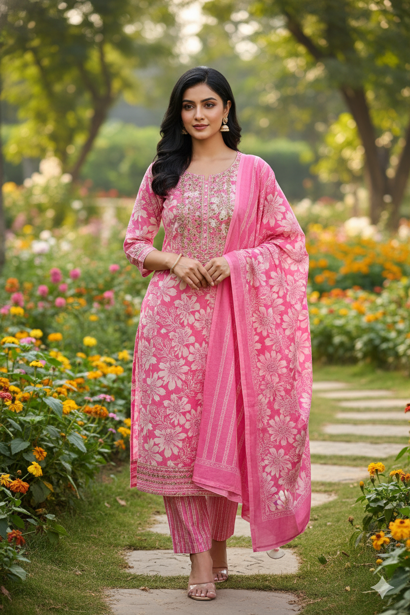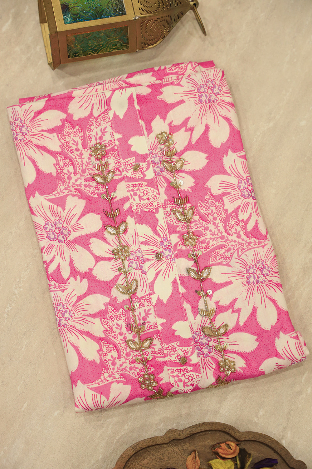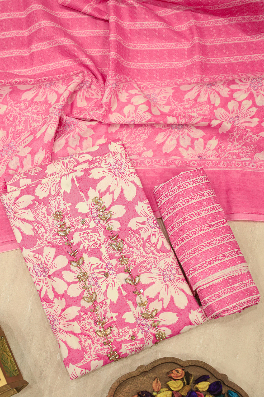 Look pretty in pink with this delightful unstitched salwar suit material, perfect for daytime celebrations and festive gatherings. Its cheerful colour and graceful blend of prints and embroidery make it a wonderful choice for the auspicious Aadi month festivities in Madurai.