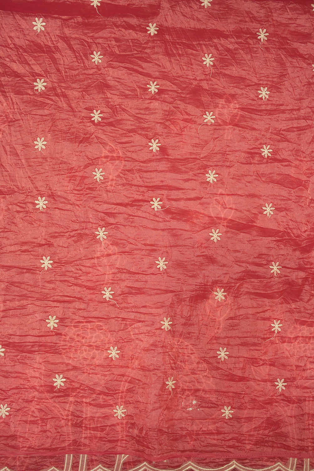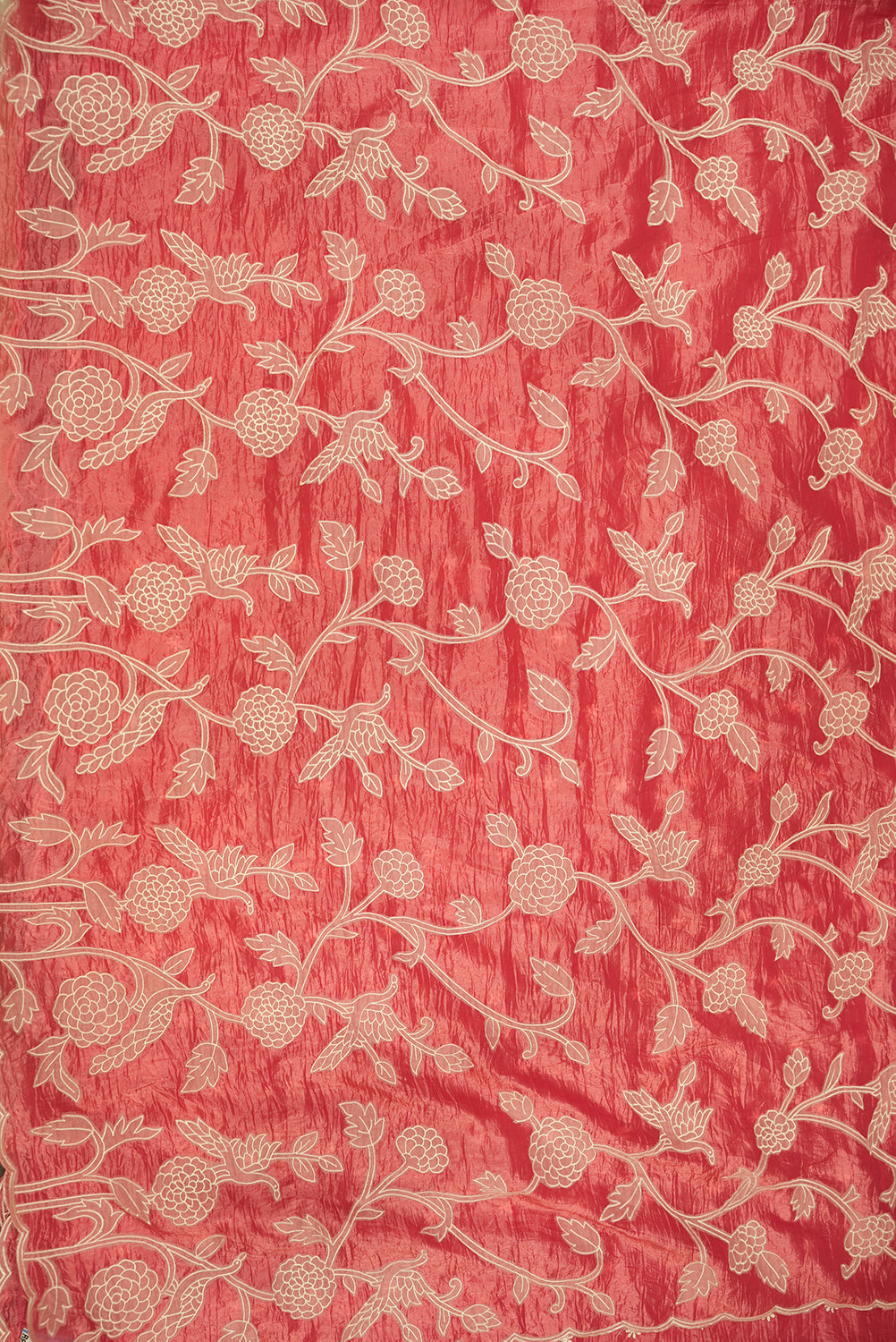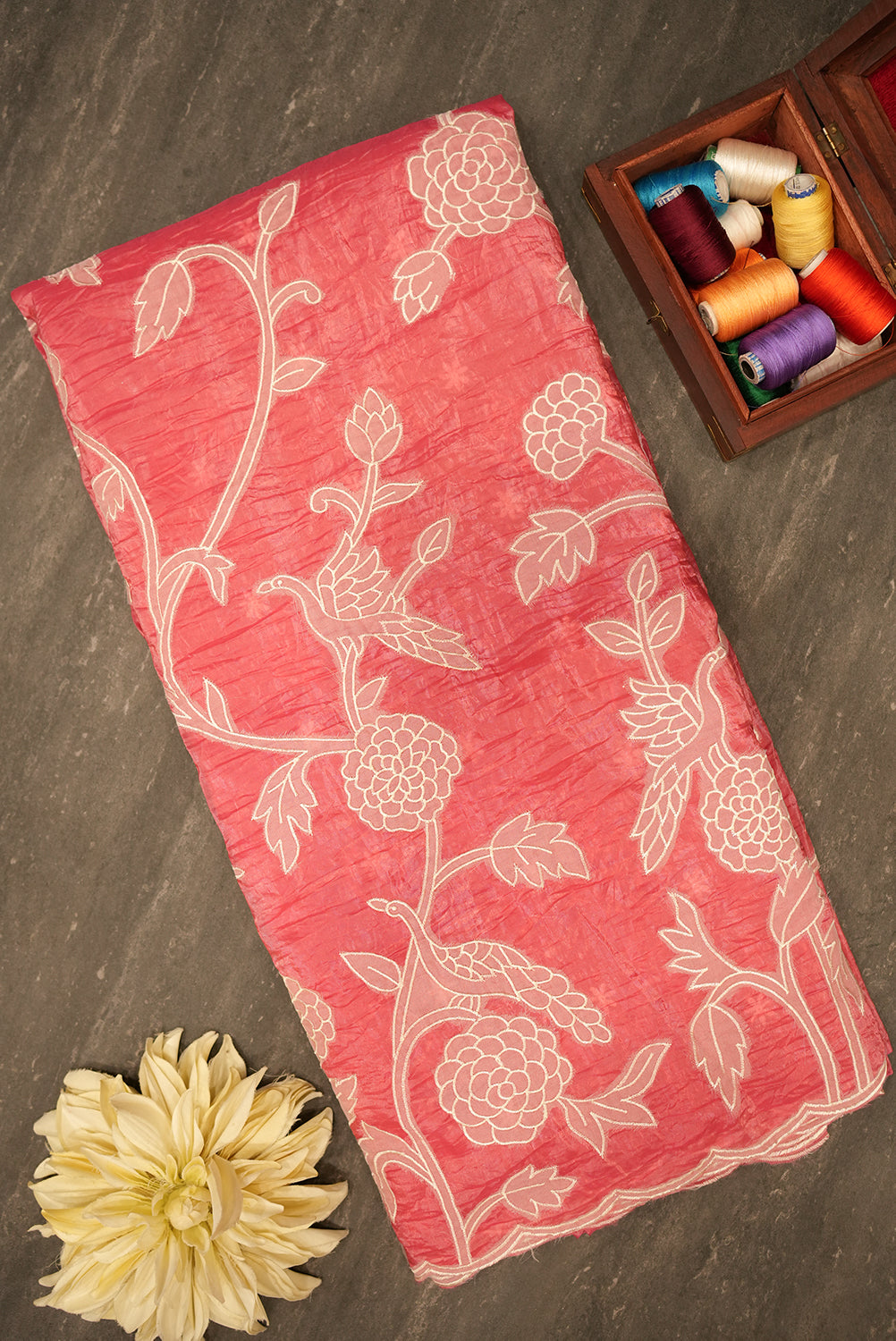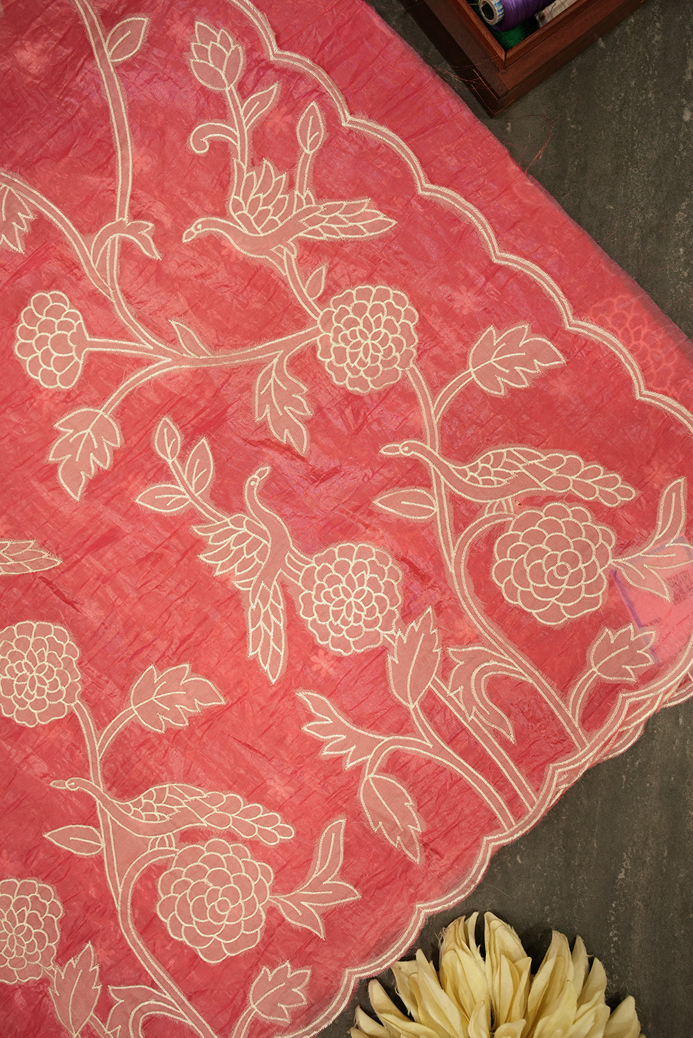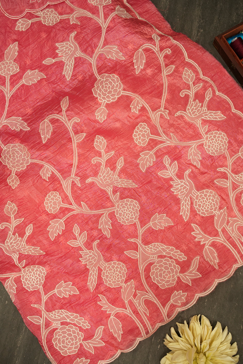 Drape yourself in sophistication with this pink Jimmy Choo saree, adorned with delicate white thread embroidery featuring floral and bird motifs. Perfect for festive occasions and elegant gatherings. Unstitched blouse attached.