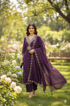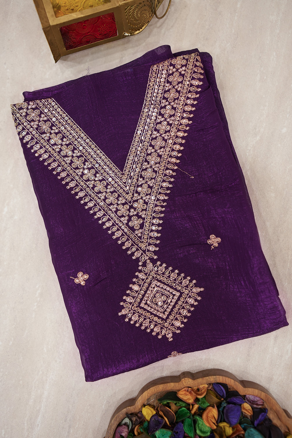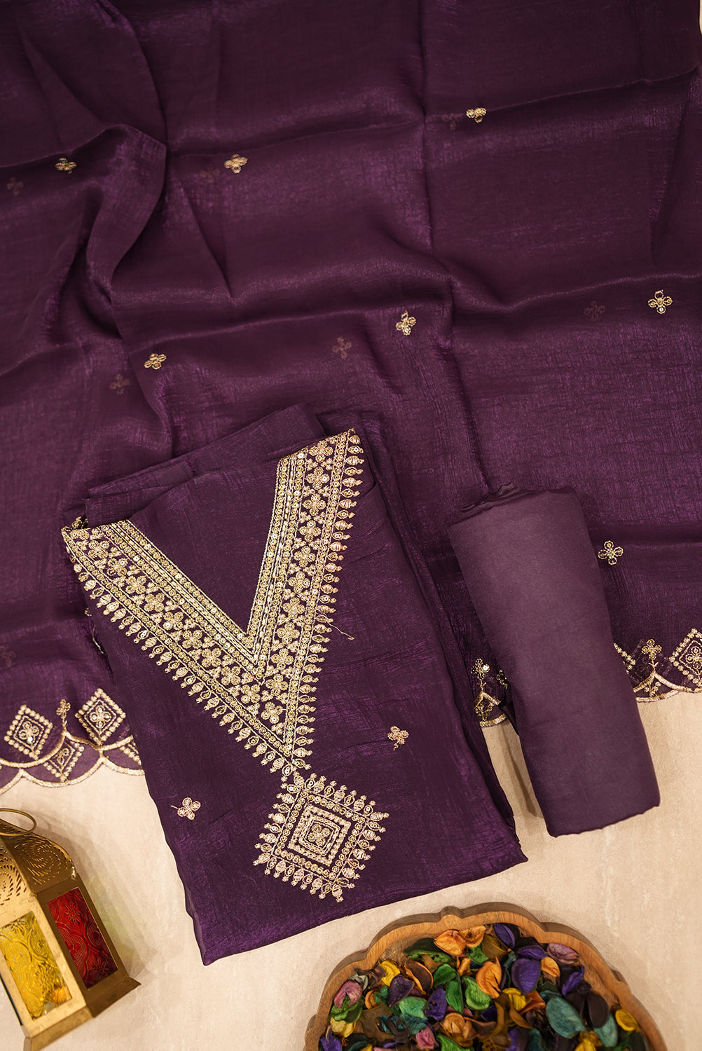 This unstitched three-piece salwar suit set exudes regal elegance and sophistication. The kurta (top) features an ornate, deeply embroidered neckline in shimmering gold zari, with a beautiful geometric motif. The set includes a matching solid purple salwar (pant) and a flowing, lightly textured dupatta (scarf) with scattered gold motifs and an elegant embroidered border. This luxurious ensemble is perfect for weddings, festive occasions, or any formal event where you want to make a grand statement.