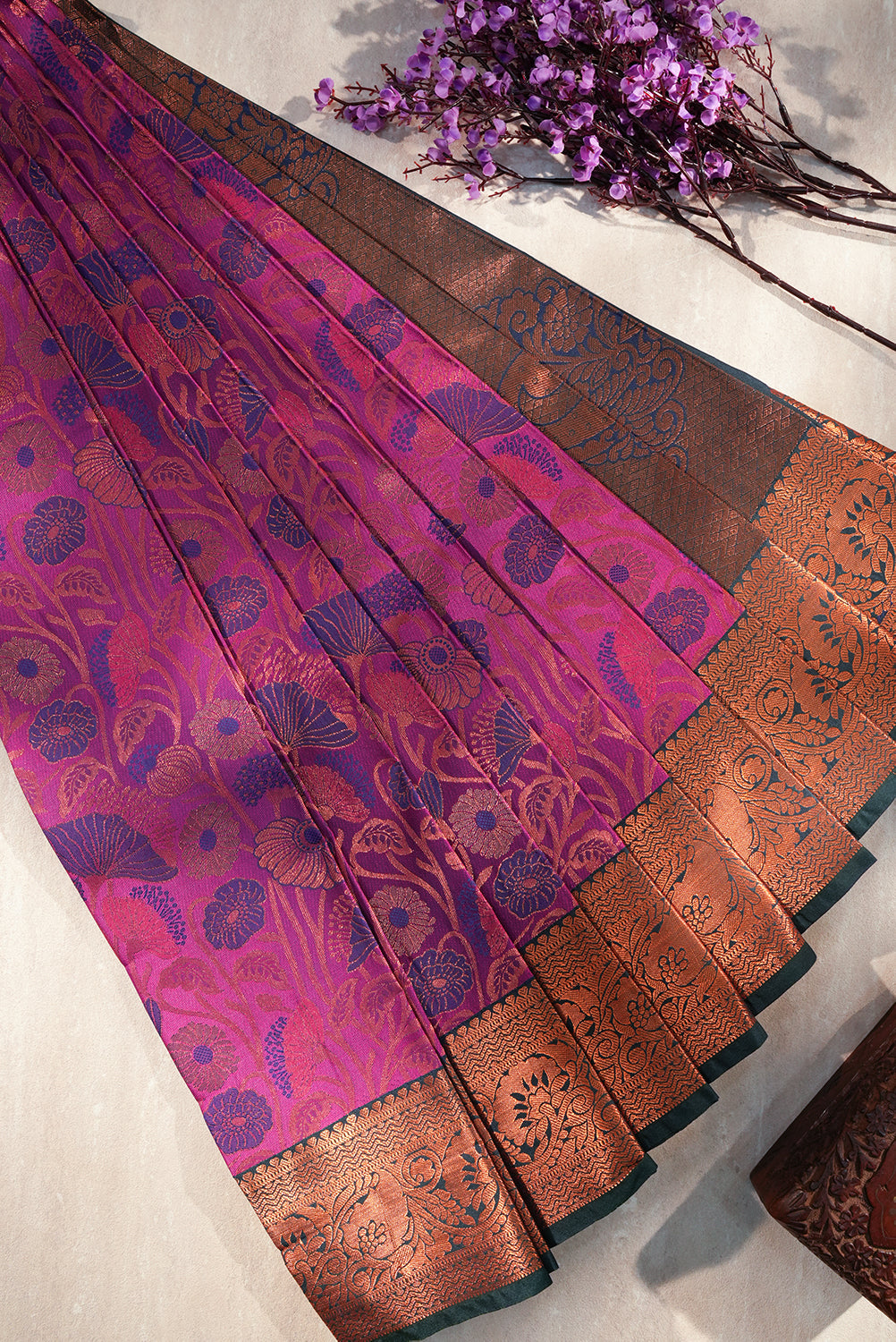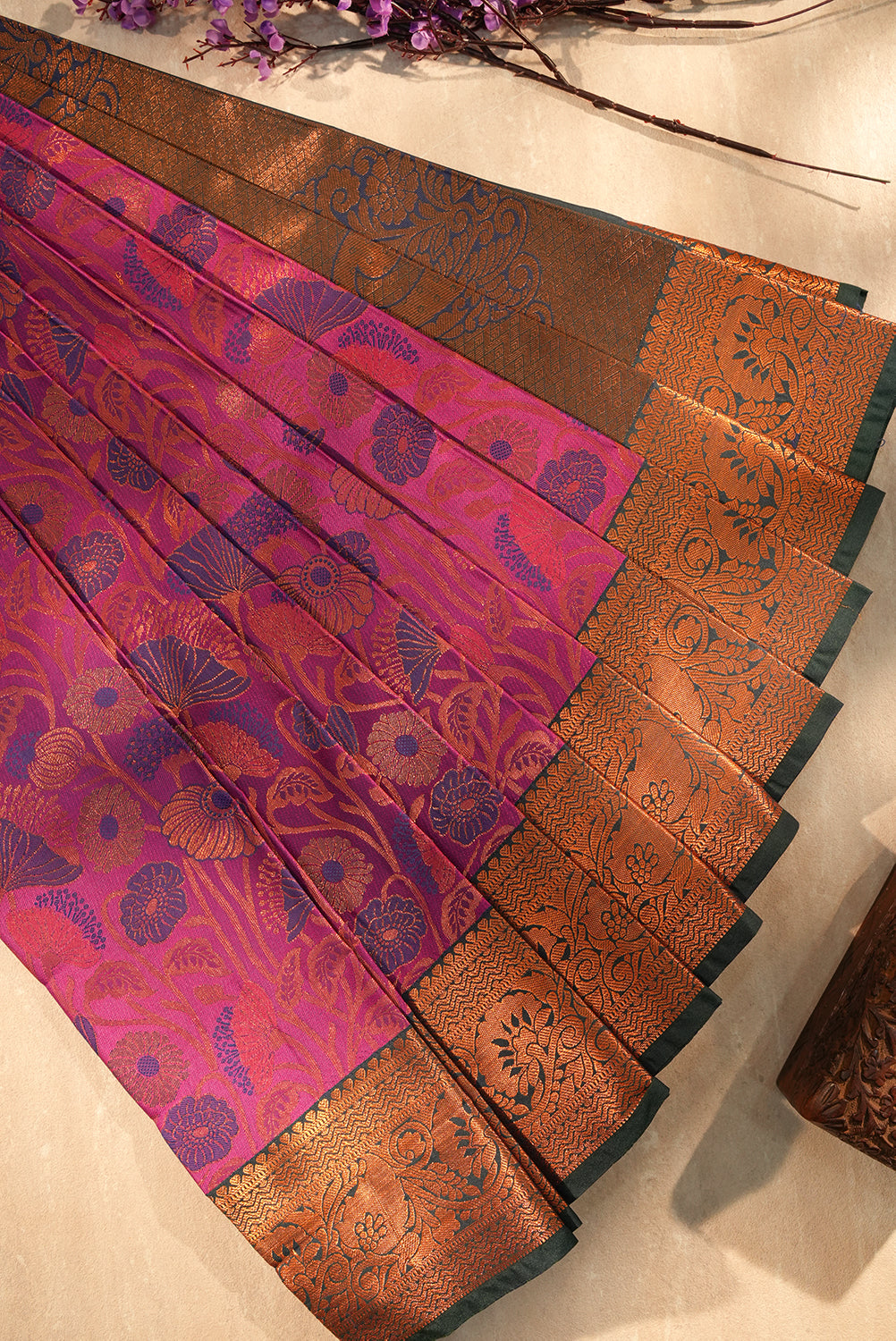 Radiant Magenta Silk Saree with Copper Zari Floral Motifs
