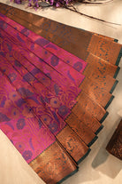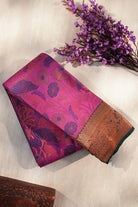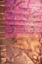 A stunning magenta pink silk saree featuring large, intricate floral patterns woven in violet and copper zari. Finished with a rich, antique copper border, this drape offers a perfect blend of vibrancy and tradition. Unstitched blouse attached.