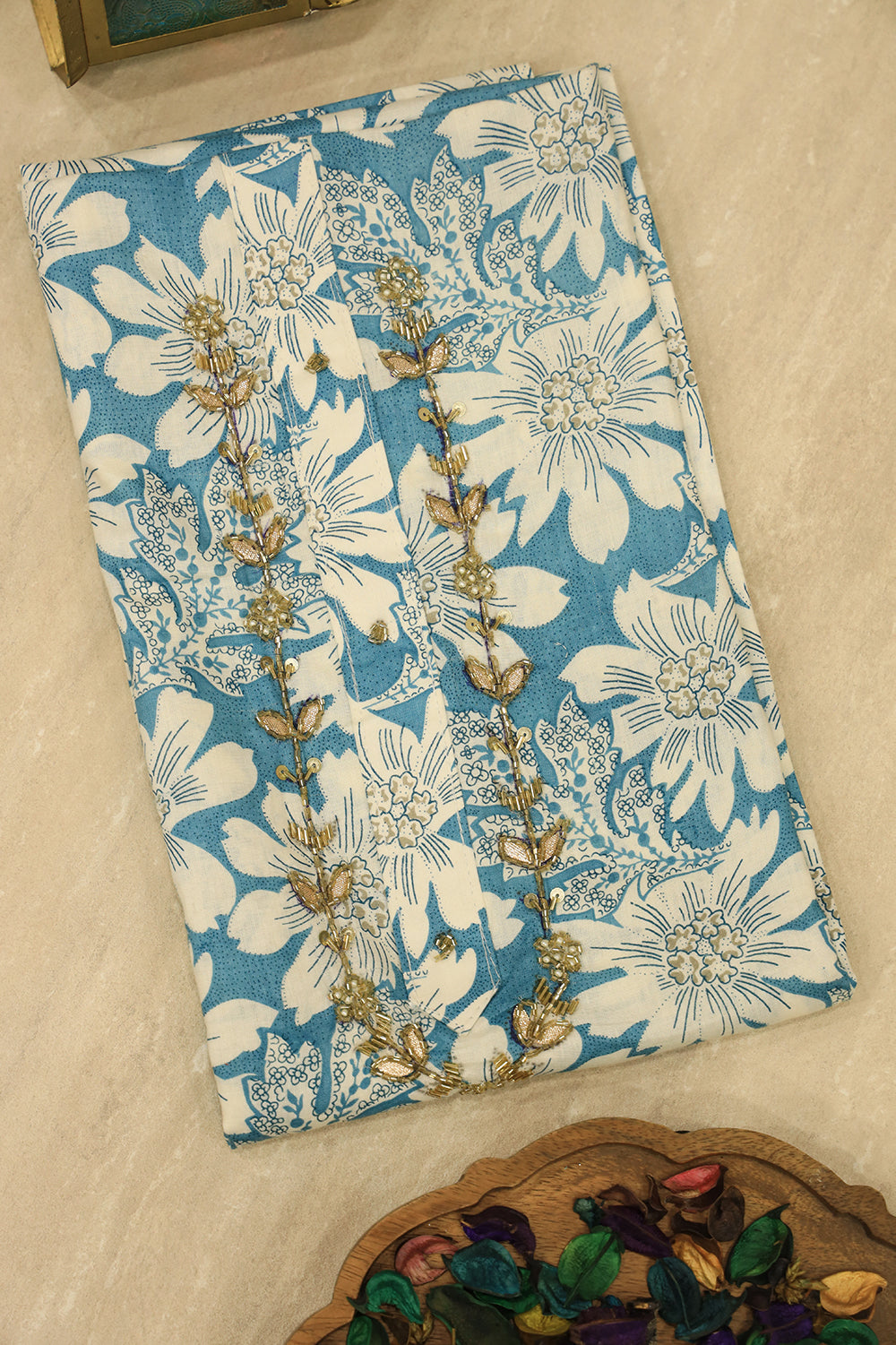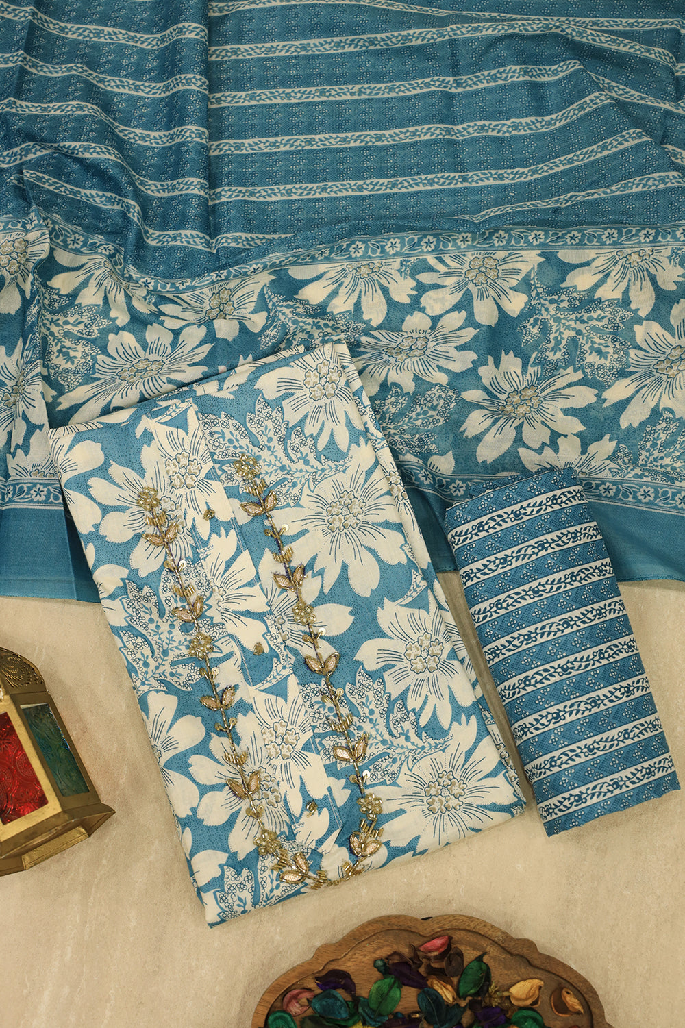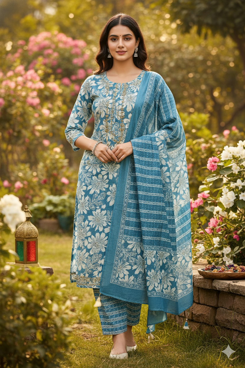Look as cool and fresh as a summer sky with this beautiful unstitched salwar suit material. Its calming colour palette and graceful mix of floral prints and delicate embroidery make it a perfect choice for daytime events, temple visits, and casual gatherings during the auspicious Aadi month.