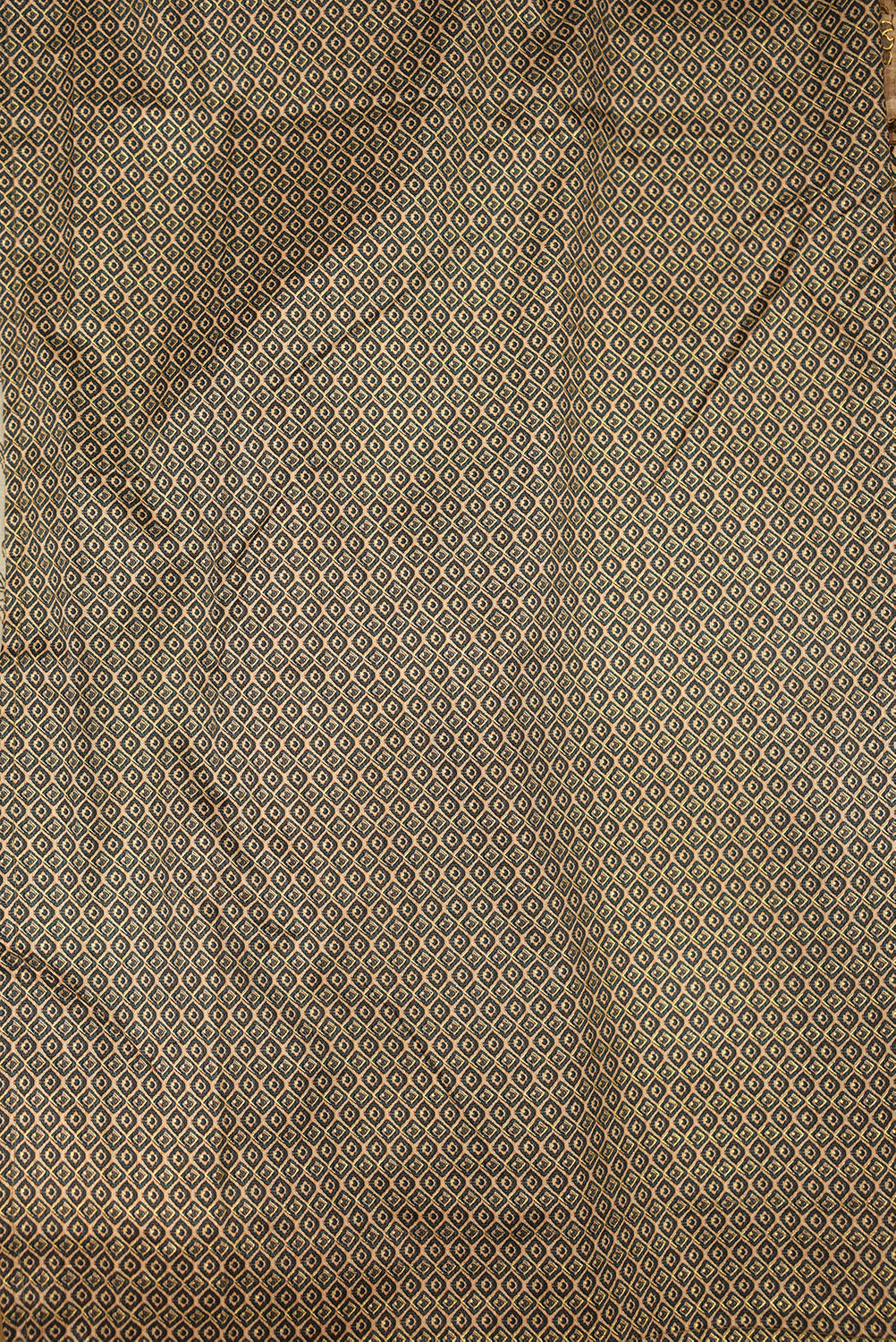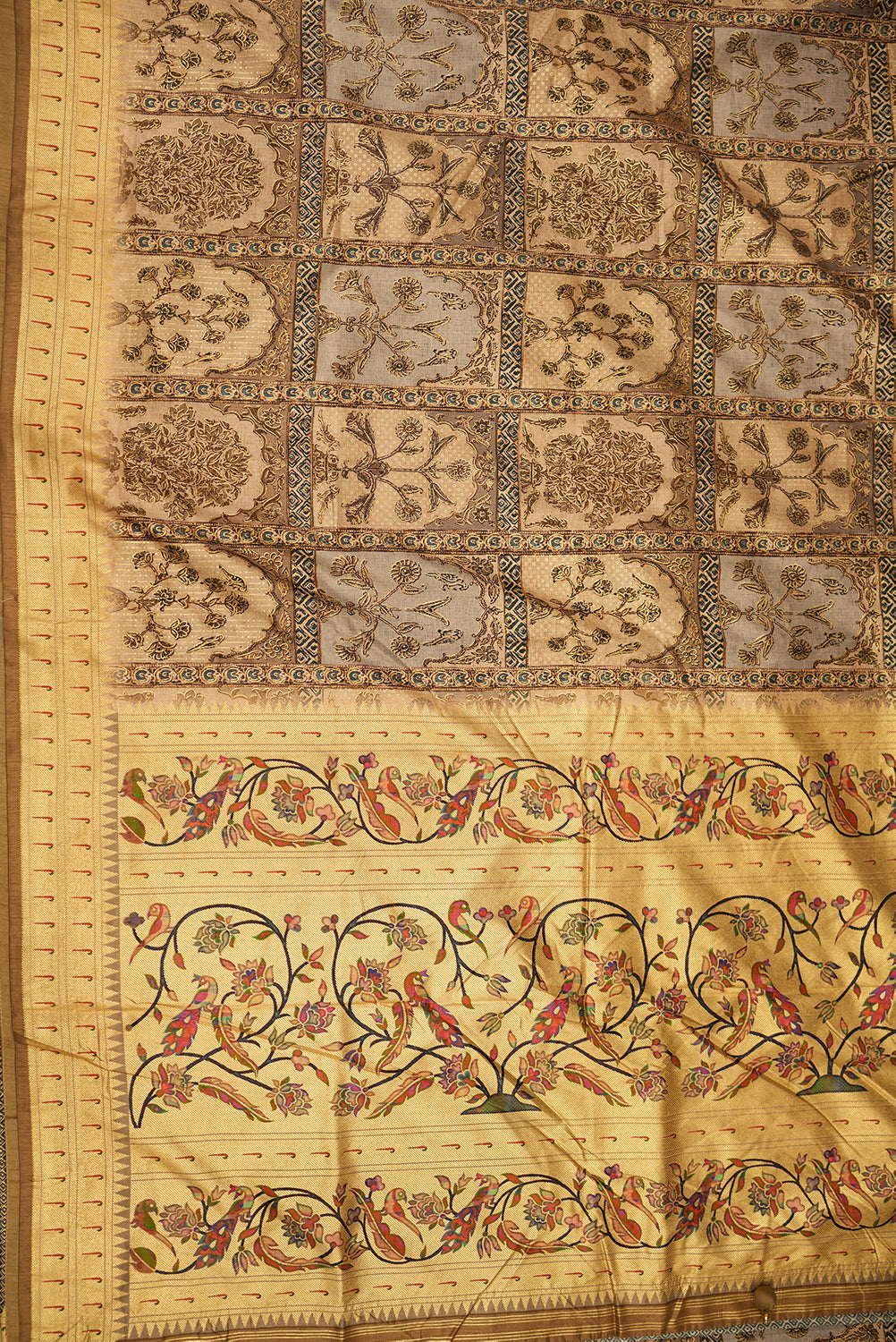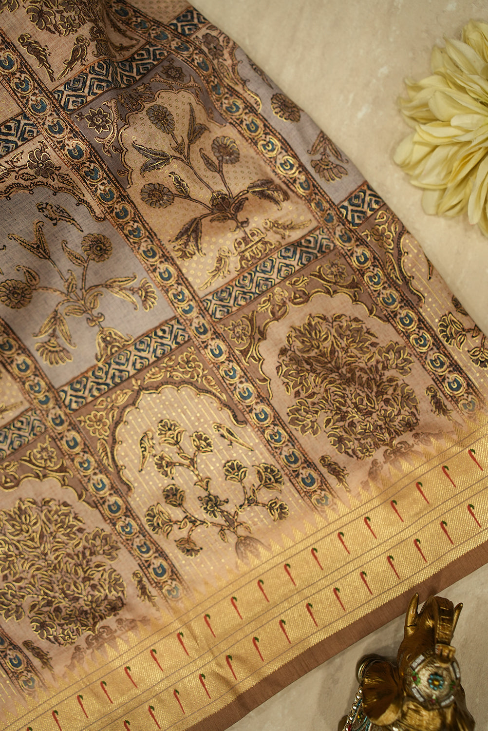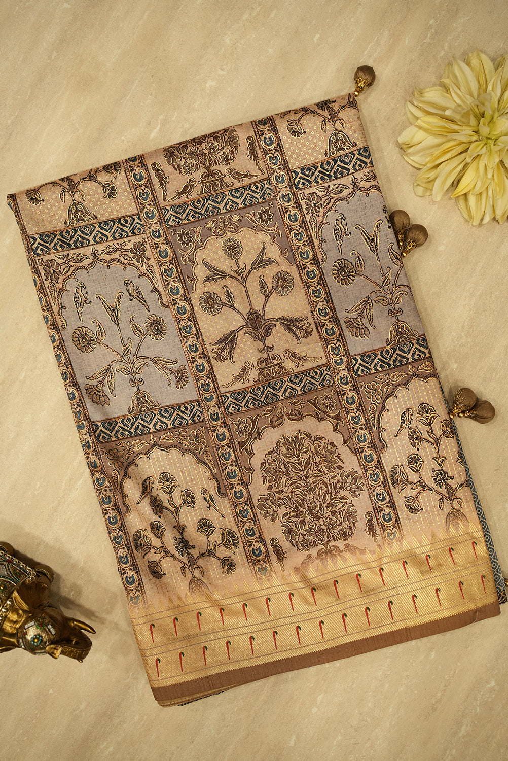 This elegant raw silk saree features a sophisticated beige and gray base adorned with an intricate Mughal-inspired print. The design is a series of beautiful panels, each showcasing traditional motifs like floral vases and birds, with a subtle mix of brown, green, and blue tones. The saree is finished with a stunning golden zari border featuring a traditional hook pattern. This exquisite piece is a perfect choice for weddings, festive occasions, and special events.