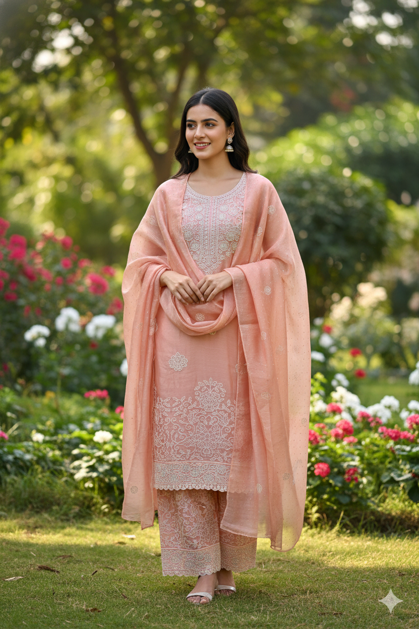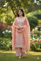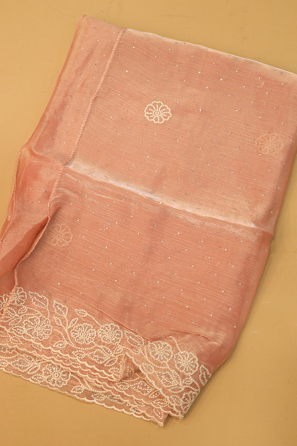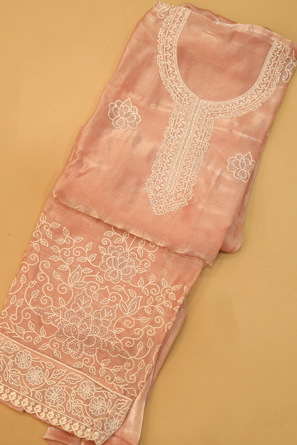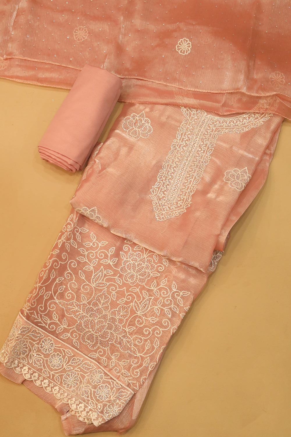 Rose Gold Tissue Salwar Material having a wonderful embroidered floral with stone work pattern design. Rose Gold color lovely embroidered dupatta.