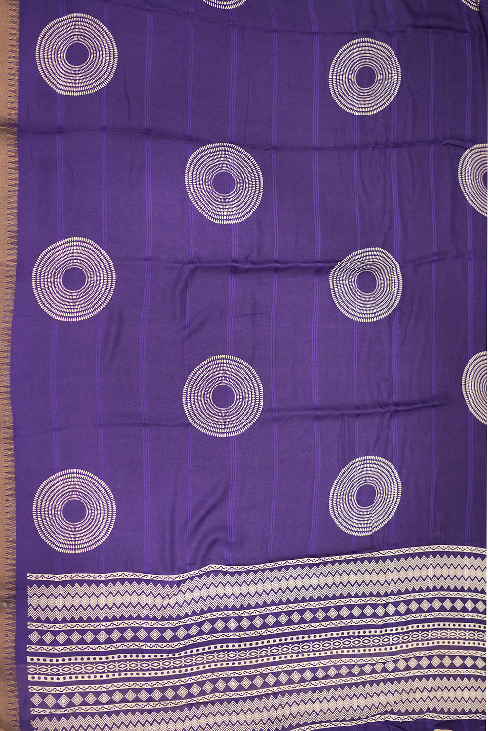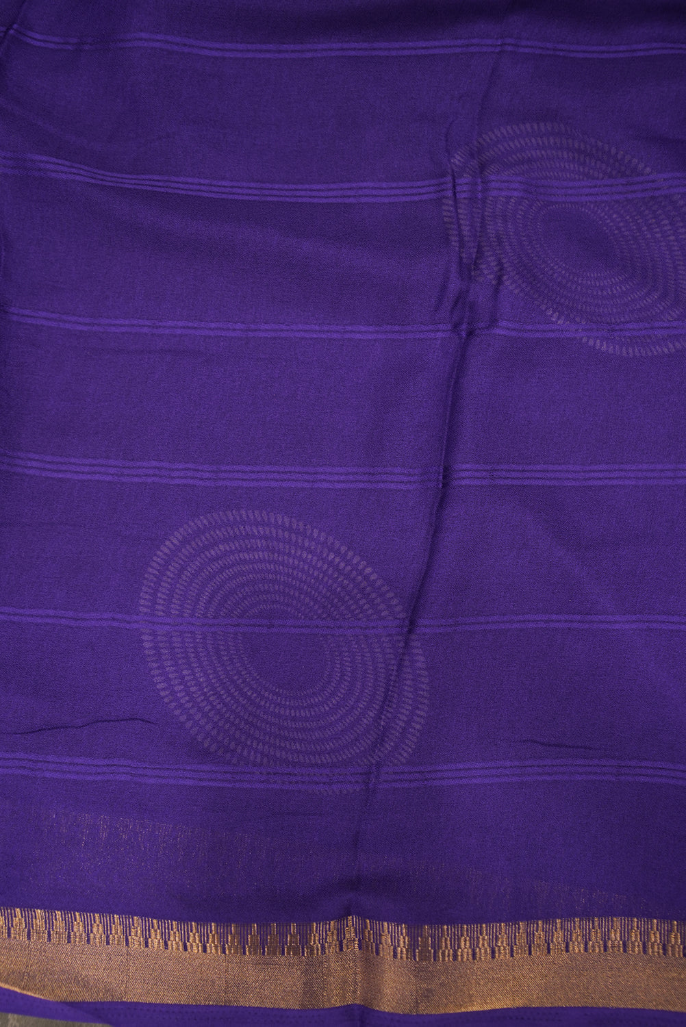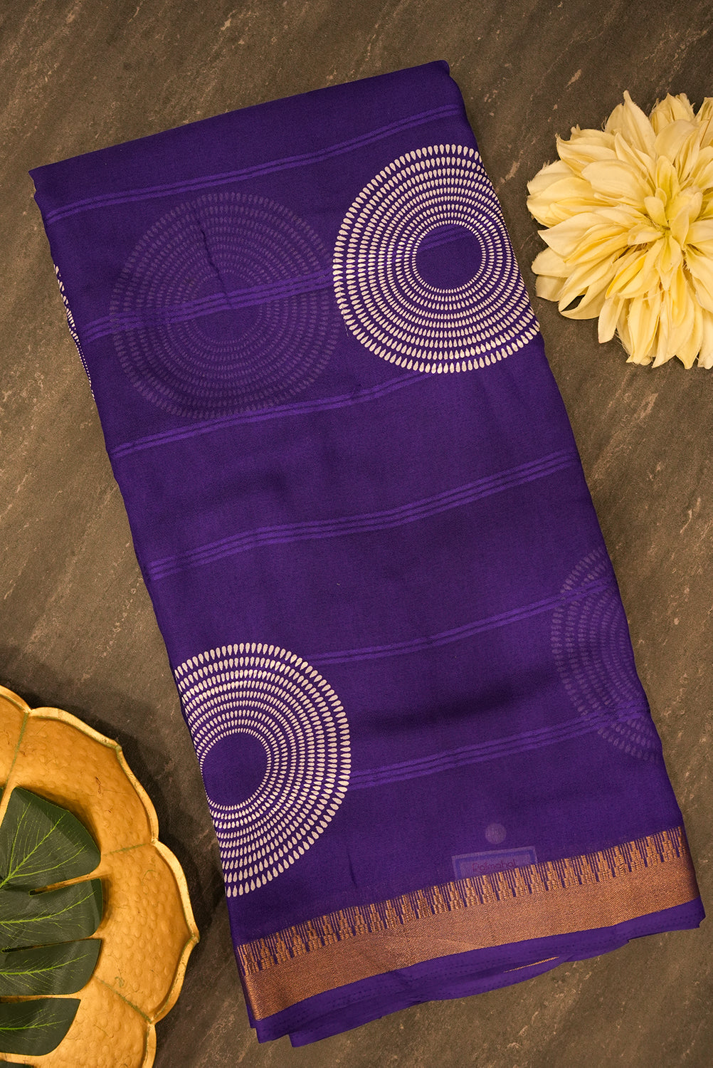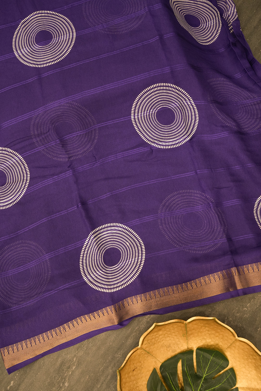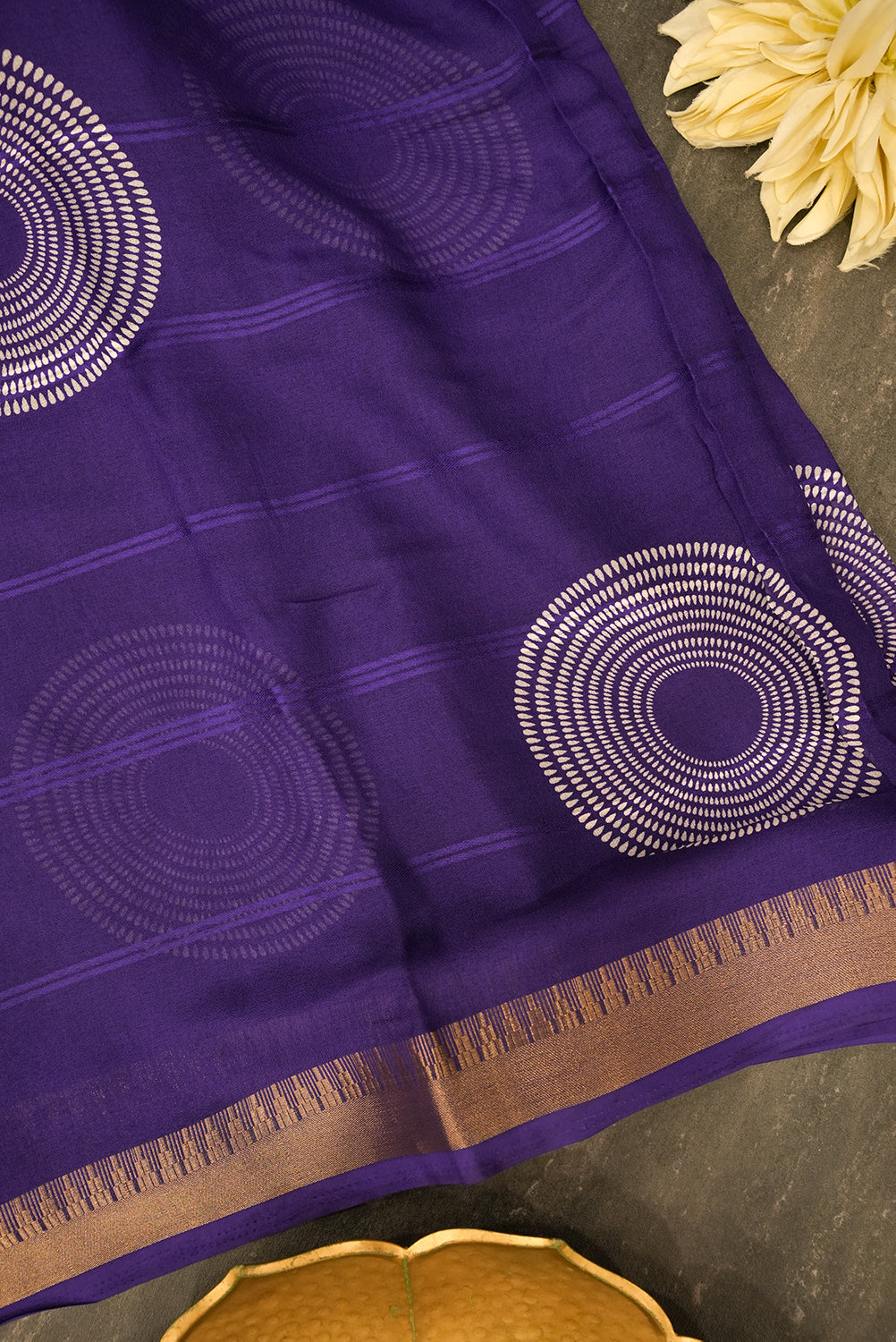 This striking chiffon saree features a deep royal purple body, giving it a rich and majestic feel. The fabric is adorned with a modern circular pattern in a light, contrasting color, creating a contemporary and stylish look. The saree is finished with a traditional golden zari border, which adds a touch of classic elegance. This versatile saree is a perfect blend of modern design and traditional elements, making it suitable for both festive events and sophisticated evening wear.
