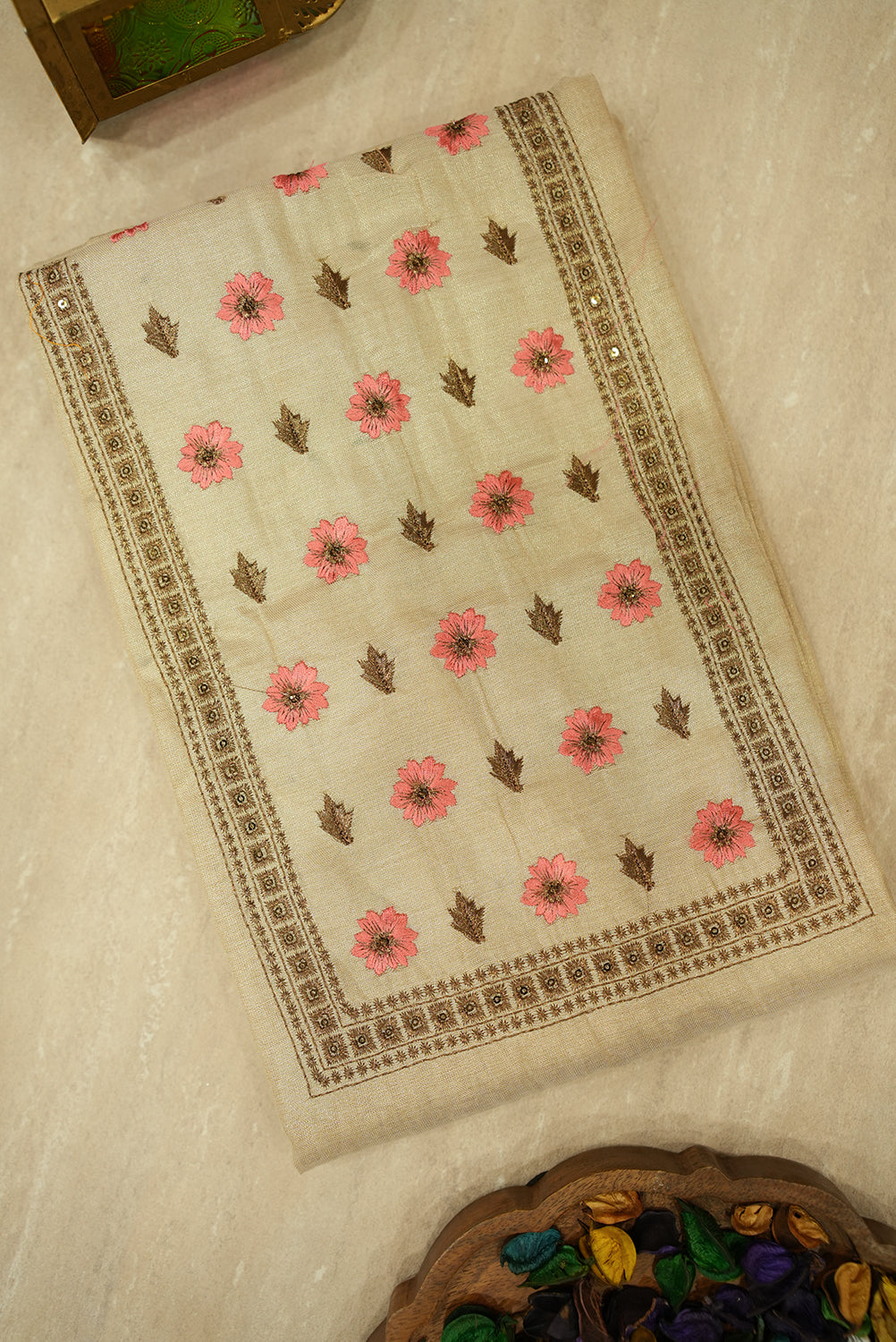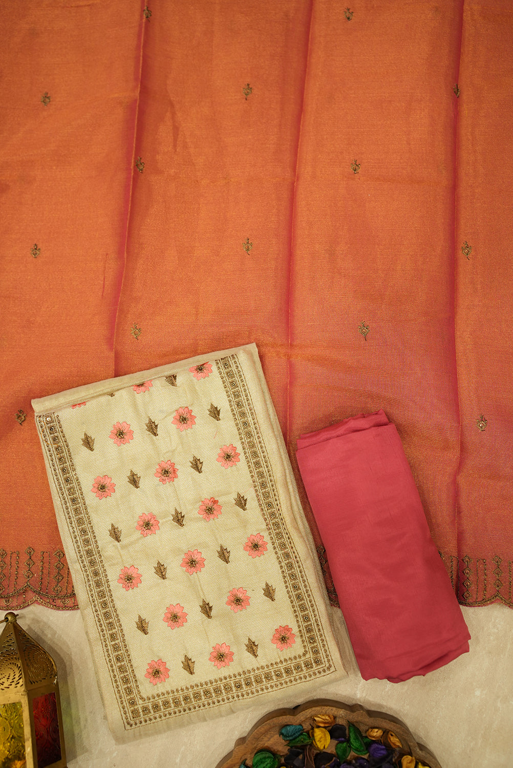 This unstitched three-piece salwar suit set offers a beautiful mix of earthy tones and delicate embellishments. The kurta (top) has a soft, light base fabric with a central panel featuring a charming pink floral print and a detailed border. It's paired with a contrasting solid pink salwar (pant). The highlight of the ensemble is the sheer, flowing dupatta (scarf), which is a rich burnt orange color, with intricate embroidered motifs and a beautifully scalloped border. This elegant and sophisticated set is perfect for both festive occasions and semi-formal gatherings.