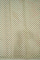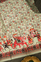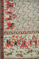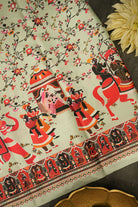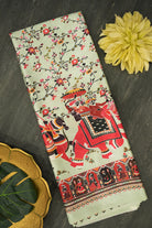 This striking semi-satin tussar saree features a muted sage green body with delicate floral branches in soft pink and orange. The lower half of the saree is adorned with a vibrant, intricate print of a royal procession with an elephant and horse in bold reds and oranges. The border features a traditional depiction of dancing figures, all in a beautiful array of complementary colors. This artistic and lightweight saree is perfect for those who want to blend traditional motifs with a modern color palette for special events.