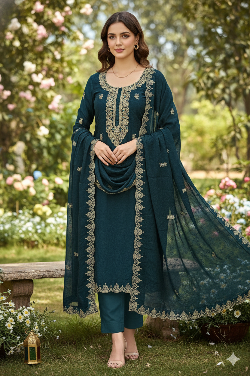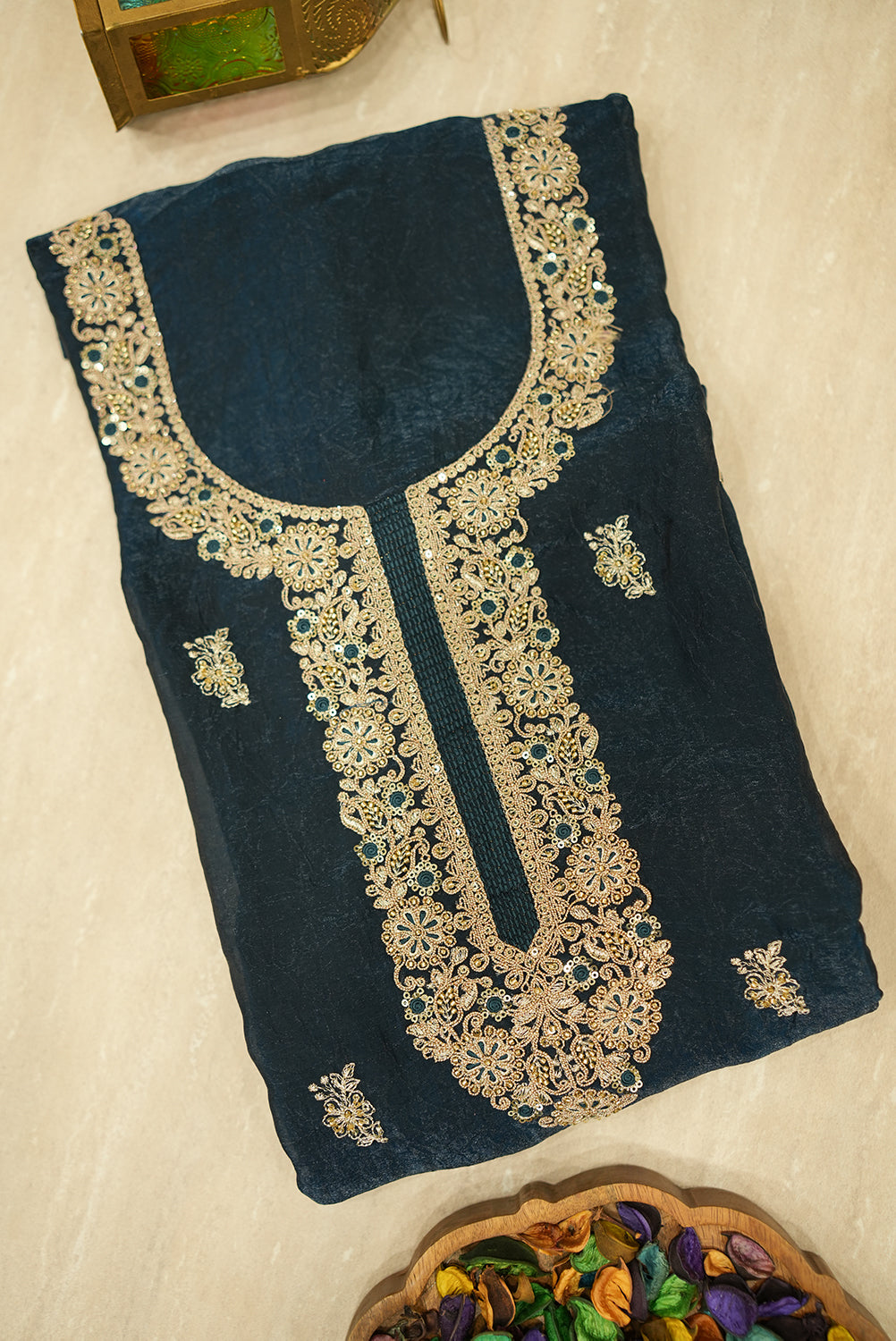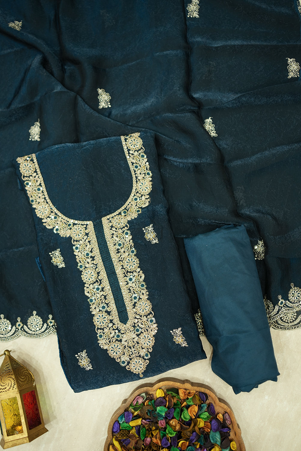 This unstitched three-piece salwar suit set exudes opulence and intricate craftsmanship. The rich, deep teal kurta (top) features an elaborately embroidered neckline in shimmering gold zari, accented with delicate sequins and beads. The set includes a matching solid teal salwar (pant) and a flowing, lightly textured dupatta (scarf) that complements the top with its own intricate embroidery along the border and scattered motifs. This luxurious ensemble is perfect for weddings, festive occasions, or any grand celebration.