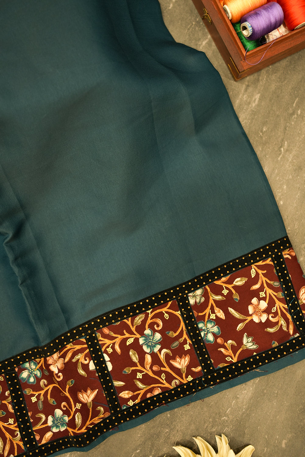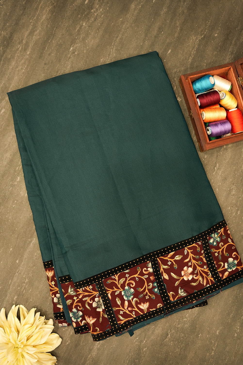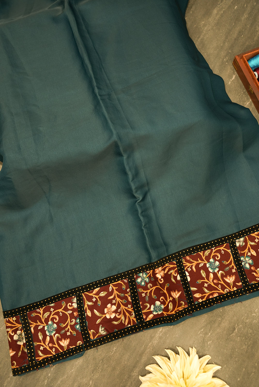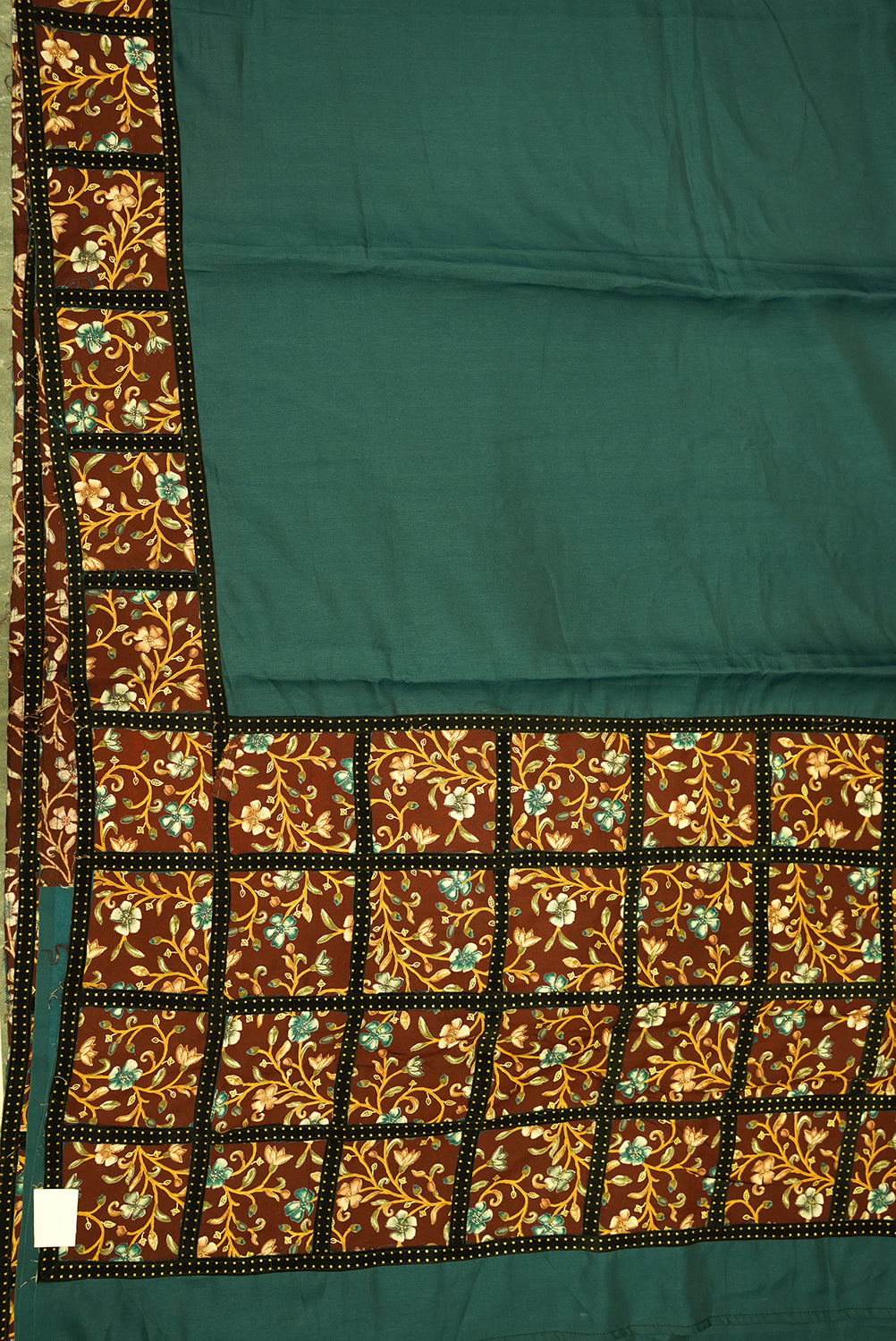 An elegant tussar silk saree in a captivating teal green. The intricate borders and pallu are adorned with a detailed floral pattern in shades of dark brown and cream, creating a beautiful contrast against the solid-colored body. Unstitched blouse attached.