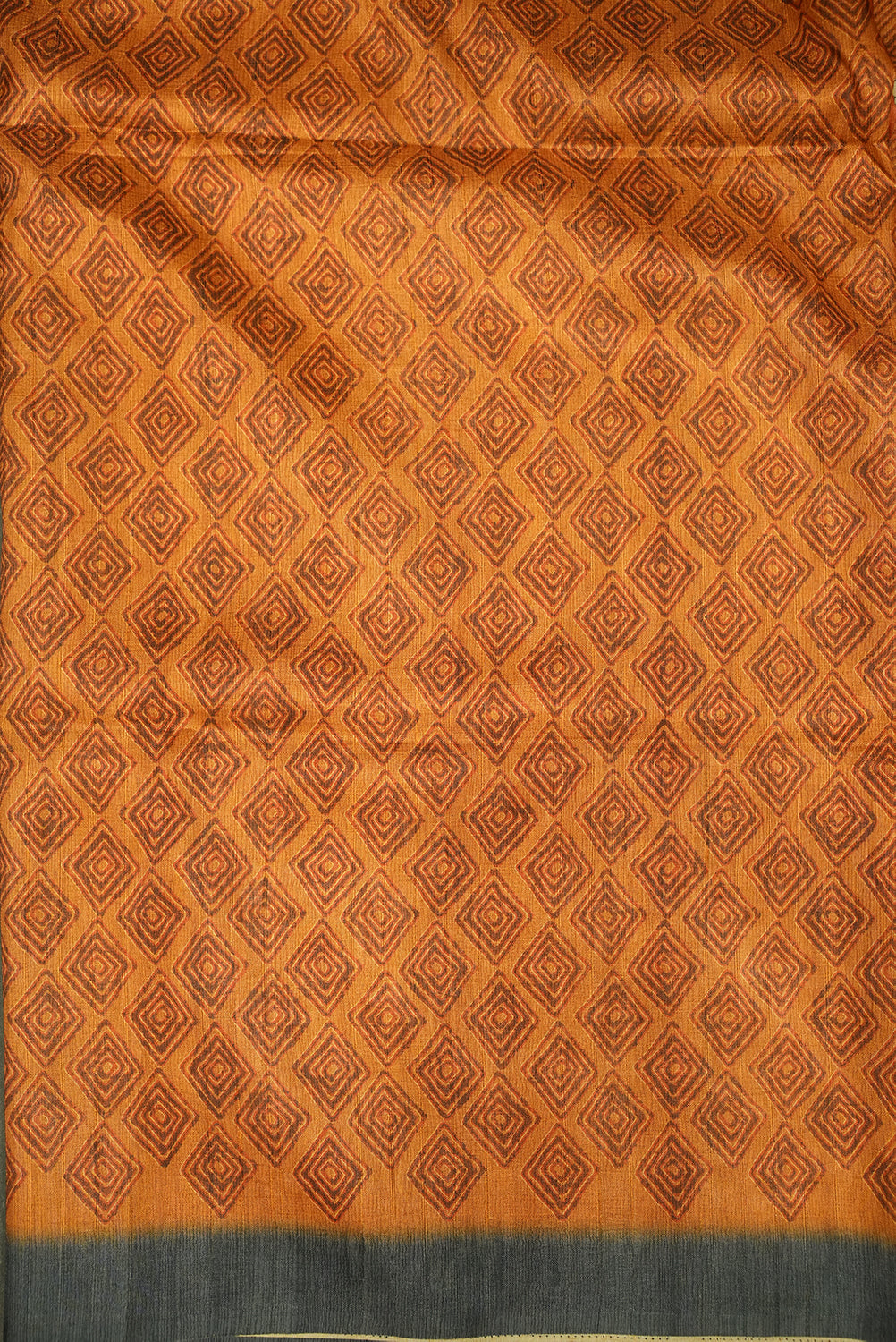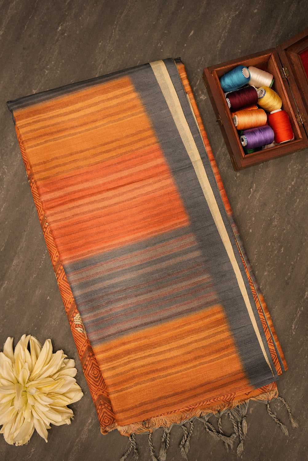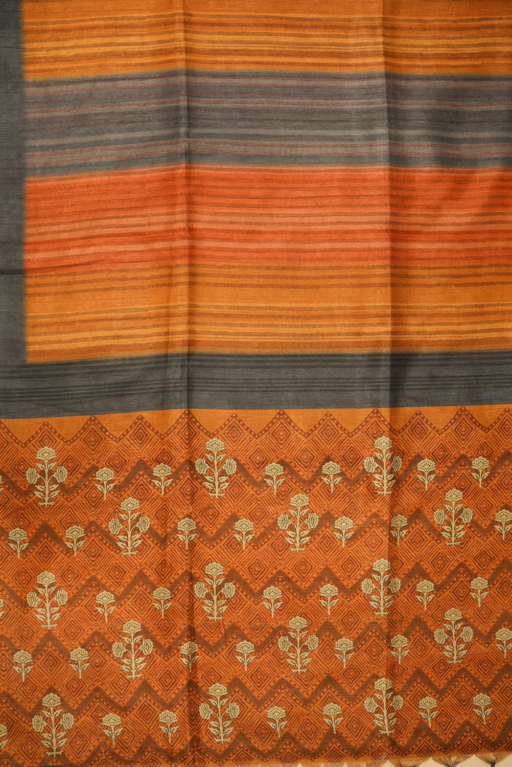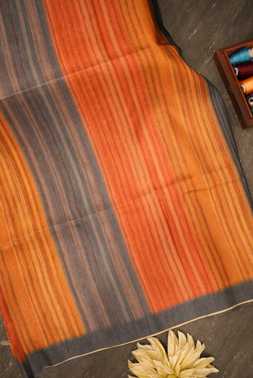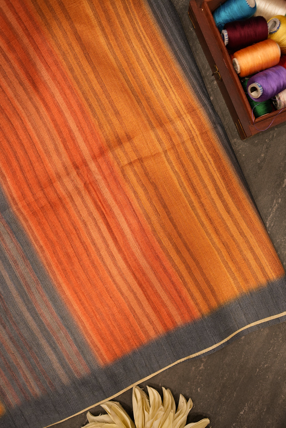 This lightweight Tussar silk saree features a beautiful striped pattern in shades of fiery orange and muted charcoal grey. A perfect drape for any occasion, its soft texture and earthy tones create a timeless look. The subtle color variations mimic the hues of a stunning sunset. Unstitched blouse attached.