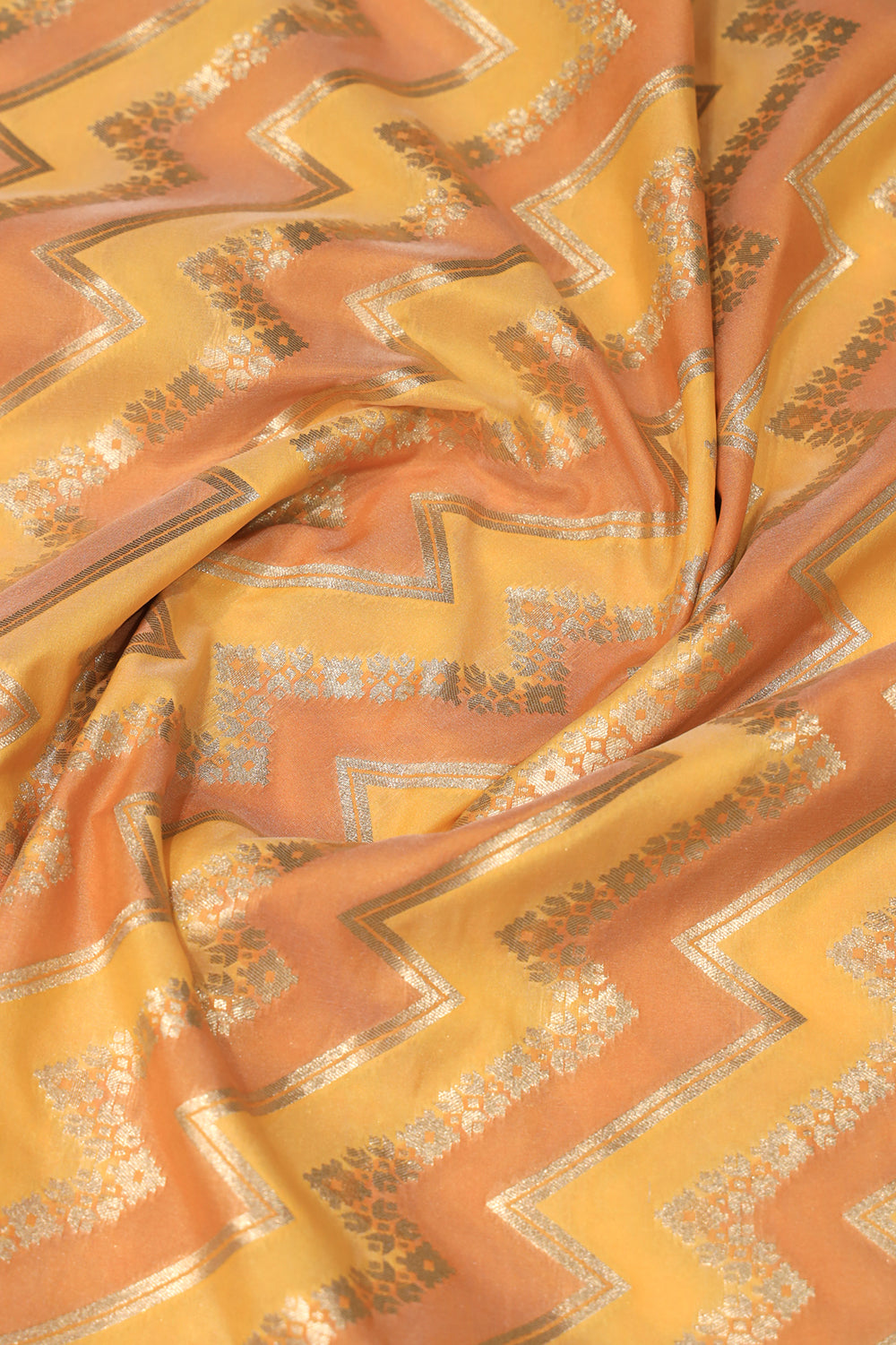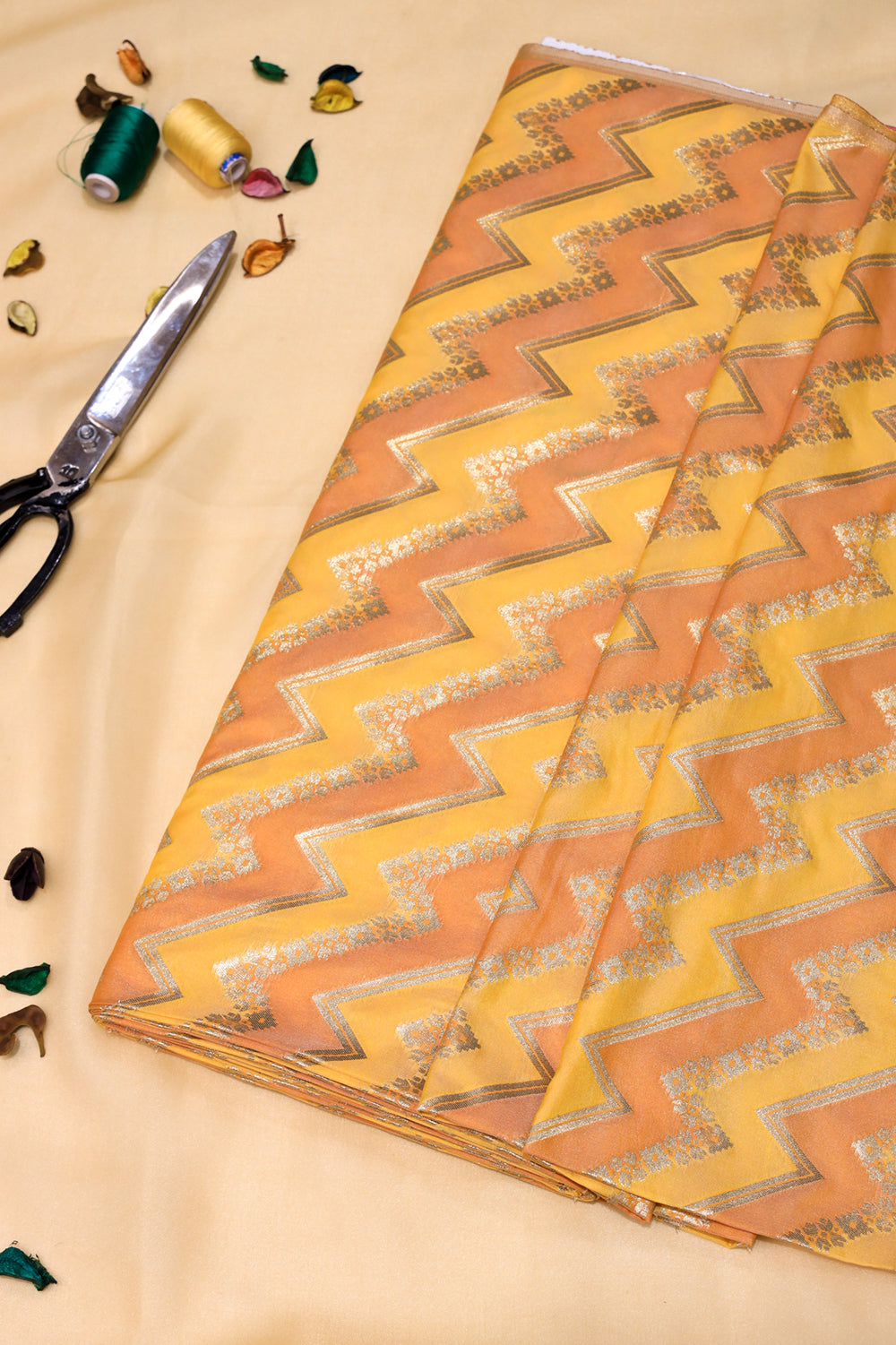 This is a yellow Banarasi silk fabric featuring a striking zig-zag pattern with a subtle gold tint, offering a luxurious and eye-catching texture.