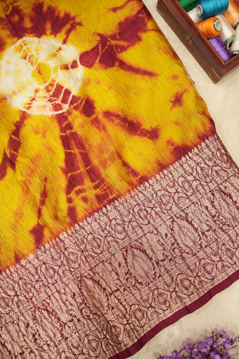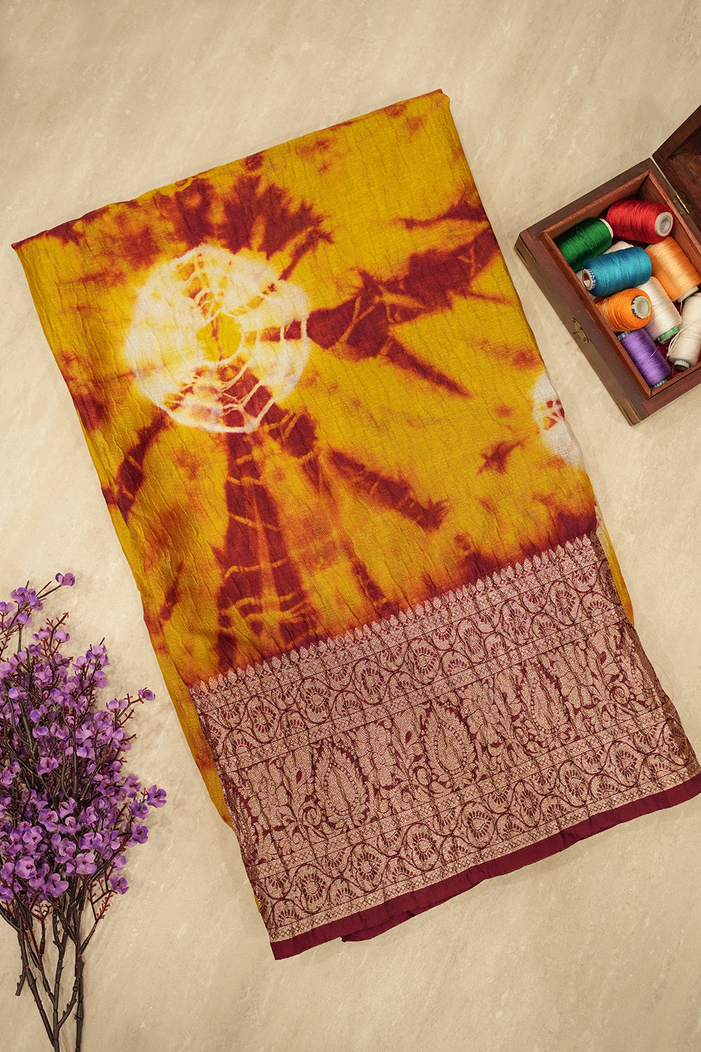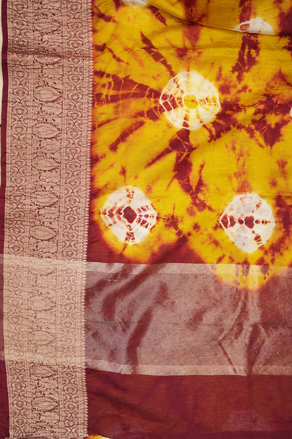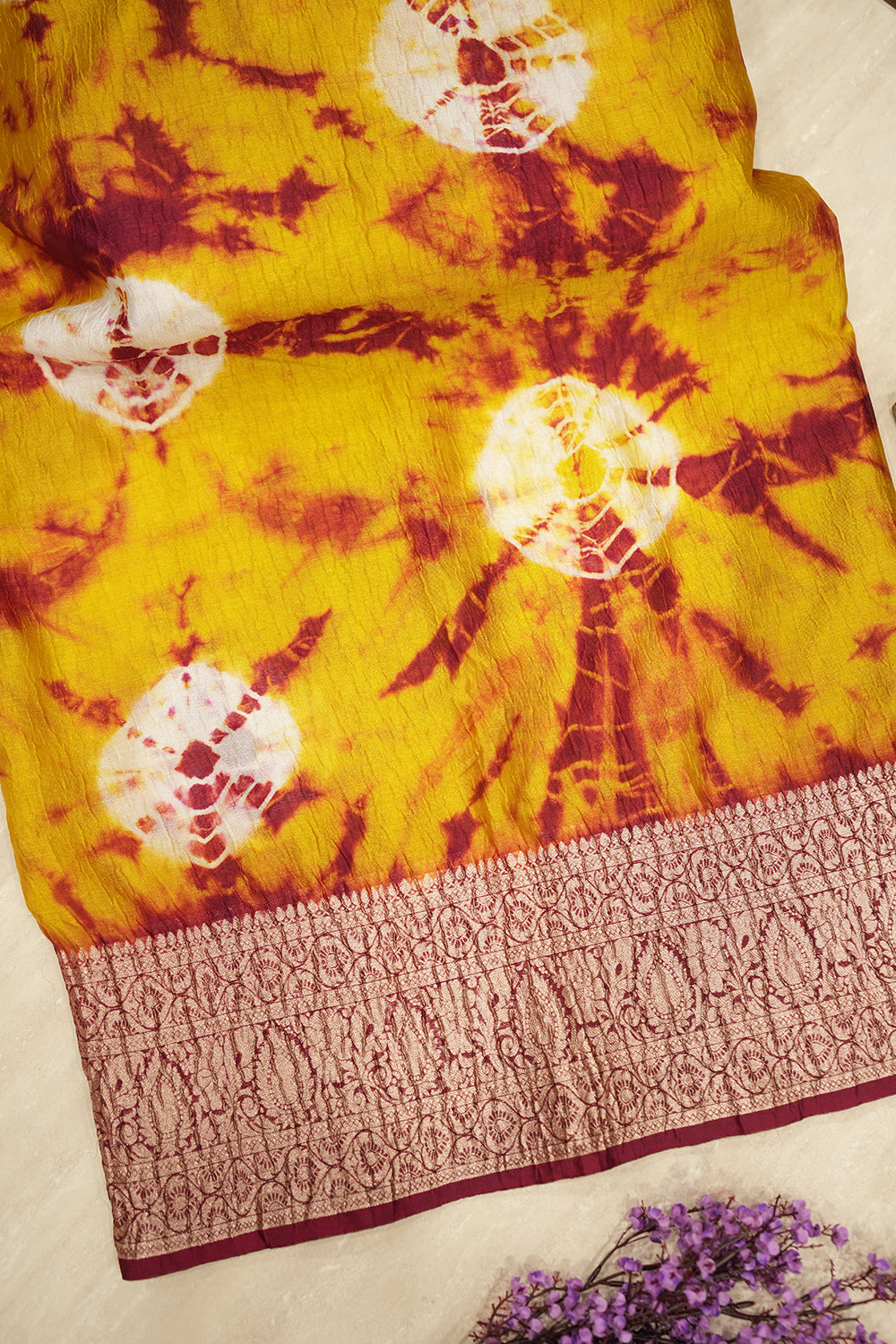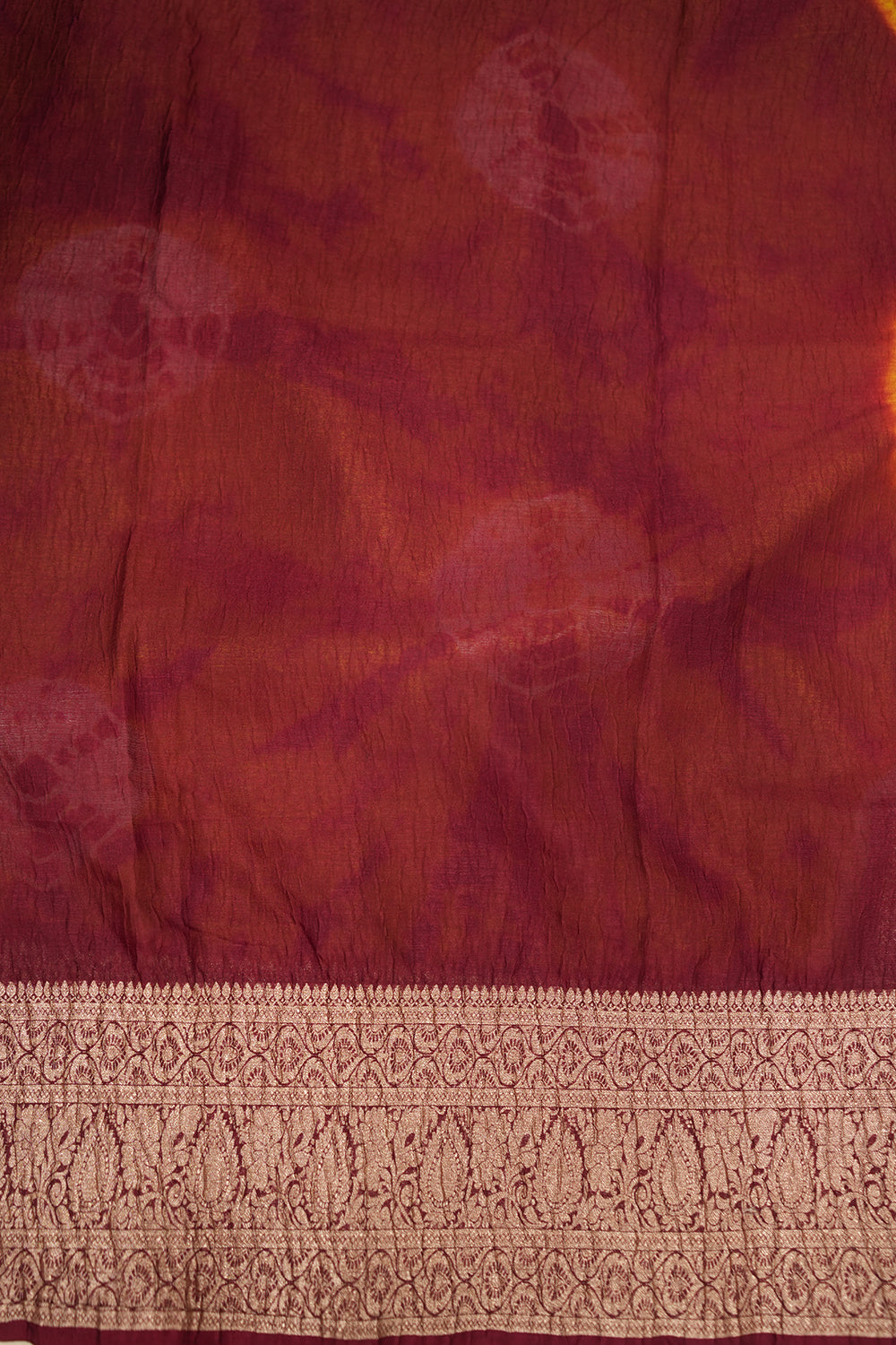 Discover this captivating crushed tissue saree, blending warm yellow hues with bold maroon abstract patterns. Its elegant maroon border features classic design work. Unstitched blouse attached.