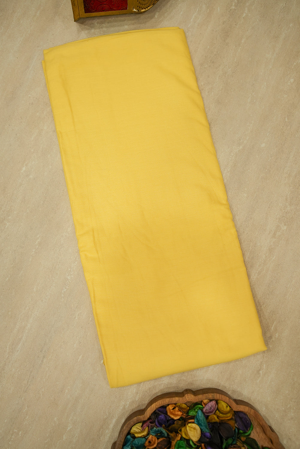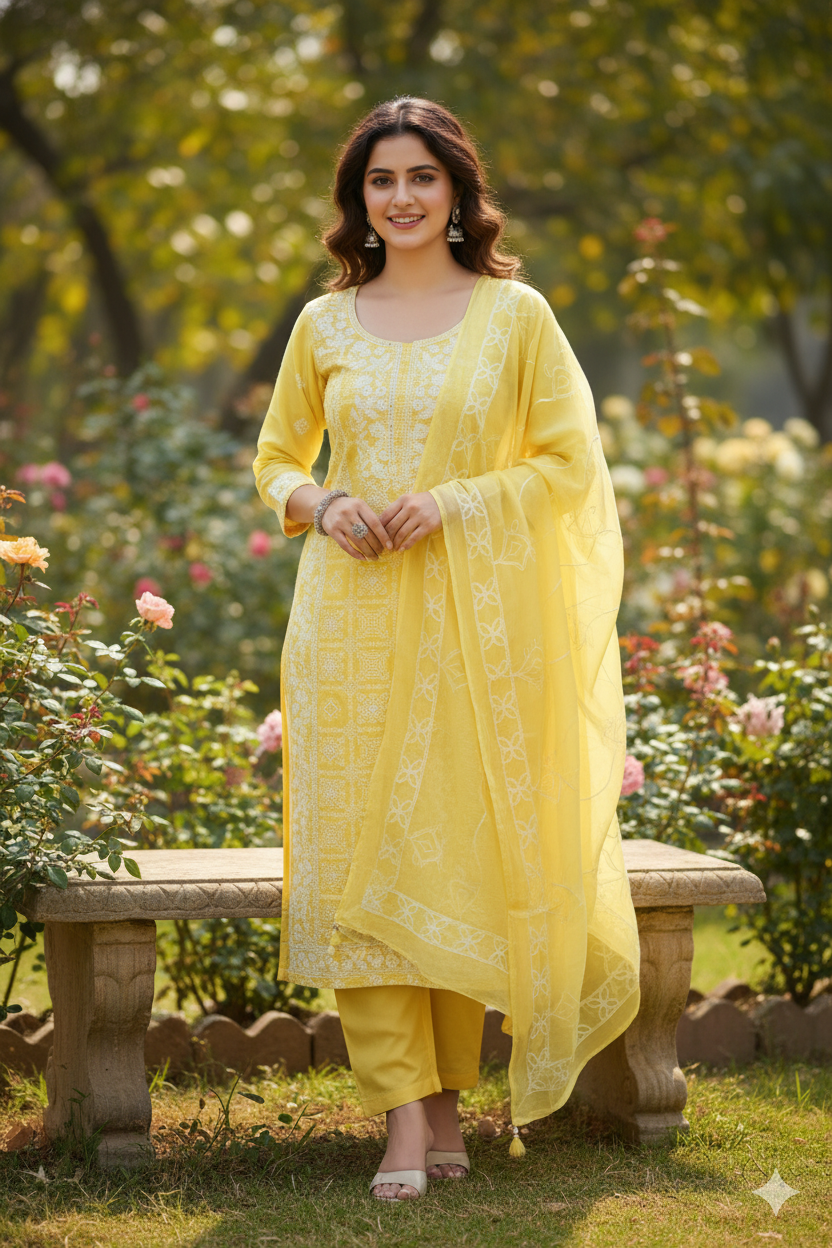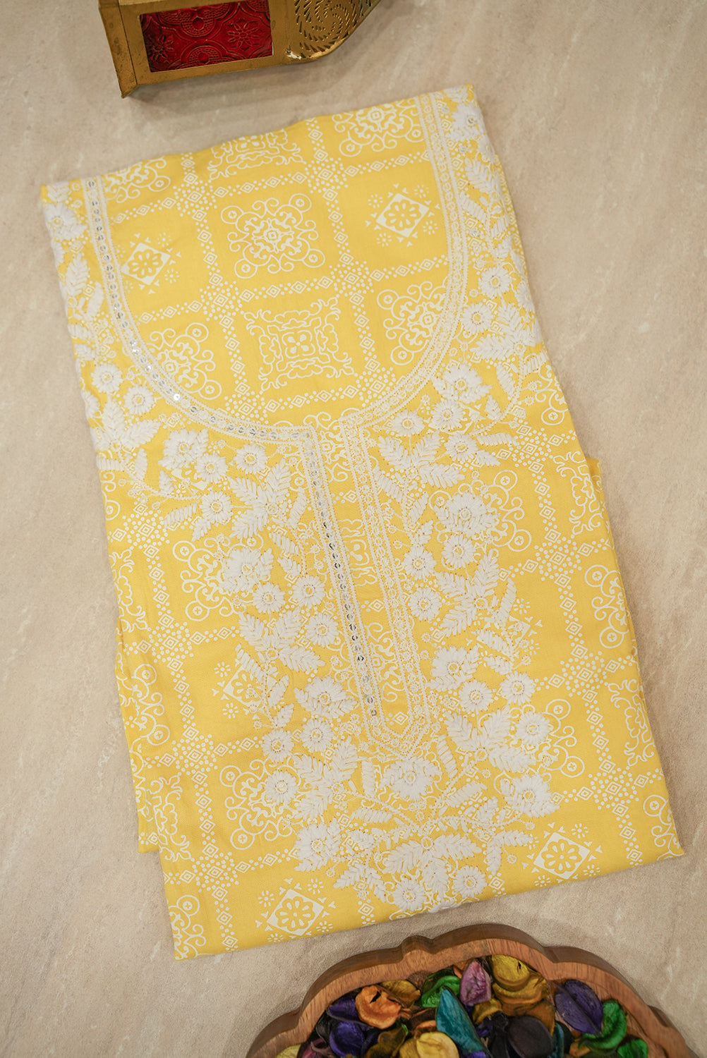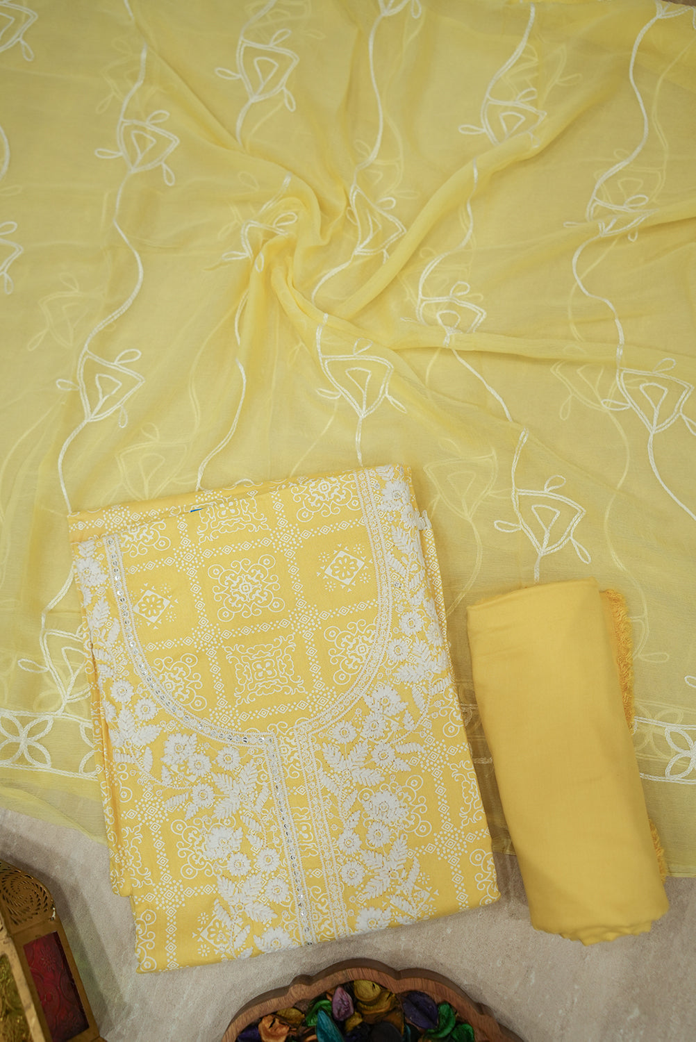 This unstitched three-piece salwar suit set radiates with joyful elegance. The bright yellow kurta (top) is covered in a beautiful white geometric and floral print, reminiscent of traditional bandhani or block print patterns. The set includes a solid yellow salwar (pant) and a sheer, matching dupatta (scarf) that features delicate white chikankari embroidery. Perfect for daytime events, festive occasions, or brightening up your everyday wardrobe.