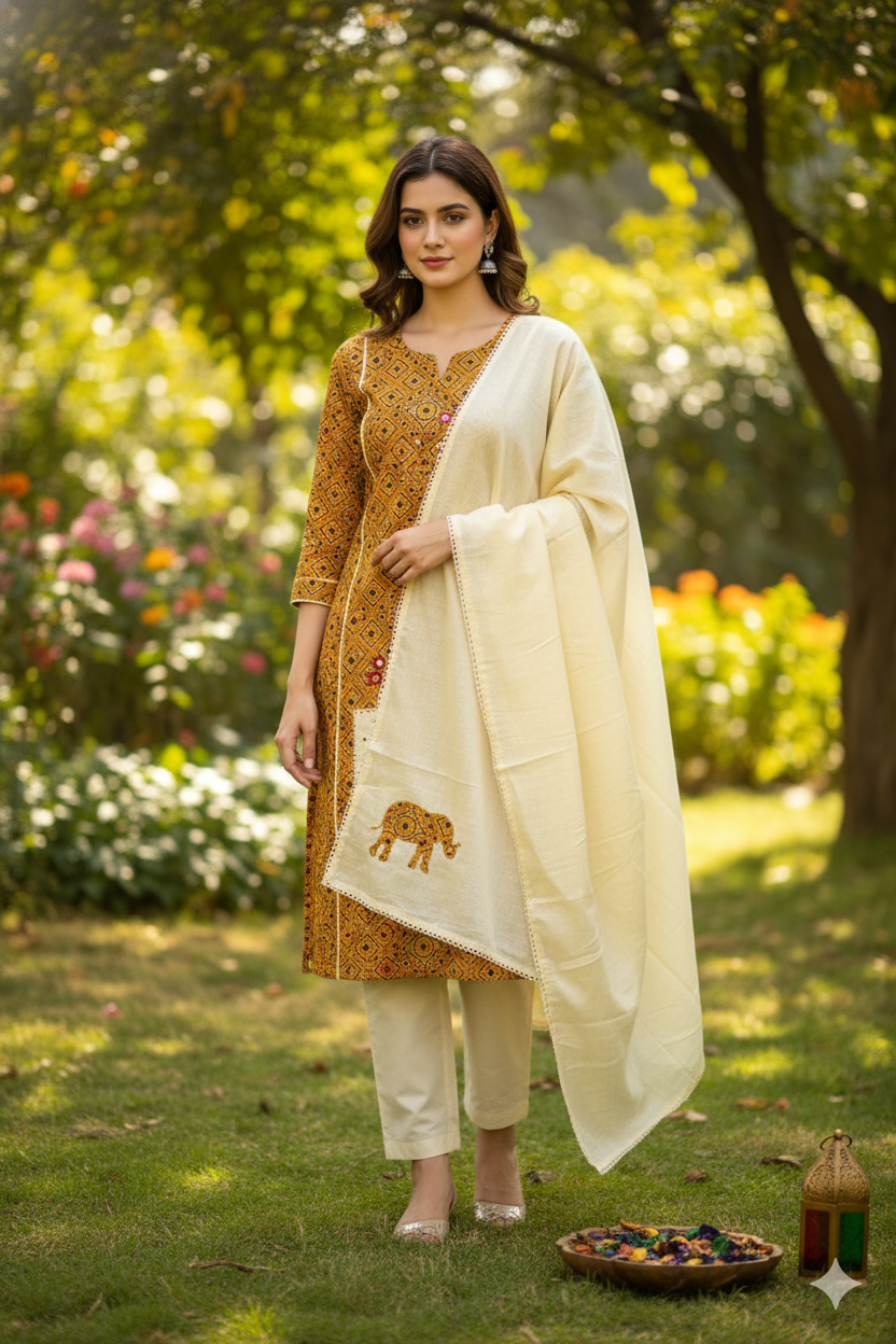 Earthy Elephant Printed Salwar Suit with Mirror Work