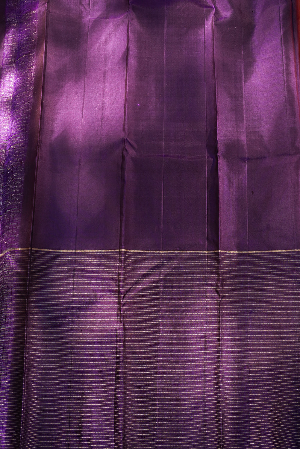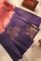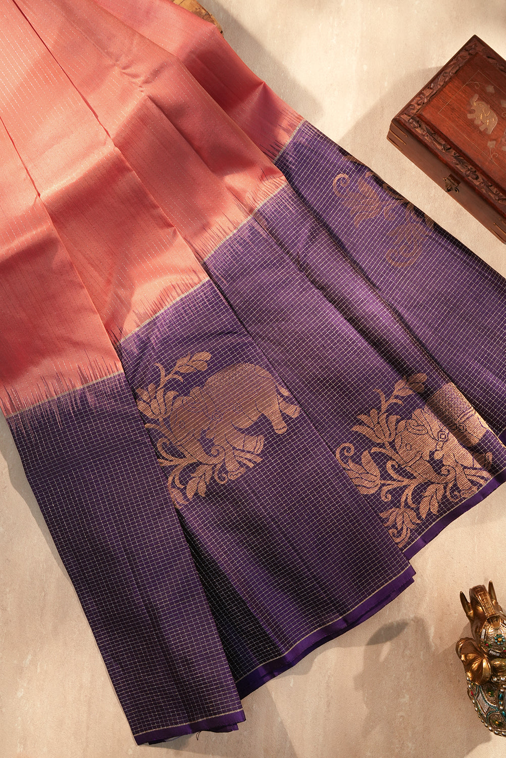 An exquisite silk drape featuring a radiant Peach/Coral Pink body. The saree is dramatically contrasted by a rich Grape Purple pallu woven with a subtle checkered pattern, which culminates in a magnificent, intricately woven gold zari Elephant motif. Perfect for weddings and traditional celebrations. Unstitched blouse attached.