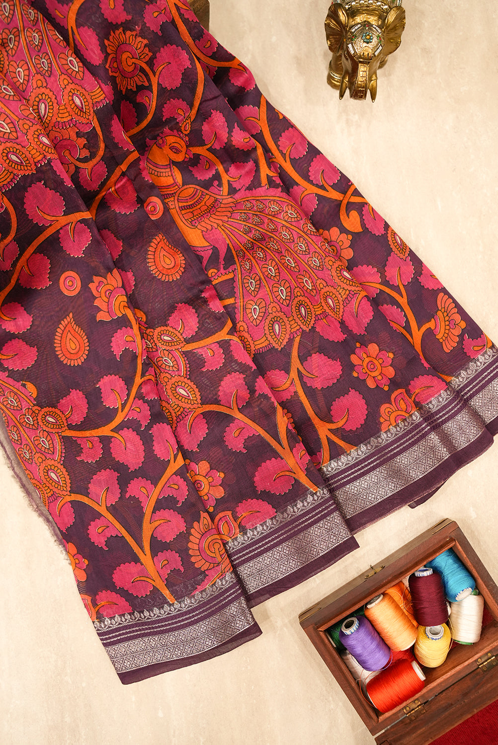 This exquisite cotton saree features a rich, purple base adorned with a captivating hand-painted peacock motif in vibrant shades of orange and pink. The intricate design, reminiscent of traditional art, is set against a backdrop of stylized floral and vine patterns. Unstitched blouse attached