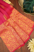 A captivating pink Kanjivaram silk saree, featuring a vibrant rose hue with a contrasting gold zari border adorned with traditional elephant motifs. The rich texture and intricate weave make it perfect for special occasions. Unstitched blouse attached.