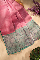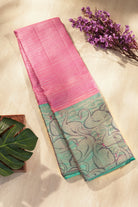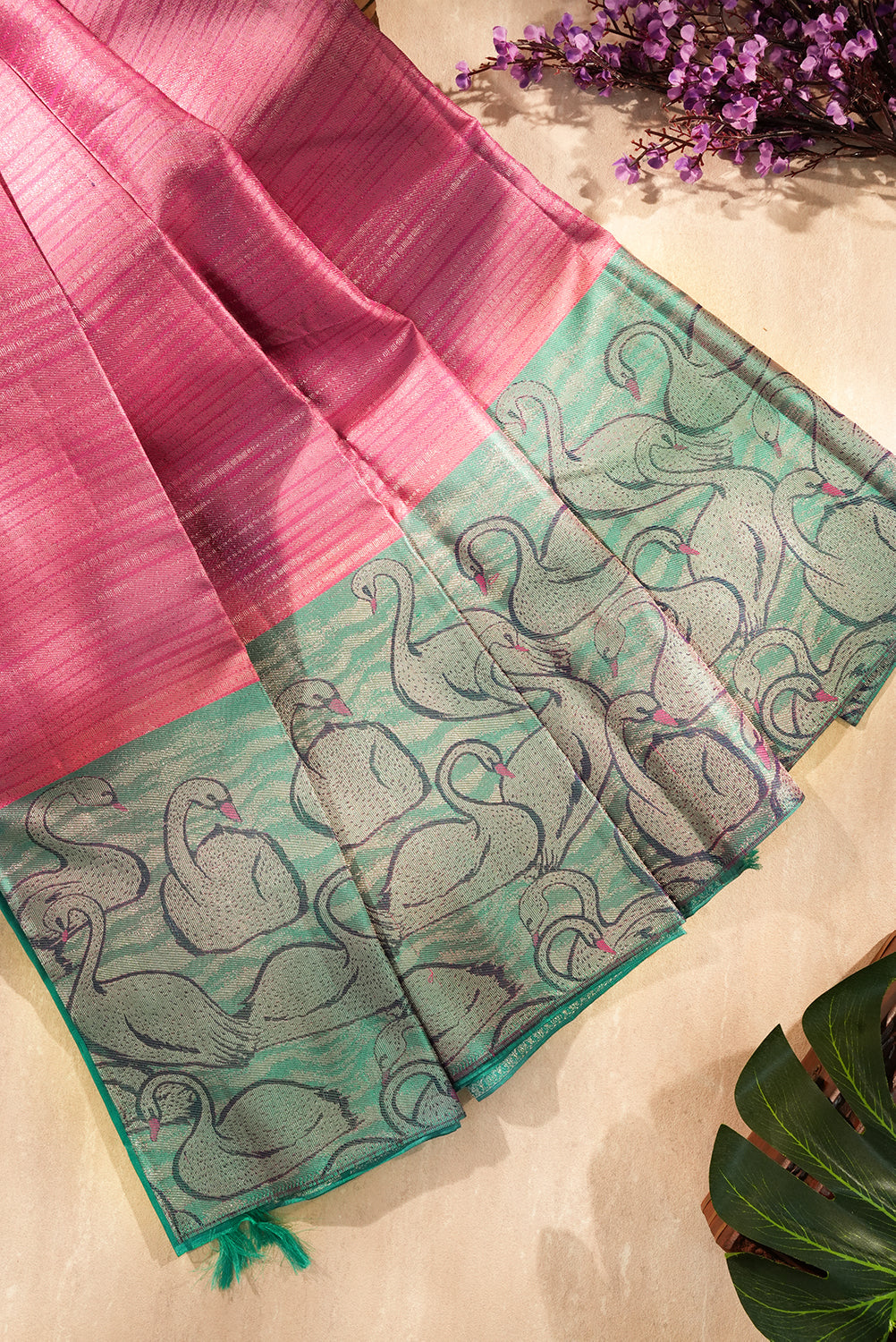 Drape yourself in the regal splendor of this exquisite Kanjivaram Silk saree. The body shimmers in a vibrant Rani Pink with a delicate woven texture. The contrasting pallu and border are a striking Aqua Blue/Mint Green hue, richly woven with a dense Brocade of graceful Hamsa (Swan) motifs in intricate silver or light gold zari. This piece is a masterpiece, blending a classic, bold color with a stunning mythological design, perfect for weddings and temple ceremonies. Unstitched blouse attached.