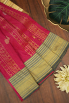This beautiful red silk saree featuring a rich gold zari border and a contrasting pallu, this saree is perfect for weddings, festivals, and special occasions. Unstitched blouse attached .