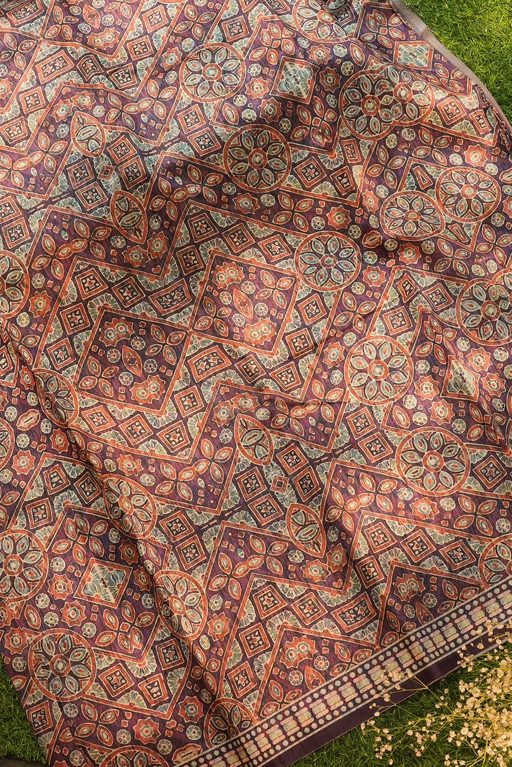 Antique Plum & Ochre Geometric Printed Tussar Silk Saree